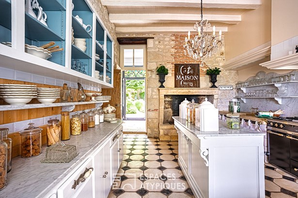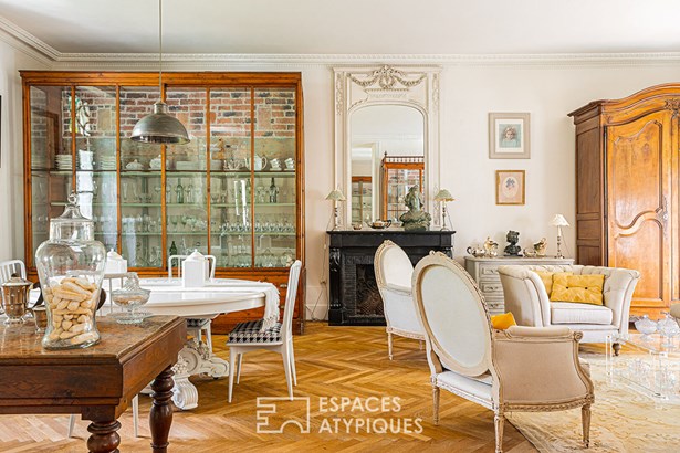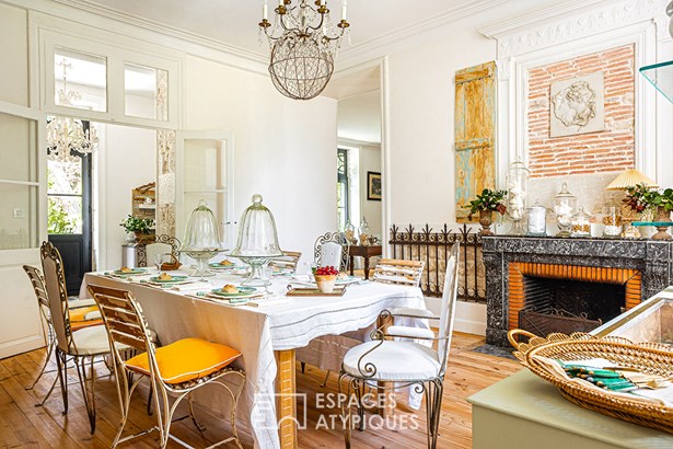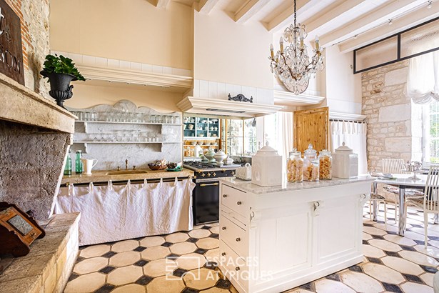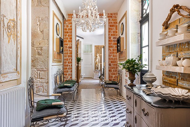 Accessible from the terrace, the entrance offers a unique view of the design of the place. A row leading to the living rooms features stone, cement tiles, and in the distance, parquet flooring laid in a herringbone pattern. For the walls, a rare and clever mix of freestone and period bricks arouses an appreciable curiosity that invites you to discover this beautiful residence. The kitchen has retained its beams and its imposing fireplace. They are accompanied by a magnificent piano and a stone sink. The dining room, meanwhile, displays its more bourgeois style with moldings and a marble-clad fireplace.