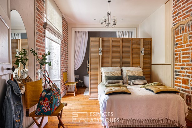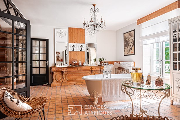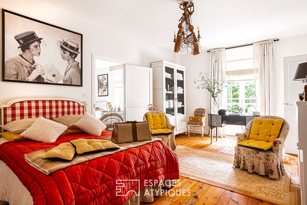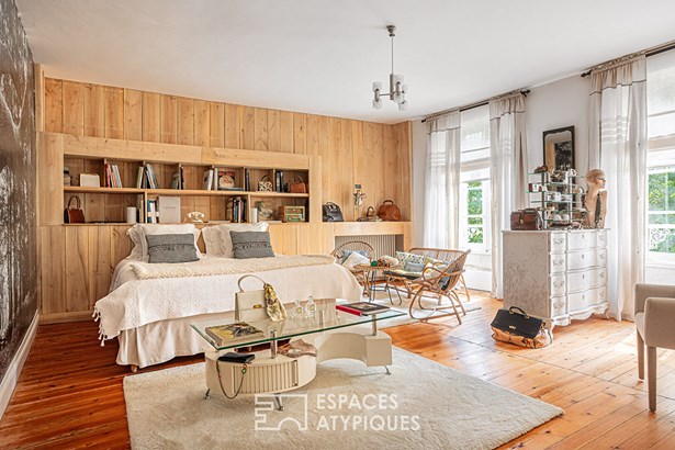 Before leading to the upper floor of the house, the splendid stone staircase covered in wood opens onto the linen room. Once on the landing, a first bedroom is now converted into an office enjoying a view of the garden, as well as the river at the front. Just like the ground floor, a wide hallway furnished with sofas and chests of drawers leads to the other rooms. The second bedroom offers a very beautiful volume with direct access to the large bathroom.