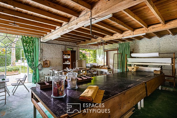The ground floor is converted into a sewing workshop, the upper floor into storage. A former aviary with interesting volumes offers great development potential.
