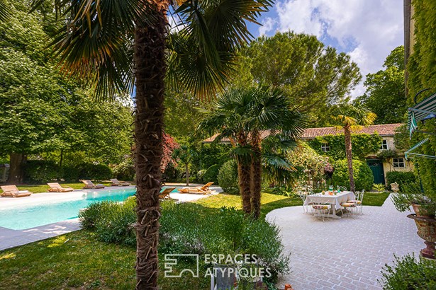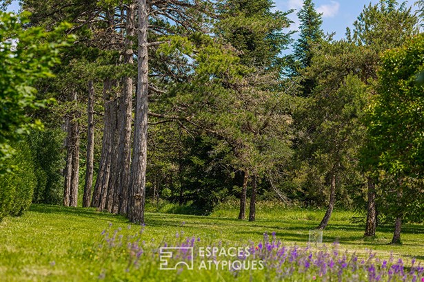 This facade is guarded by a remarkable cylindrical dovecote surrounded by Virginia creeper, as well as a high stone wall sheltering the door to the garden of the house. Once the imposing wooden door is pushed open, a true bucolic paradise enclosed by high stone walls and various period outbuildings is revealed. The vegetation, the swimming pool, and the buildings are in perfect harmony. This delightful spectacle gives a strong feeling of tranquility and happiness.