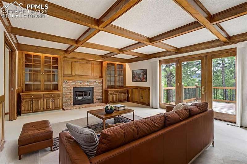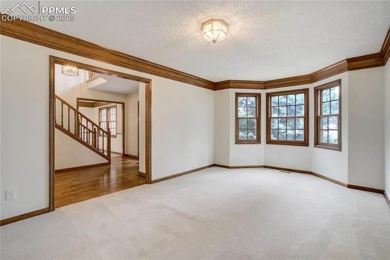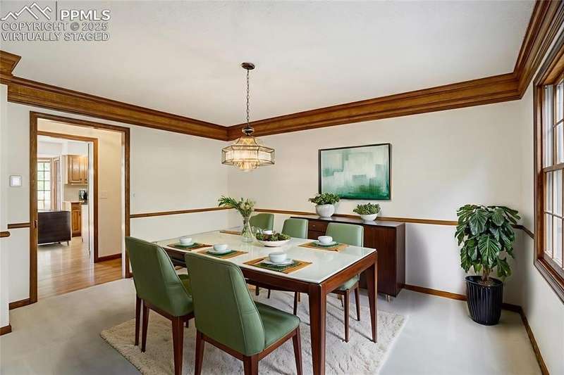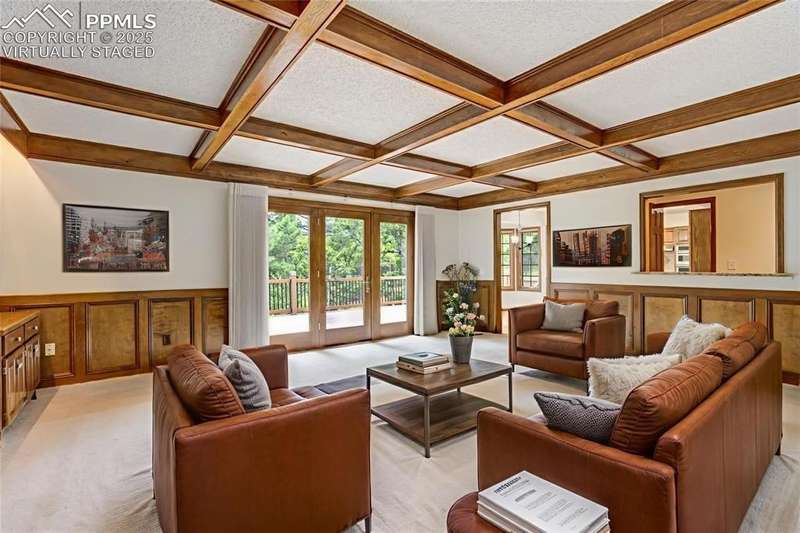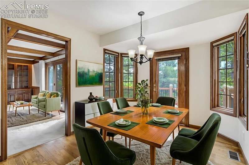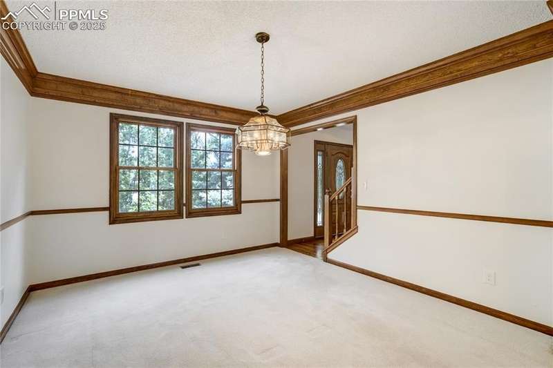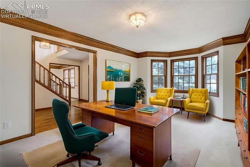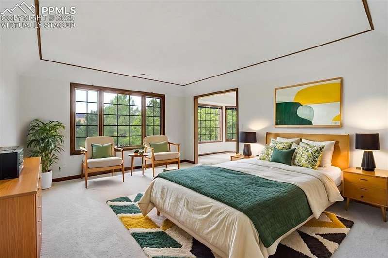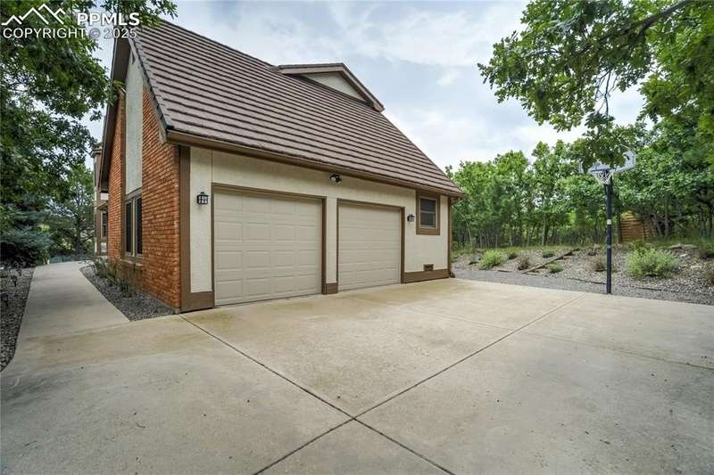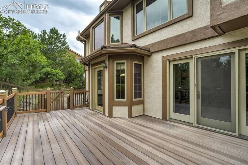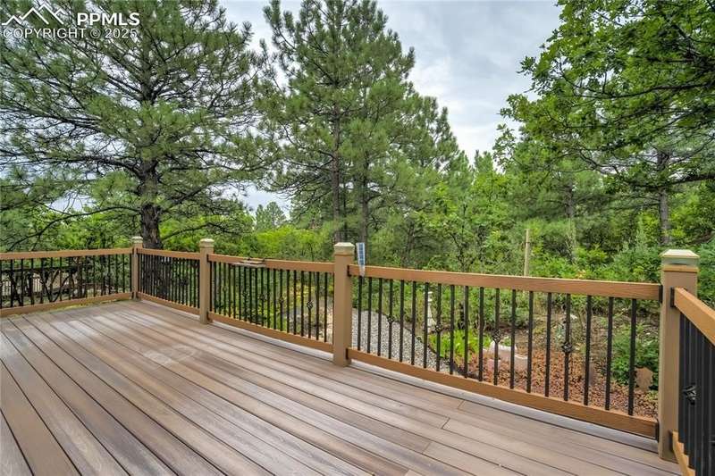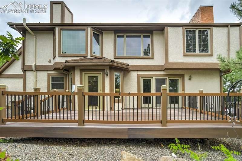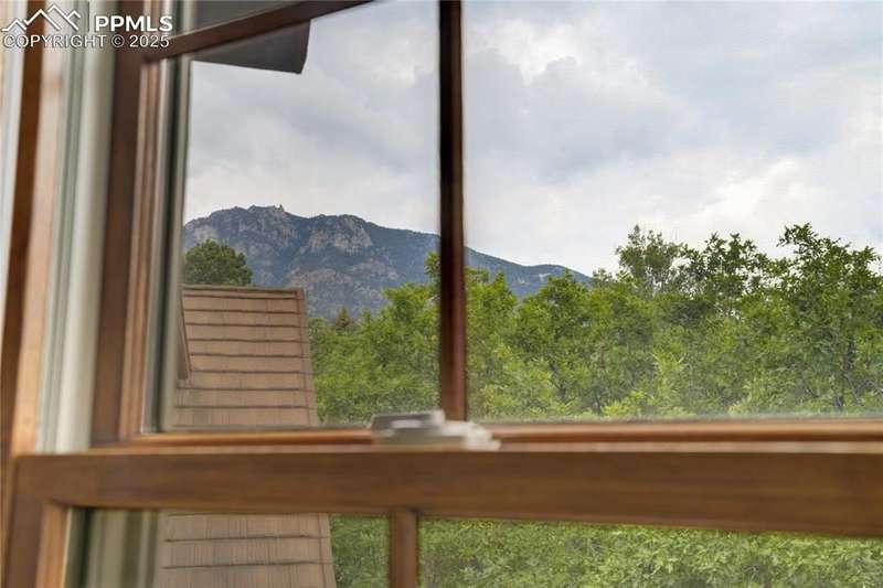 Set in the Broadmoor Bluffs neighborhood near D-12 schools, this home combines mountain & city views w/ a private, nearly half-acre lot close to parks, trails, shopping & military bases. A covered entry opens to solid oak hardwd flrs & a formal living rm framed by a bay window, crown molding, & views of the landscape. From here, the layout flows into the great rm where craftsmanship stands out, beamed ceiling, wainscoting paneling, built-ins, FP, & a wall of windows w/ walk-out access. An integrated bar w/ sink, granite counters & storage enhances the space while keeping everything tucked neatly away. The adj gourmet kitchen offers an eating nook surrounded by windows & deck access, plus hardwd flr, center island, granite countertops, updated lighting, tile backsplash,SS appliances incl range-top & GE Advantium wifi enabled wall oven, pantry, & built-in work area. A formal dining room connects easily, designed w/ crown molding & chair rail. Completing the main lvl is a half bath & a laundry room w/ sink, cabinets & window. Upstairs, the primary suite features a tray ceiling, sitting area w/ wd-burning FP, & large windows. The adj 5-pc bath has vaulted ceilings, soaking tub, glass shower & tile flooring, plus a massive walk-in closet w/ custom shelving & bonus room. Three additional bedrooms share the upper level each spacious w/ large closets & new carpet throughout. One bedroom captures mountain views, while all share easy access to a hall bath w/ tiled surround.The finished bsmnt expands the living space w/ a rec room anchored by a FP at one end & open space at the other, plus a bedroom & bath nearby. storage room w/ built-in shelving. Outdoors, a composite deck w/ wrought-iron railing overlooks the xeriscaped backyard, complete w/ fenced garden space & privacy from mature trees. The lot feels secluded while still connected to every convenience. Add highlights incl central A/C, HE furnace, metal tile roof, brick & stucco ext, oversized 2-car garage.
