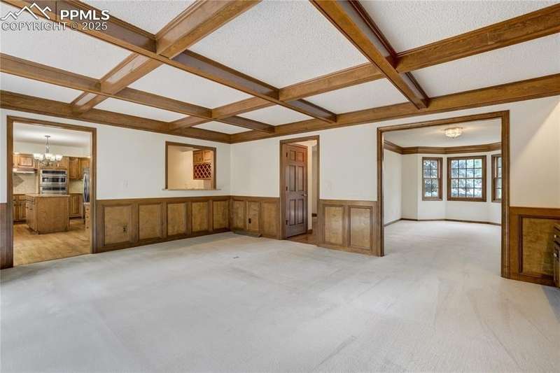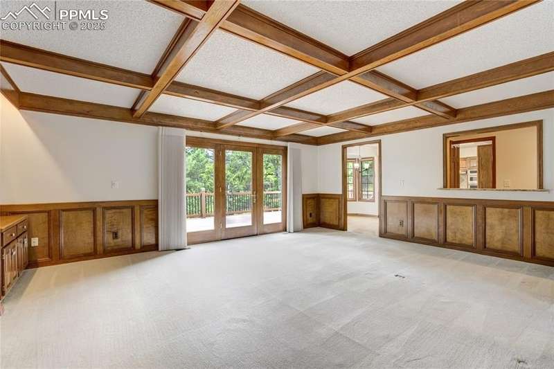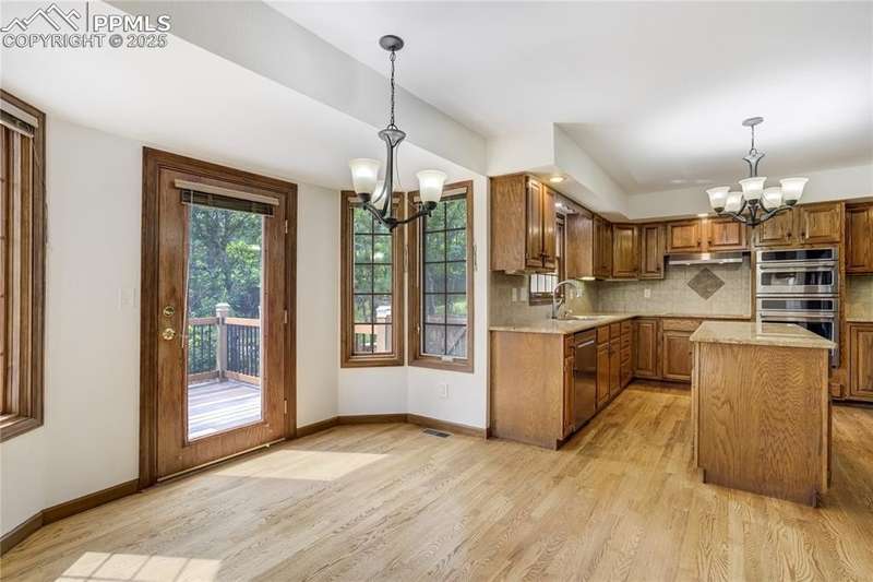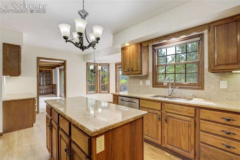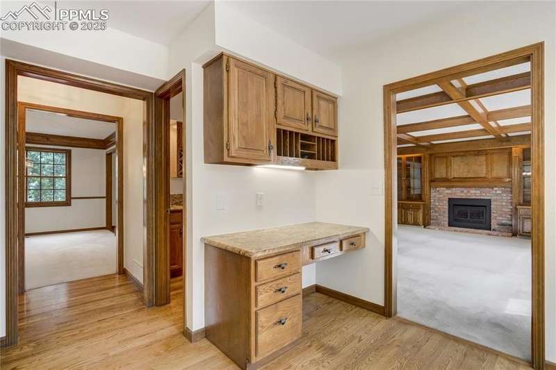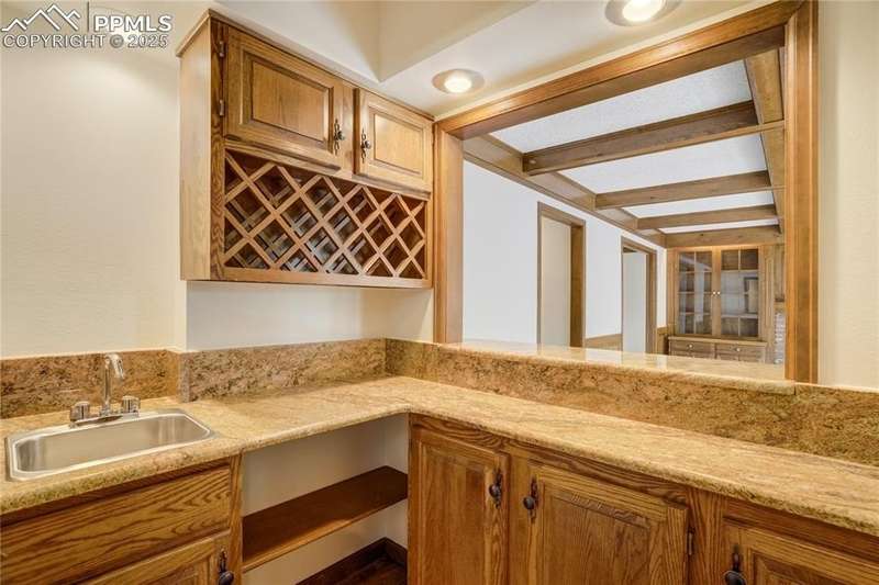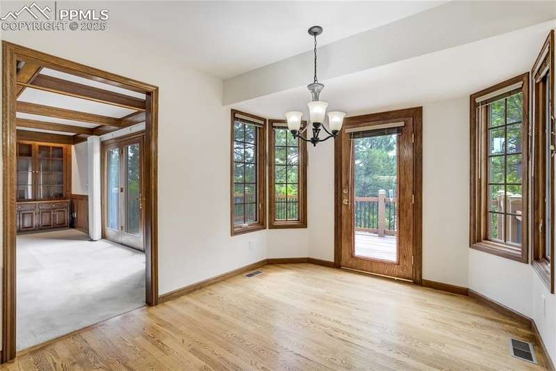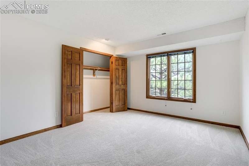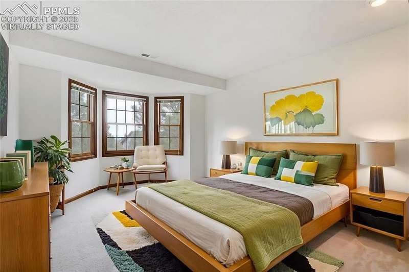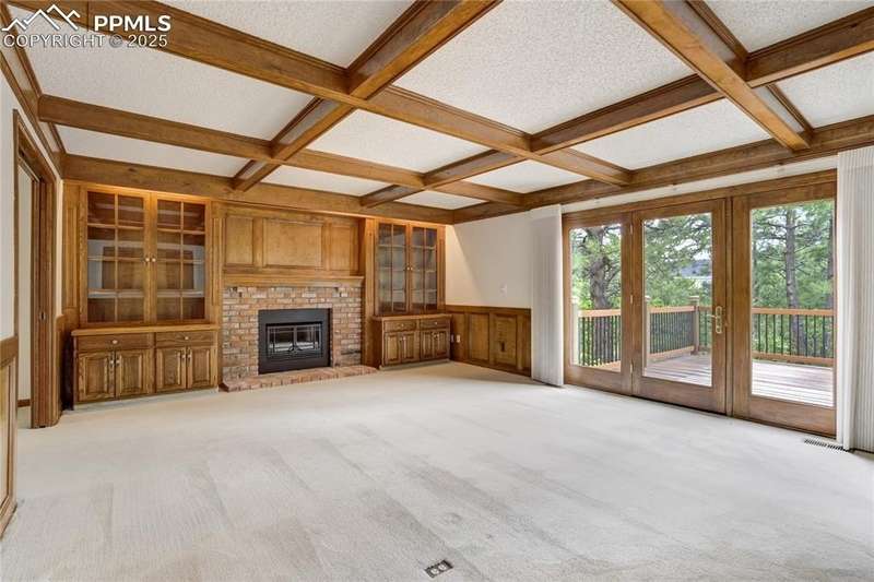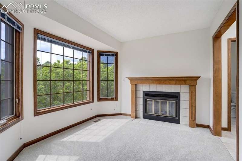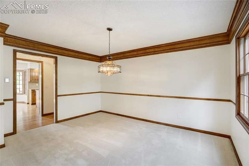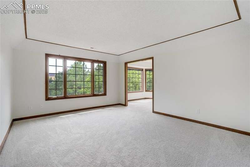 Set in the Broadmoor Bluffs neighborhood near D-12 schools, this home combines mountain & city views w/ a private, nearly half-acre lot close to parks, trails, shopping & military bases. A covered entry opens to solid oak hardwd flrs & a formal living rm framed by a bay window, crown molding, & views of the landscape. From here, the layout flows into the great rm where craftsmanship stands out, beamed ceiling, wainscoting paneling, built-ins, FP, & a wall of windows w/ walk-out access. An integrated bar w/ sink, granite counters & storage enhances the space while keeping everything tucked neatly away. The adj gourmet kitchen offers an eating nook surrounded by windows & deck access, plus hardwd flr, center island, granite countertops, updated lighting, tile backsplash,SS appliances incl range-top & GE Advantium wifi enabled wall oven, pantry, & built-in work area. A formal dining room connects easily, designed w/ crown molding & chair rail. Completing the main lvl is a half bath & a laundry room w/ sink, cabinets & window. Upstairs, the primary suite features a tray ceiling, sitting area w/ wd-burning FP, & large windows. The adj 5-pc bath has vaulted ceilings, soaking tub, glass shower & tile flooring, plus a massive walk-in closet w/ custom shelving & bonus room. Three additional bedrooms share the upper level each spacious w/ large closets & new carpet throughout. One bedroom captures mountain views, while all share easy access to a hall bath w/ tiled surround.The finished bsmnt expands the living space w/ a rec room anchored by a FP at one end & open space at the other, plus a bedroom & bath nearby. storage room w/ built-in shelving. Outdoors, a composite deck w/ wrought-iron railing overlooks the xeriscaped backyard, complete w/ fenced garden space & privacy from mature trees. The lot feels secluded while still connected to every convenience. Add highlights incl central A/C, HE furnace, metal tile roof, brick & stucco ext, oversized 2-car garage.