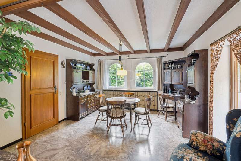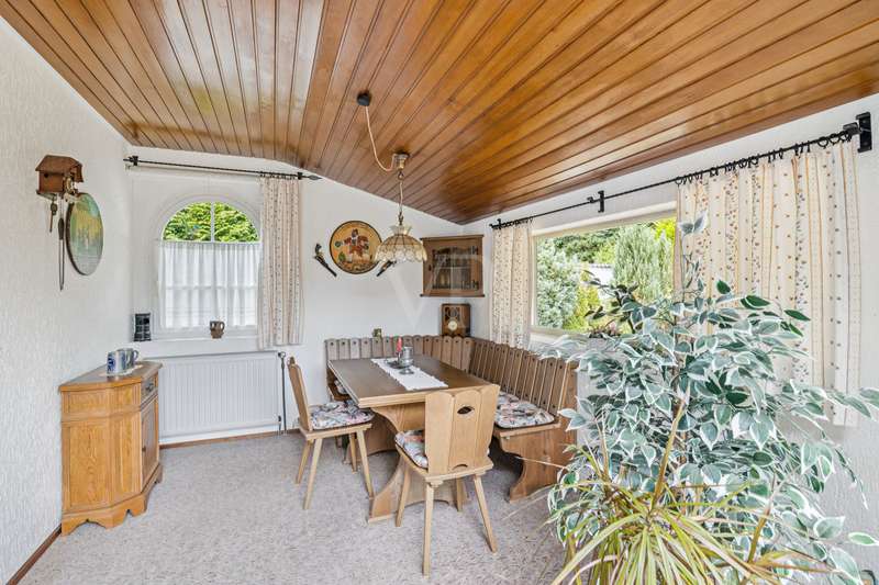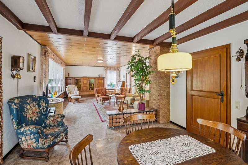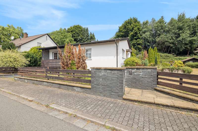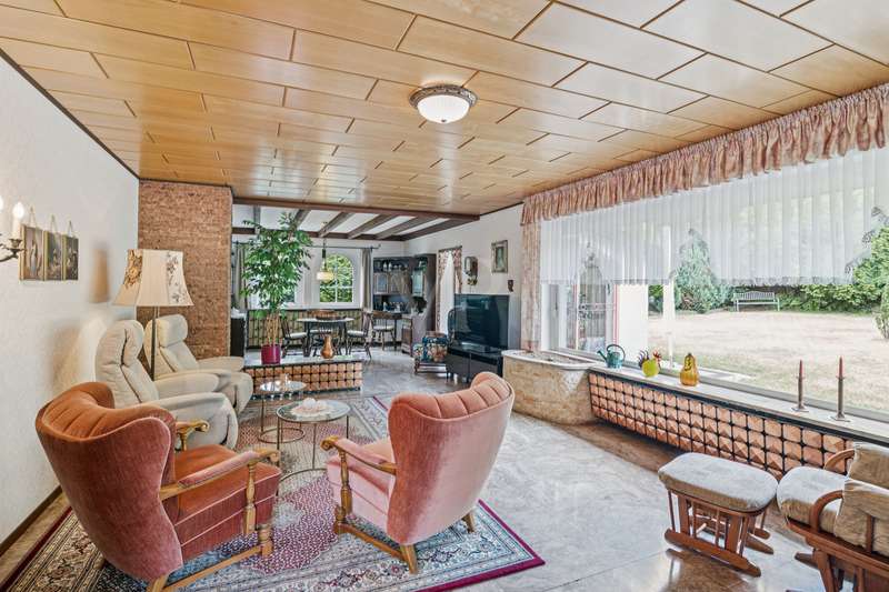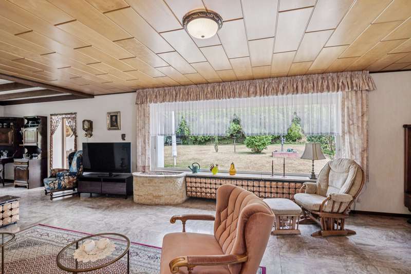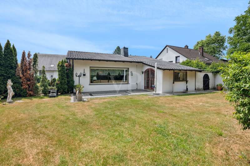 For sale is a well-kept bungalow, built in 1968, which is situated on a spacious, very beautiful plot of approx. 1445 m². With a living area of around 125 m², this house offers enough space for a family or couples who value living on one level. The pleasant and well thought-out room layout, as well as the timeless architecture, offer many creative possibilities for redesign. The property is in a well-kept condition and has been continuously maintained over the years. It has a full basement and also offers two converted cellar rooms, which can optionally be used as office space. The house comprises a total of 5 rooms, including 2 bedrooms, which can be flexibly arranged. The master bedroom has direct access to the loggia. There is also a large, bright bathroom with shower on this living level. A separate guest WC in the entrance area enhances the living comfort and is ideal for visitors. A particular highlight is the bright, light-flooded and inviting living and dining area with direct access to the terrace, where you can spend relaxing hours outdoors. The generously proportioned kitchen is equipped with a fitted kitchen and offers plenty of space. Adjacent to the dining area is another room that can be used as a flexible room or could optionally be converted into a conservatory. The flooring in the living areas consists of an attractive mix of marble tiles, natural stone and carpeting, which lends the rooms a simple elegance. It is not only the interior of the house that offers comfort, but also the outside area. The spacious property impresses with its charming, rural character and idyllic ambience. It also allows for a variety of design options, whether for gardening activities or the construction of further amenities. The property also has a garden shed measuring approx. 10 m², which offers additional storage space for garden tools. Equipped with an electricity connection, it is ideal for outdoor hobbies or parties. The roof of the bungalow was completely renovated in 2004 and the central heating, a modern Viessmann gas heating system, was renewed in 2023. These measures ensure efficient energy consumption and pleasant heat distribution throughout the house. The double garage with automatic door offers enough space for two vehicles and creates additional storage space. The location of this property combines the best of both worlds: the tranquillity of a natural environment and the proximity to all necessary everyday amenities. Schools, shopping facilities and public transport links are just a few minutes away by car, making this location particularly attractive for families. The quality of the bungalow's fixtures and fittings can be rated as normal, yet it offers a solid basis for living thanks to its well-kept construction and the modernizations that have been carried out. The ideal floor plan and the advantageous room layout make this house an option worth considering for anyone looking for a property with substance and potential. Interested parties who value a bungalow with plenty of space on a generous plot are invited to discover this pleasant home. Do not hesitate to contact us to arrange a viewing and see the benefits of this property for yourself. We look forward to hearing from you! No energy certificate is available at the time of advertising. However, this is currently being prepared and will be issued shortly.