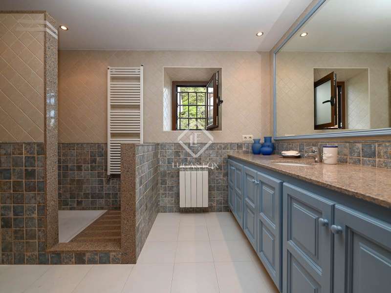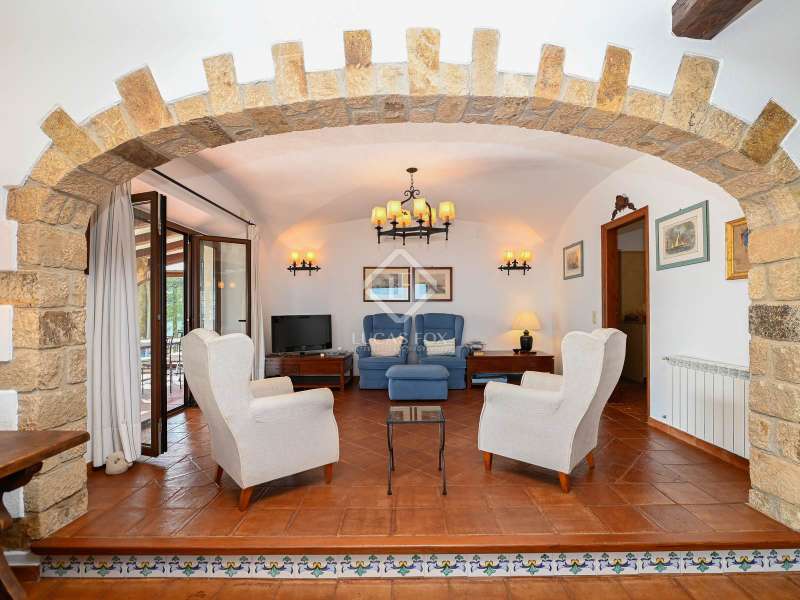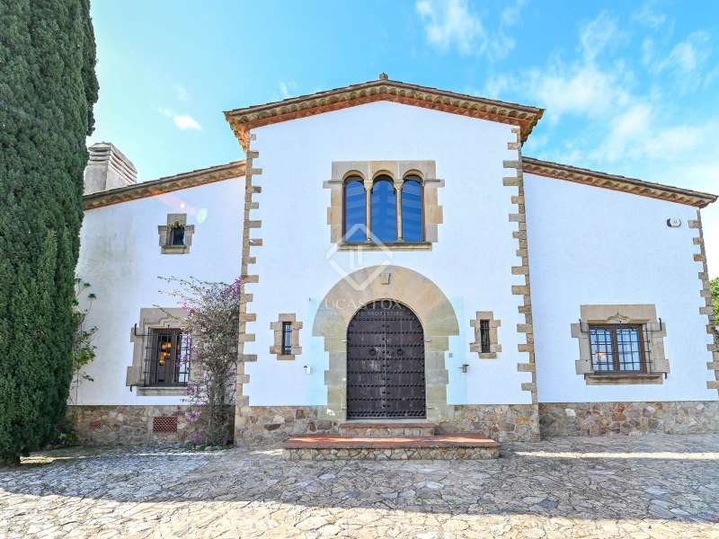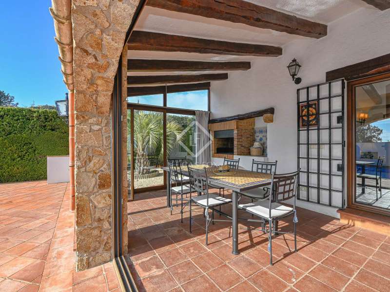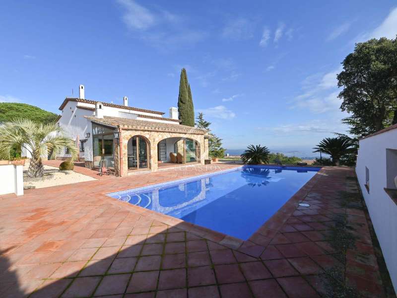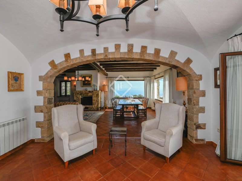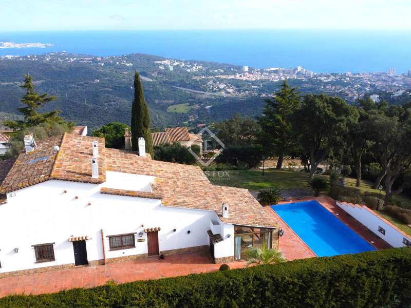 Spectacular, majestic villa with a rustic design and beautiful sea and mountain views, located in the prestigious Mas Nou development of Platja d'Aro. It is just a 5-minute car from the renowned Costa Brava resorts of Platja d'Aro and 10 minutes from Palamós, S'Agaró, and Sant Feliu de Guíxols, known for their beautiful beaches and coves. Golf enthusiasts will enjoy the nearby Club Golf d'Aro-Mas Nou. This stunning villa, originally built in 1983, remains perfect condition and offers spectacular panoramic views of the sea and mountains from every room. The ground floor features a spacious entrance hall, a large living room with a fireplace, a dining room with sea views, and a summer dining room with a barbecue, which offers access to the pool and garden. The fully equipped kitchen opens onto a large terrace and the garden. The bedroom area on this floor includes two double bedrooms with built-in wardrobes, a full bathroom , and a laundry room. On the upper floor , there is a spacious living room and office with sea views, the main bedroom with a private terrace, dressing room and full bathroom , as well as another double bedroom with a private bathroom. The property includes a large basement with a wine cellar and fireplace, opening onto the garden. The exterior area features a heated pool with a hydromassage system, a terraced garden of approximately 1300 m², and a beautiful wooded area, all with automatic irrigation. Additional amenities include a double garage, a laundry room and storage room, a well, a 4,500-liter water reserve tank, gas heating with a private propane tank, and air conditioning. Contact us for more information.