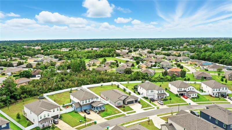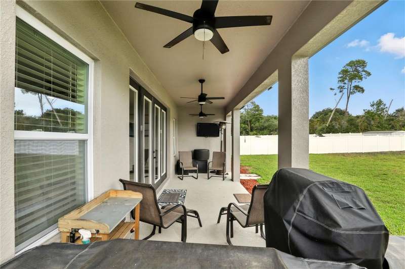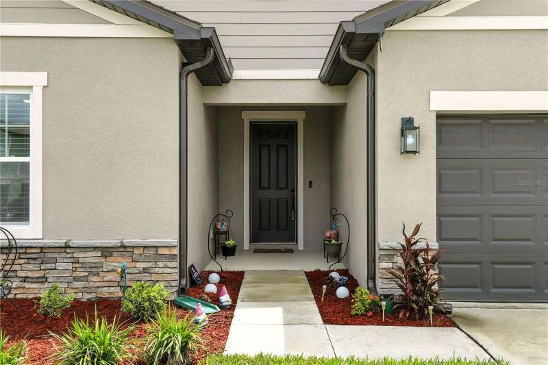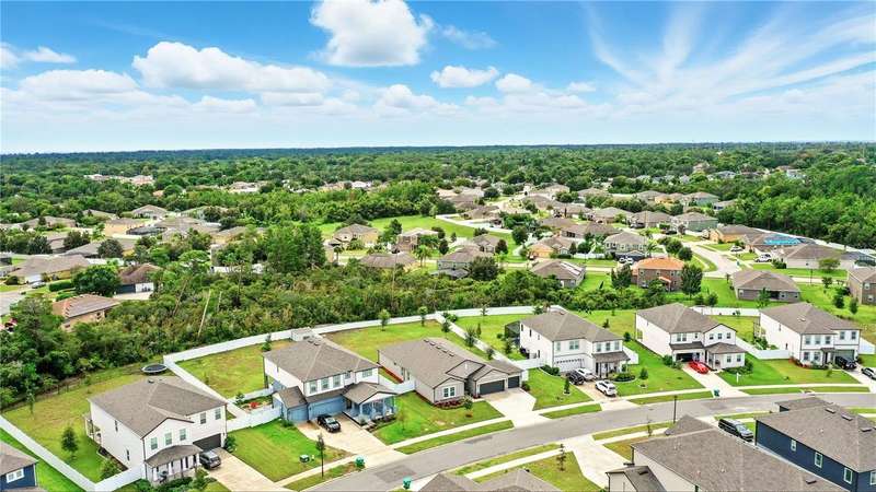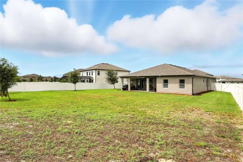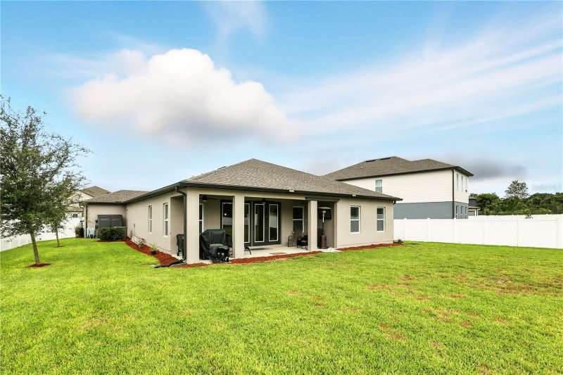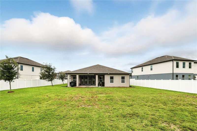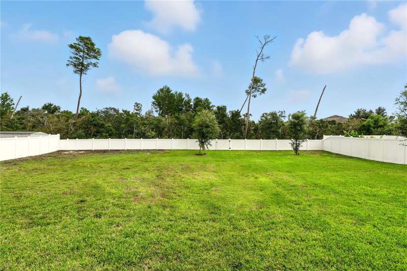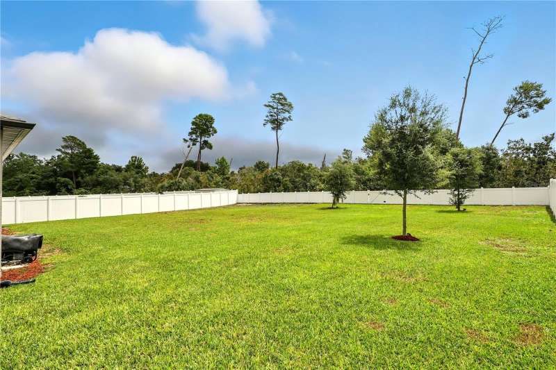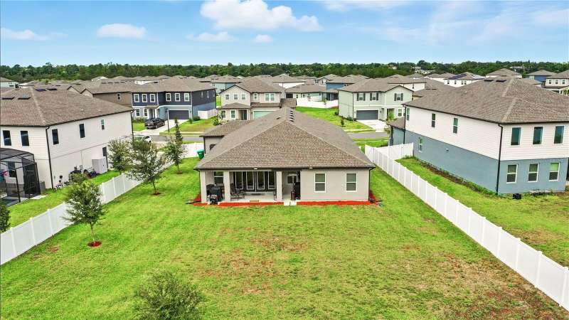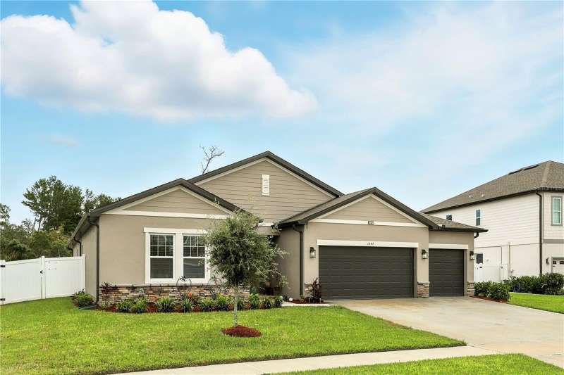 Welcome to 1647 Meadowlark Lane – Built in 2023, this beautifully designed 4-bedroom, 3-bath, 3-car garage home offering 2,691 sq. ft. of modern living space set on an oversized .37-acre lot. From the moment you arrive, the home’s stone-accented exterior, maturing landscaping with auto irrigation system, long lasting low maintenance vinyl fencing, and three car wide driveway set the tone for both elegance, convenience and longevity. Step inside to a welcoming foyer, tall ceilings with views straight through to the backyard, immediately showcasing the open and airy design, the design is a thoughtful split floor plan providing both comfort and privacy for residents and guests. Upon entry, to the left of the foyer are two spacious guest bedrooms with a full bath. To the right, access to the garage, inside laundry room and junior suite feature ensuite bath with quartz countertop and shower tub combo creating a perfect private space for guests. Proceeding to the heart of the home, the expansive great room and chef’s style kitchen create the perfect gathering space. The kitchen features an oversized 12-foot island with quartz countertops, white shaker cabinets, stainless steel appliances, stovetop with exterior exhaust venting, and a generous walk-in pantry. An adjacent open formal dining area makes entertainment seamless, or this area can be used as a general flex space. Enjoy Florida’s indoor-outdoor lifestyle with double French doors and a wall of windows leading to a covered lanai overlooking the expansive back yard. With green space behind the property, the backyard offers coveted privacy and endless potential—whether you envision a pool, summer kitchen, or custom garden, this area is large enough for all three! The primary suite is a private retreat tucked away off the great room, featuring en-suite bath with a large, fully glassed walk-in shower with rain shower feature, large window for natural light and linin closet and dual sink vanity, the owner’s retreat also includes a large walk-in closet with custom built-ins. Additional features of this home include luxury vinyl plank flooring in the main living areas, carpeted bedrooms, ceiling fans, recessed and pendent lighting, and abundance of natural light throughout. Perfectly located, this home is within walking distance to shopping, casual dining and just minutes to I-4 for an easy commute. For recreation, you’re a short drive from world-famous Volusia County beaches, the ultimate Florida lifestyle is waiting, schedule your private showing today!