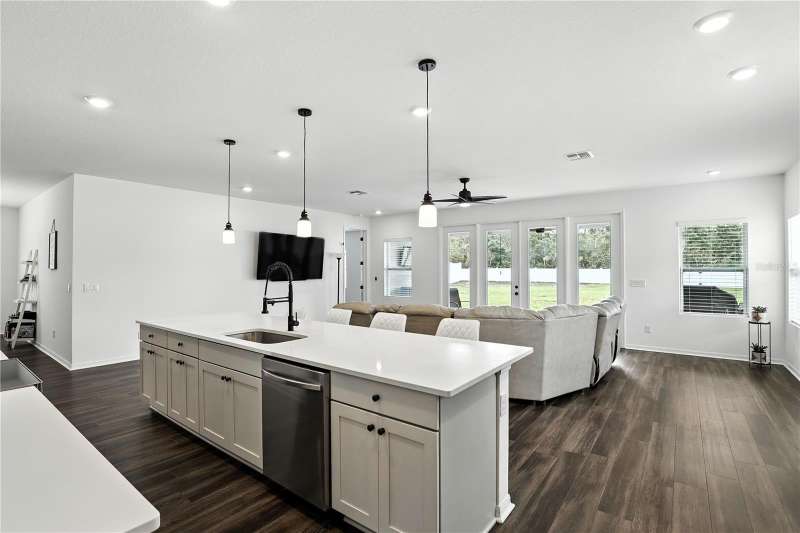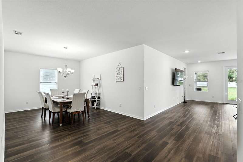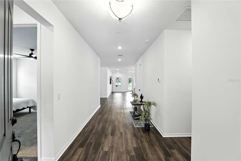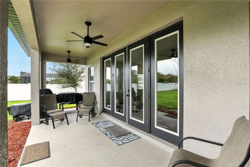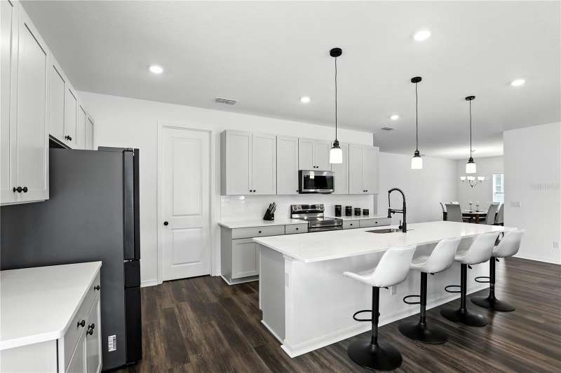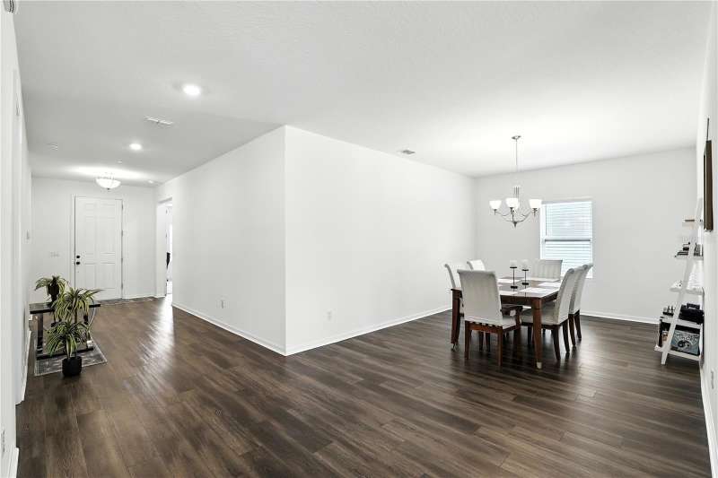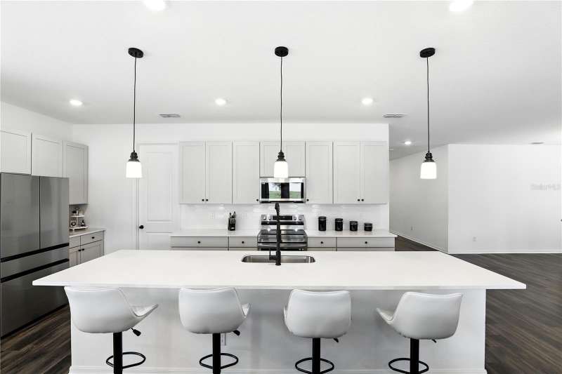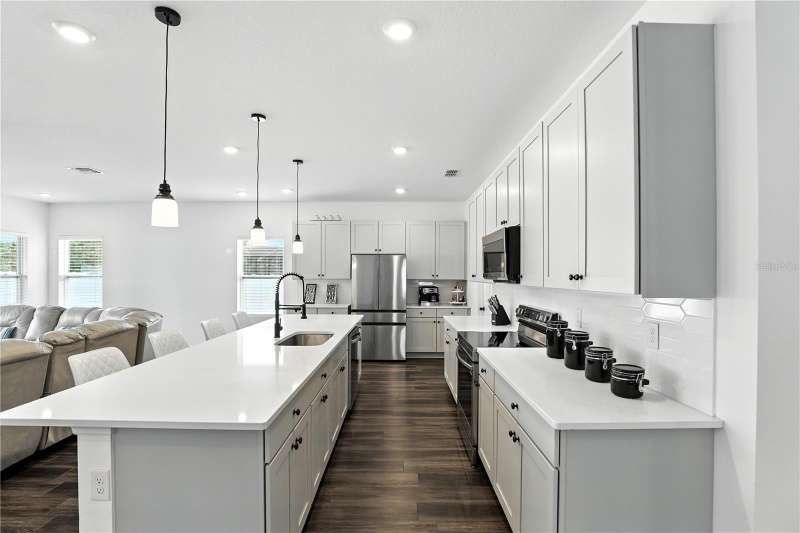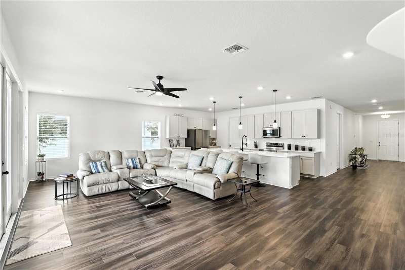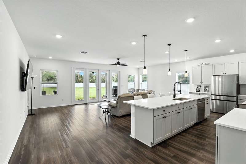 Welcome to 1647 Meadowlark Lane – Built in 2023, this beautifully designed 4-bedroom, 3-bath, 3-car garage home offering 2,691 sq. ft. of modern living space set on an oversized .37-acre lot. From the moment you arrive, the home’s stone-accented exterior, maturing landscaping with auto irrigation system, long lasting low maintenance vinyl fencing, and three car wide driveway set the tone for both elegance, convenience and longevity. Step inside to a welcoming foyer, tall ceilings with views straight through to the backyard, immediately showcasing the open and airy design, the design is a thoughtful split floor plan providing both comfort and privacy for residents and guests. Upon entry, to the left of the foyer are two spacious guest bedrooms with a full bath. To the right, access to the garage, inside laundry room and junior suite feature ensuite bath with quartz countertop and shower tub combo creating a perfect private space for guests. Proceeding to the heart of the home, the expansive great room and chef’s style kitchen create the perfect gathering space. The kitchen features an oversized 12-foot island with quartz countertops, white shaker cabinets, stainless steel appliances, stovetop with exterior exhaust venting, and a generous walk-in pantry. An adjacent open formal dining area makes entertainment seamless, or this area can be used as a general flex space. Enjoy Florida’s indoor-outdoor lifestyle with double French doors and a wall of windows leading to a covered lanai overlooking the expansive back yard. With green space behind the property, the backyard offers coveted privacy and endless potential—whether you envision a pool, summer kitchen, or custom garden, this area is large enough for all three! The primary suite is a private retreat tucked away off the great room, featuring en-suite bath with a large, fully glassed walk-in shower with rain shower feature, large window for natural light and linin closet and dual sink vanity, the owner’s retreat also includes a large walk-in closet with custom built-ins. Additional features of this home include luxury vinyl plank flooring in the main living areas, carpeted bedrooms, ceiling fans, recessed and pendent lighting, and abundance of natural light throughout. Perfectly located, this home is within walking distance to shopping, casual dining and just minutes to I-4 for an easy commute. For recreation, you’re a short drive from world-famous Volusia County beaches, the ultimate Florida lifestyle is waiting, schedule your private showing today!