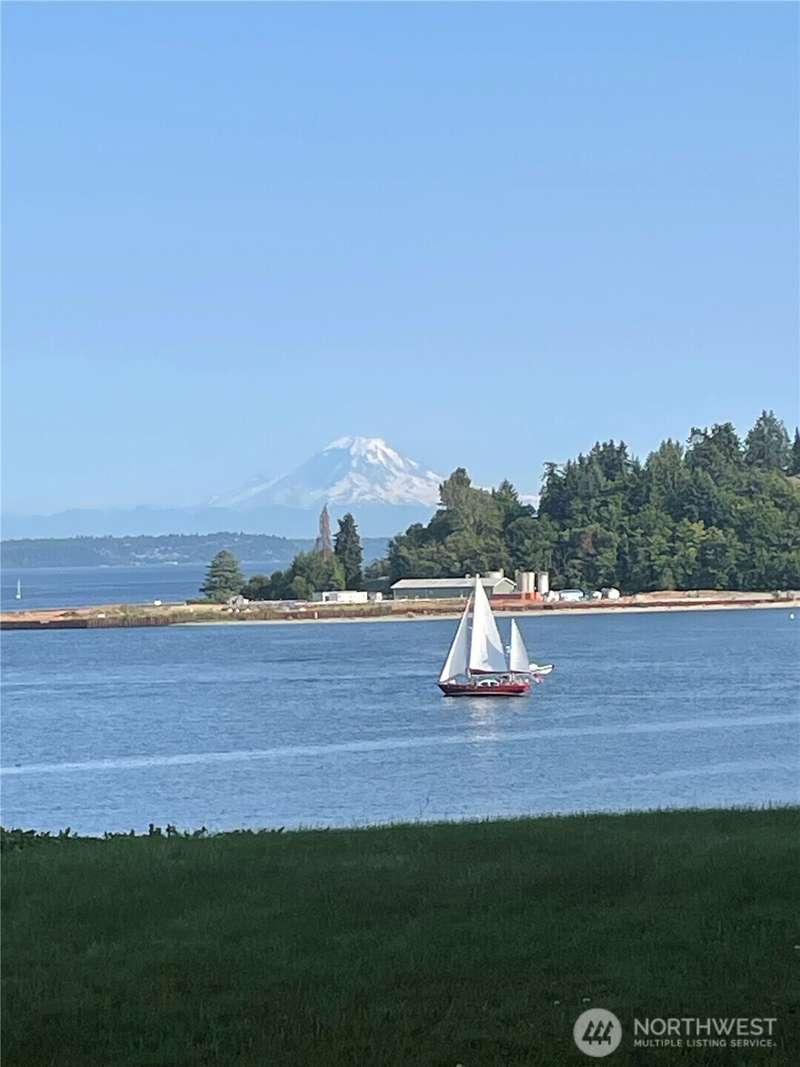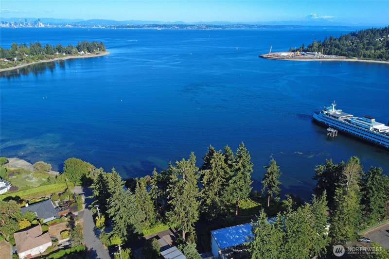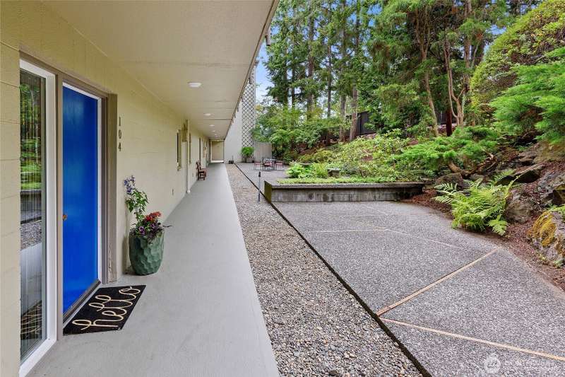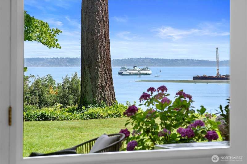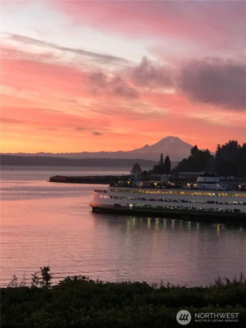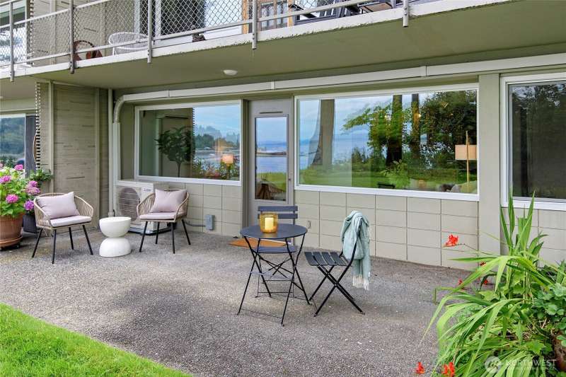 Live right on the water with spectacular views of the serene Puget Sound, majestic Mt. Rainier, Seattle, and ferries. Exciting opportunity to live in the iconic, The Bainbridge condominium building! This Garden Level home is accessible without any stairs.The large porch off living room opens to the verdant lawn common area and is perfect for savoring the views. Kitchen and bath have been luxuriously updated and hardwood floors and new carpet make this home move-in ready with two bedrooms, each with stunning views. Easy access to ferry, Winslow Way cafes, shops, restaurants and parks. Embrace the vibrant energy of in-town living while enjoying the serenity of the waterfront lifestyle - a rare combination that makes every day a vacation!