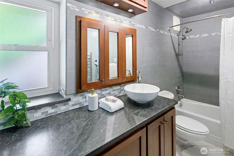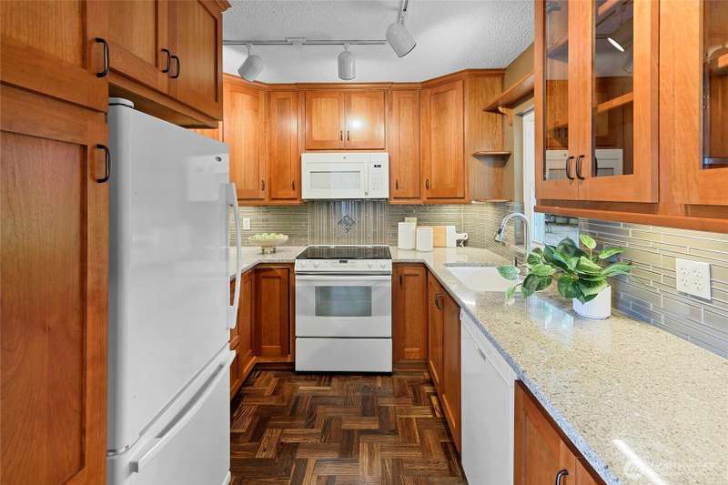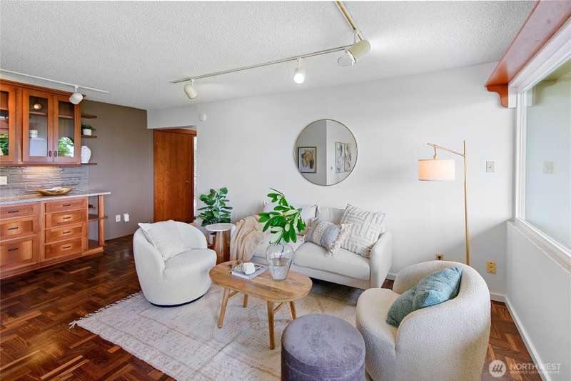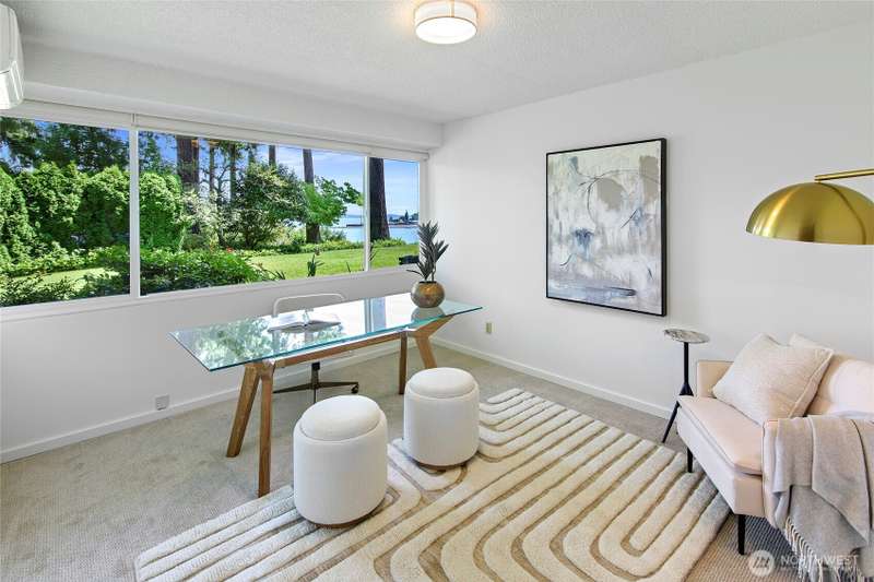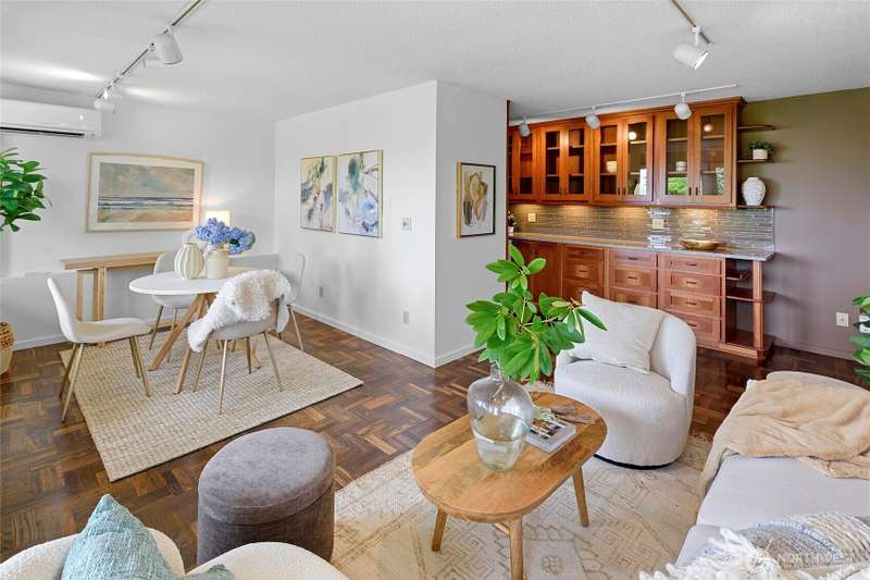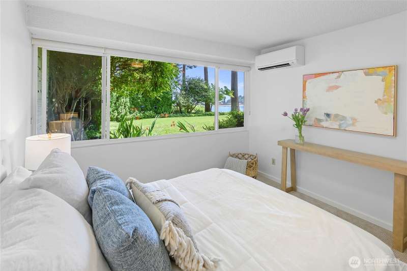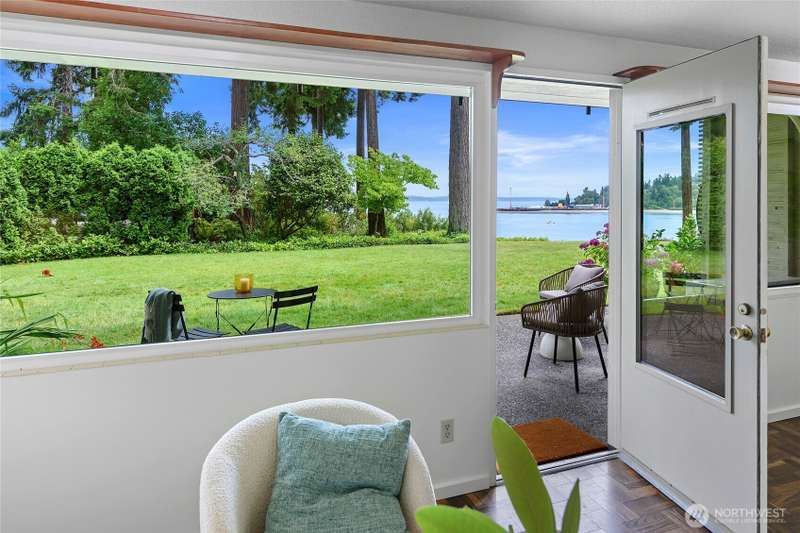 Live right on the water with spectacular views of the serene Puget Sound, majestic Mt. Rainier, Seattle, and ferries. Exciting opportunity to live in the iconic, The Bainbridge condominium building! This Garden Level home is accessible without any stairs.The large porch off living room opens to the verdant lawn common area and is perfect for savoring the views. Kitchen and bath have been luxuriously updated and hardwood floors and new carpet make this home move-in ready with two bedrooms, each with stunning views. Easy access to ferry, Winslow Way cafes, shops, restaurants and parks. Embrace the vibrant energy of in-town living while enjoying the serenity of the waterfront lifestyle - a rare combination that makes every day a vacation!