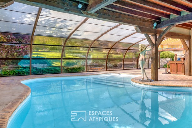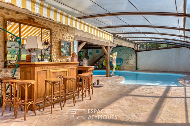 The pool house, a true living space in its own right, houses a swimming pool sheltered under a curved glass roof (part of which is removable), bordered by a bar area and extended upstairs by a games room where billiards and table football games resonate, as well as a room that can be used as an additional bedroom.