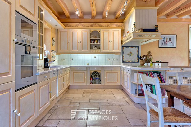 The interior of the main house opens onto a spacious entrance leading to a vast living room of nearly 60 sqm bathed in light on the right, extending its volume towards a warm kitchen of over 40 sqm, with soft tones and furniture patinated by time, as well as a utility room.
