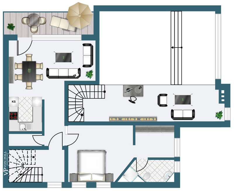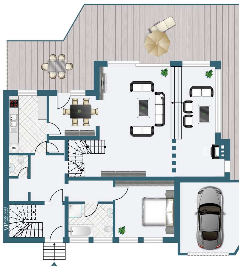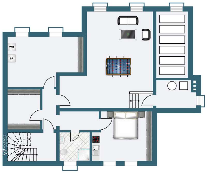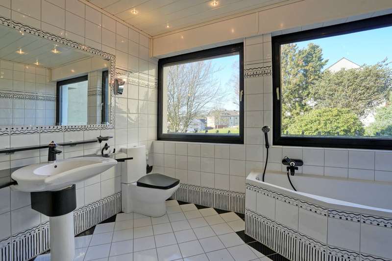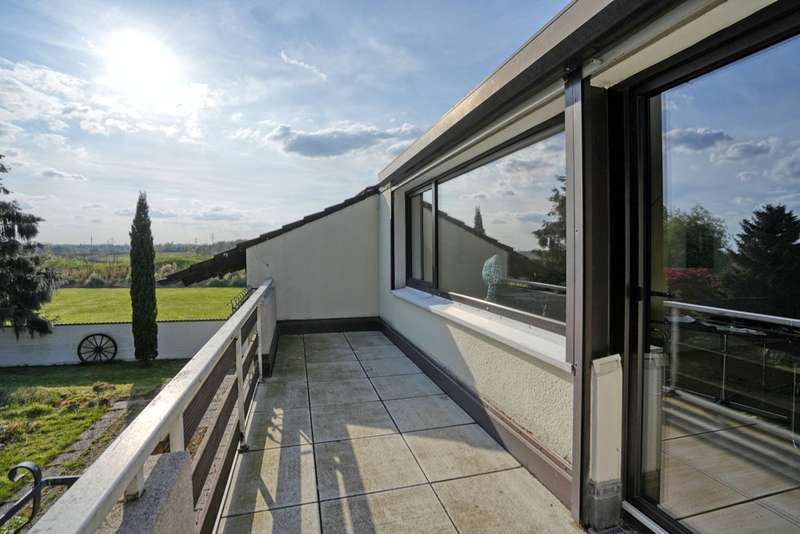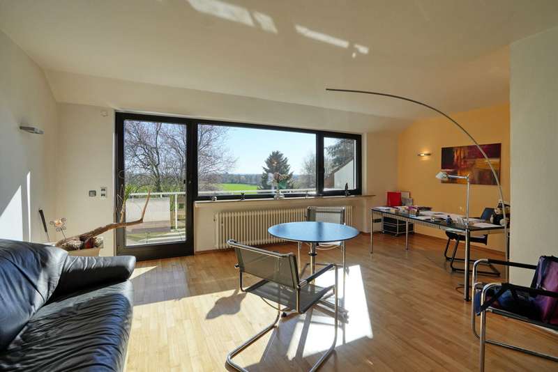This house was built around 1974 in solid, solid construction with a full basement and offers a wide range of possible uses. It contains two apartments that can be combined into one spacious unit if required and is therefore suitable for families, as intergenerational living or for living and working under one roof. On the first floor, you are greeted by a spacious hallway with a checkroom area and guest WC. From here, a hallway leads to the spacious bedroom and the bright, spacious bathroom, which is equipped with a shower and bathtub. The heart of the house is the impressive living area, which is exceptional with a room height of 5.60 meters and a cosy fireplace area. The adjoining dining room and spacious kitchen are ideal for socializing. An open staircase leads to the gallery, which is ideal as a work area, reading corner or private retreat. From the living area and dining room, you can access the sunny south-facing terrace and the large garden. The view opens up to the open countryside - a wonderful place to relax and enjoy. The second apartment is located on the upper floor and is accessed via a hallway with guest WC. At the front of the house are the bedroom with adjoining dressing area and a modern shower room. The living/dining/kitchen area on the garden side faces south and offers access to the sunny balcony. Here you can unwind and enjoy a fantastic view of the greenery. In the basement there is a spacious hobby room, a utility room, the boiler room and storage rooms. There is also a comfortably designed apartment with its own shower room - ideal for guests or as a separate home office. An oversized car garage completes the offer.