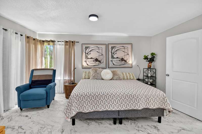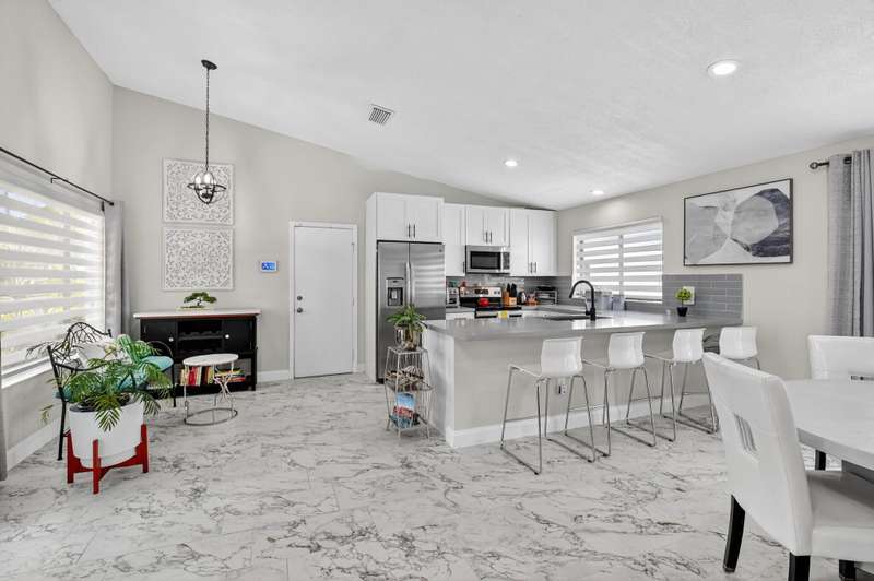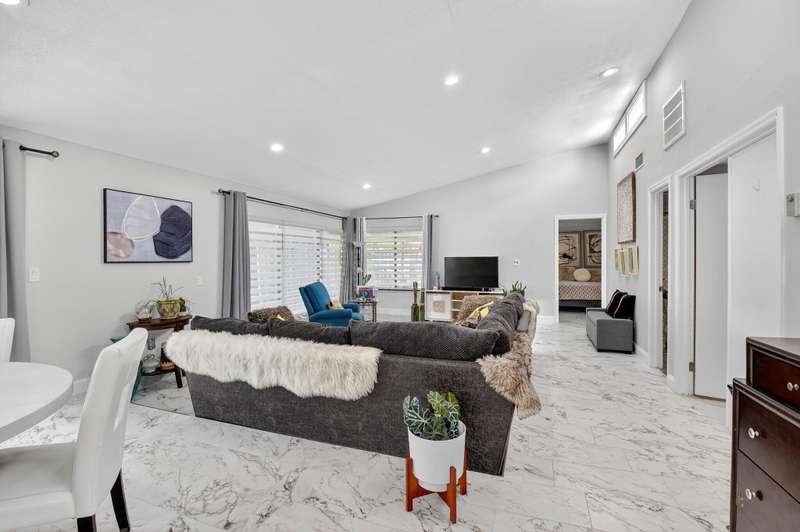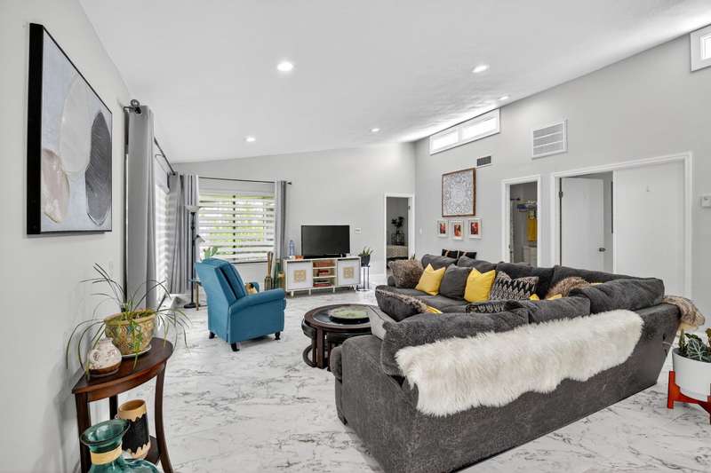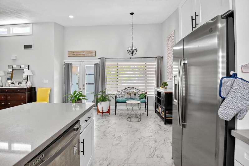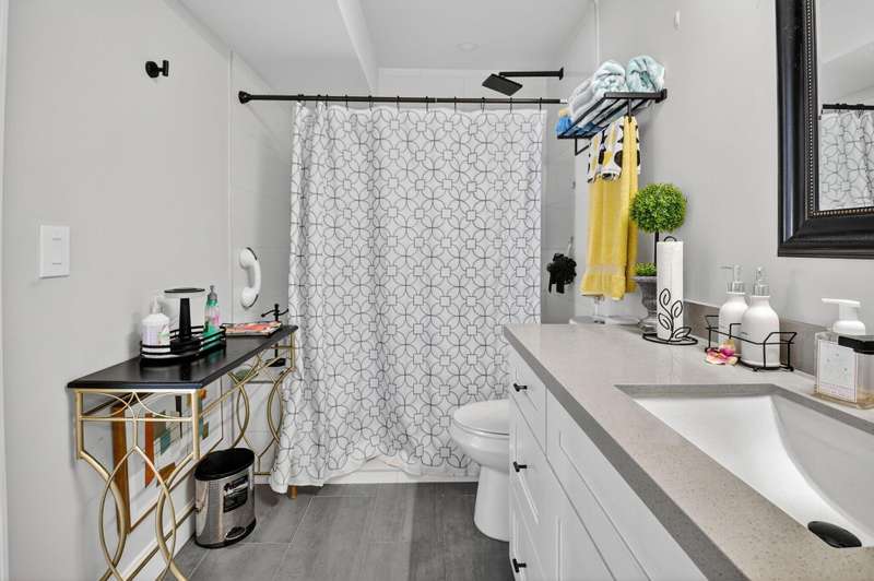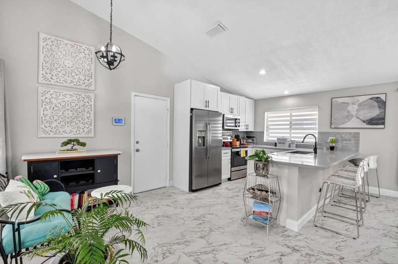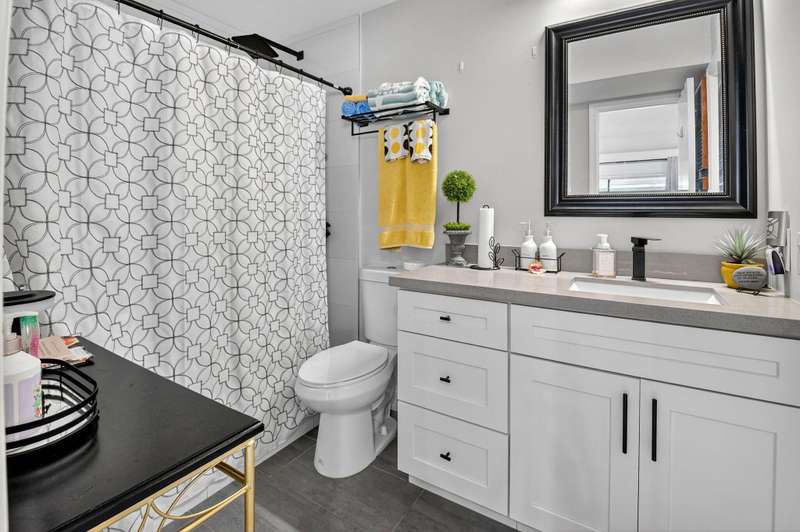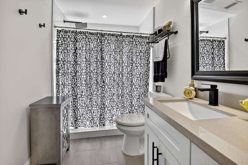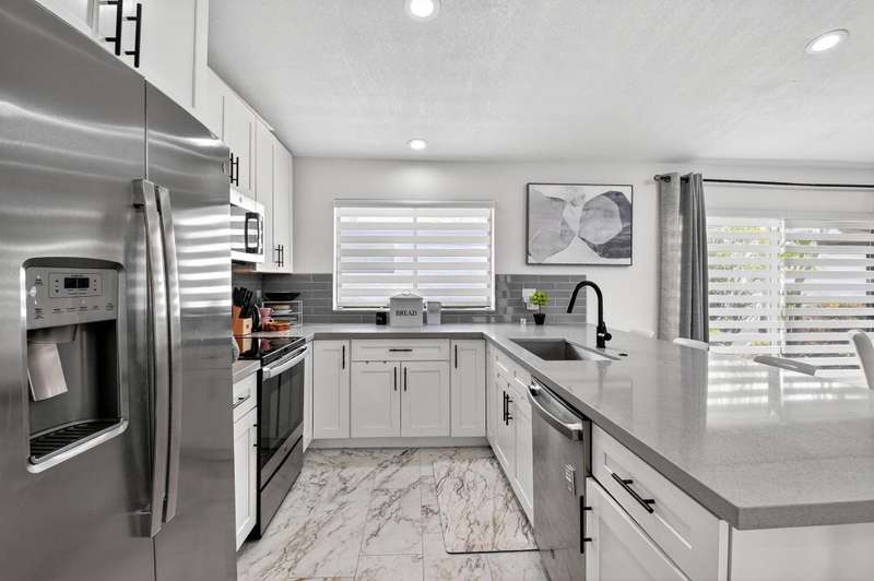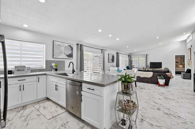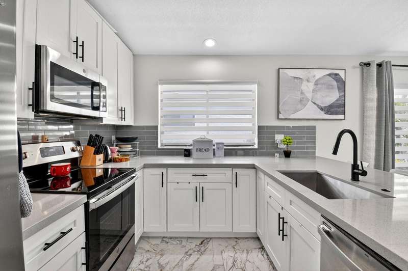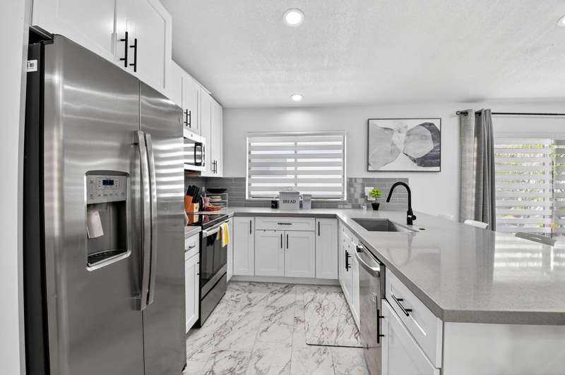 Welcome to this elegantly updated residence where modern charm meets timeless style. From the moment you step inside, you're greeted by stunning new porcelain tile flooring that flows throughout the home, setting the tone for clean lines and sophisticated living. The heart of the home--an open, contemporary kitchen--is a dream for entertainers and culinary enthusiasts alike. It boasts sleek white shaker cabinets, polished quartz countertops, stainless steel appliances, and a layout that seamlessly connects to living and dining spaces. The bathrooms have been thoughtfully renovated with custom shaker cabinetry and gleaming quartz vanity tops, providing a spa-like experience in the comfort of your own home. High ceilings and generously sized bedrooms invite in plenty of natural