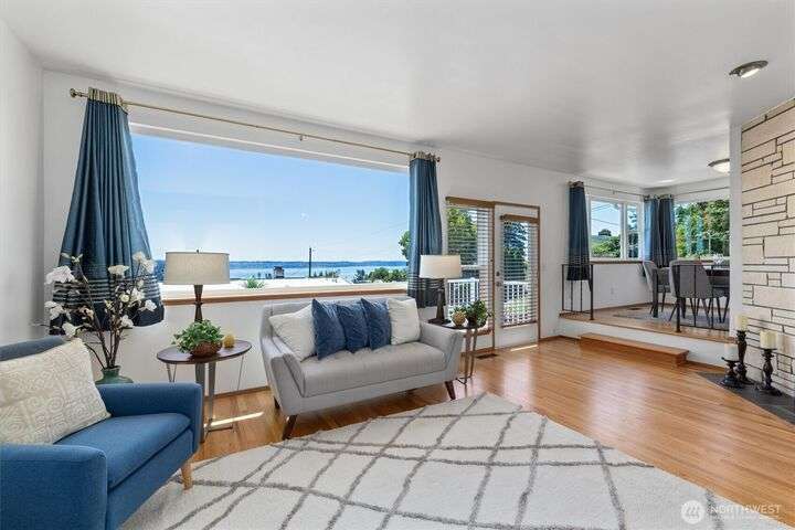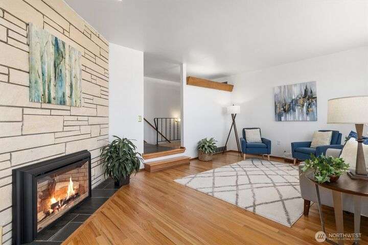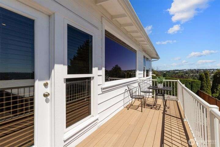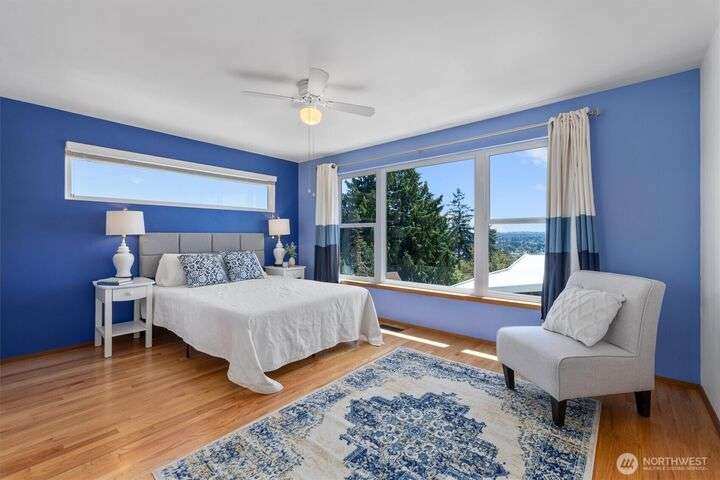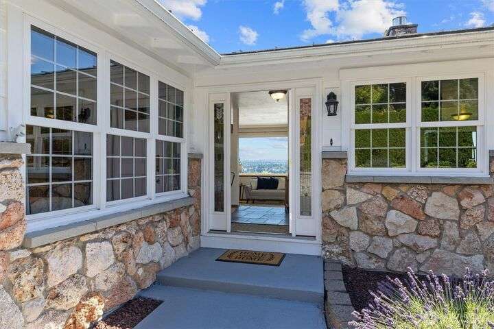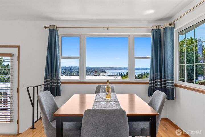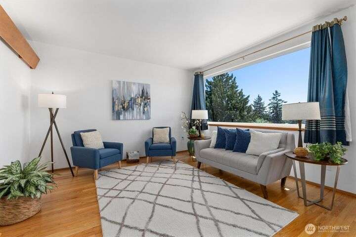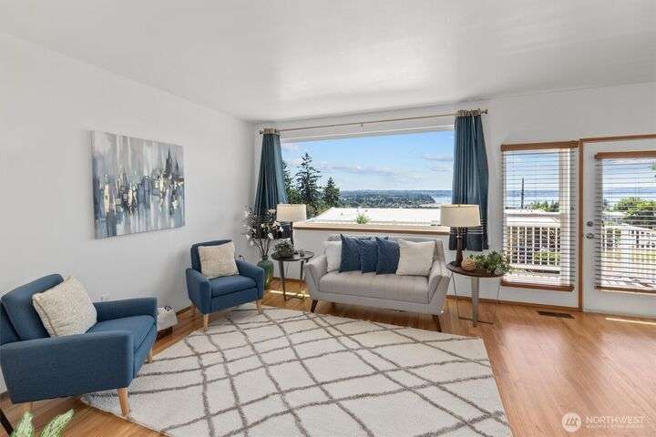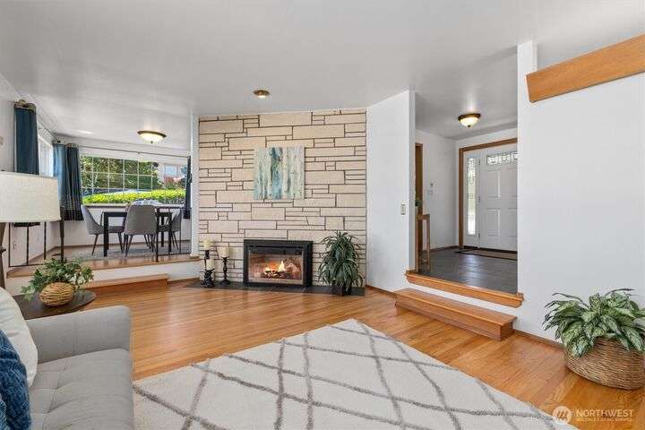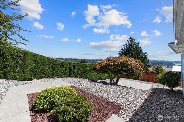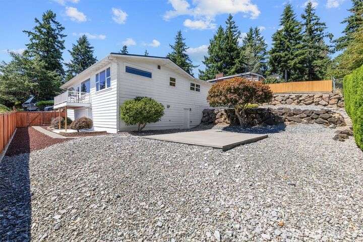 Puget Sound and Mt. Rainier views headline this rare mid-century gem in coveted North Hill—perfect for 4th of July fireworks. Sun-filled main level features hardwoods, central A/C, gas fireplace, and a living room that opens to a Trex-style view deck. Wake to Sound views in the primary suite with private ¾ bath. Finished lower level offers a huge pine-paneled rec room with mini-bar, large finished flex room, plumbing for a second washer/dryer, bath, and exterior sidewalk access—ideal for MIL suite, office, or abundant storage. Lifetime metal roof and major improvements done. Entertain on the view patio with natural-gas quick connect. Impeccably maintained, low-maintenance, fully fenced yard completes the package.