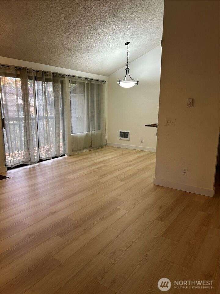 Available now! Private setting for this 2/1.5 home featuring an abundance of natural light, spacious floor plan with vaulted ceilings, kitchen with eating bar, large inviting living room with a fireplace for cool Winter evenings. The main floor opens onto a deck that overlooks a tranquil wooded area and creek. Primary bedroom also has a fireplace with a patio. Excellent location close to transit lines, I-5 and I-405. 2 assigned parking places. Within walking distance to South Center Mall, restaurants and amenities. One small dog ok with additional deposit.