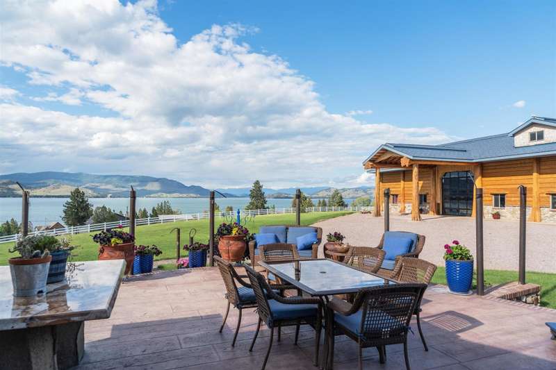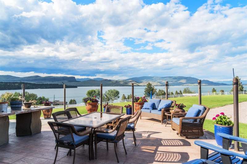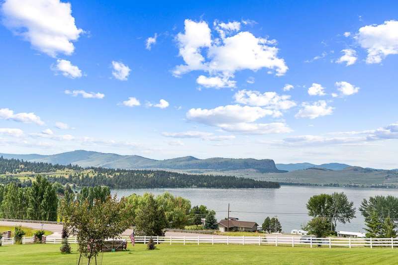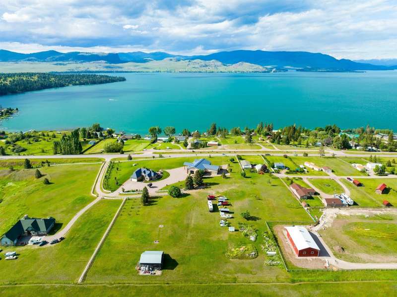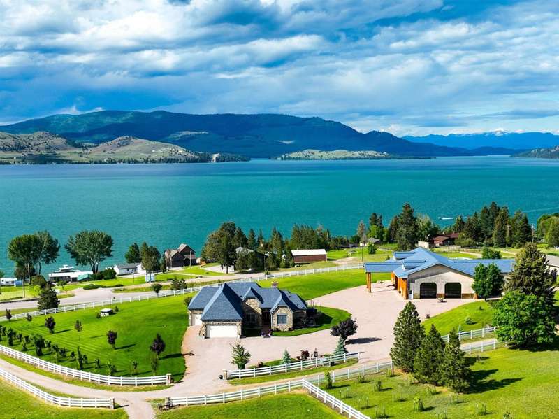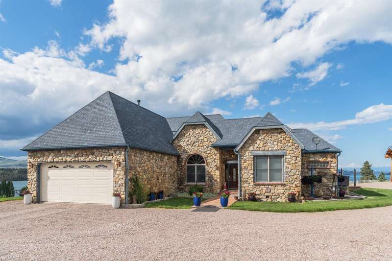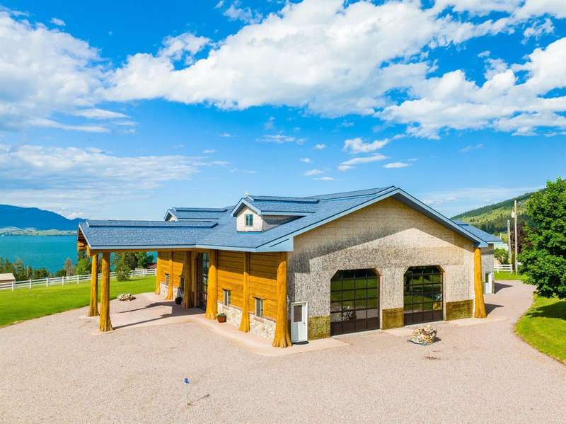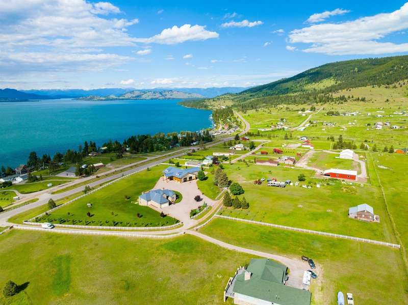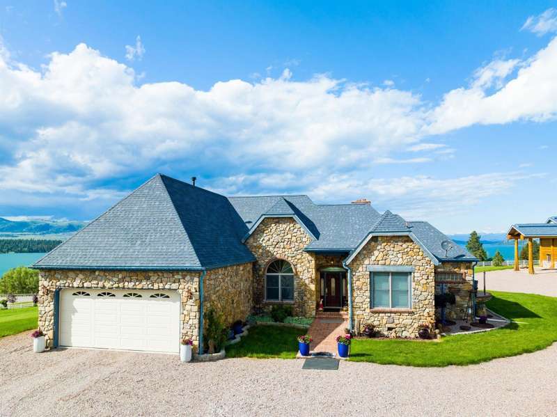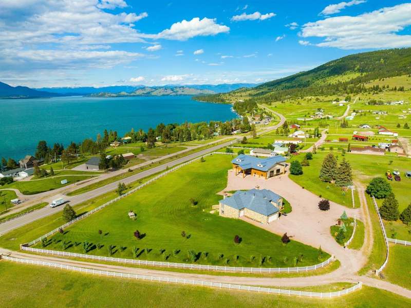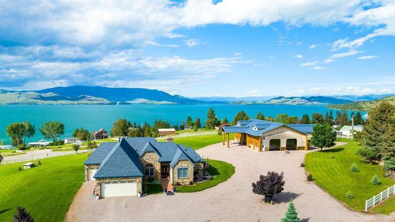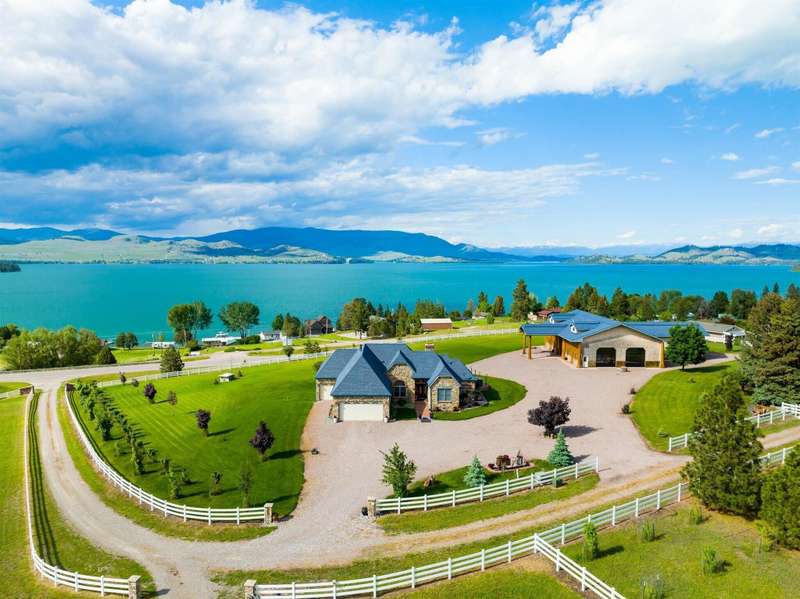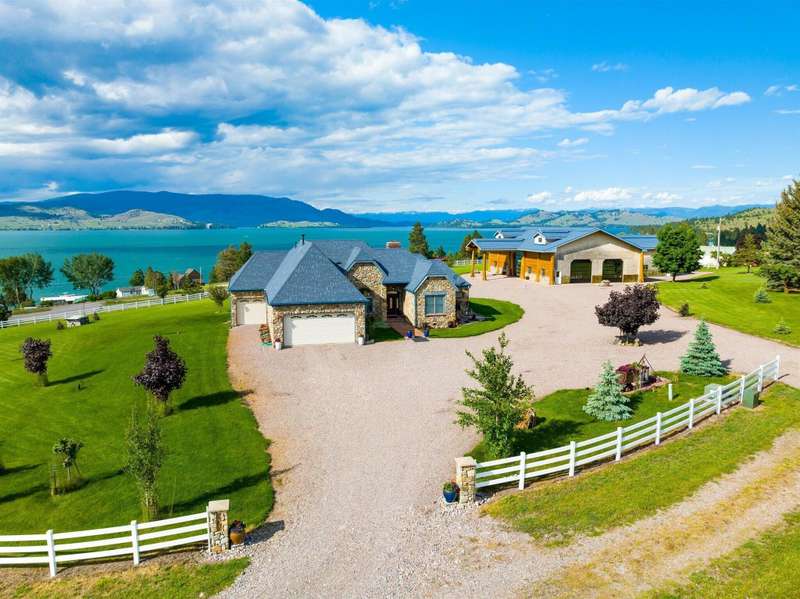 Impressive Stone Masonry home with exceptional mountain, lake and island views. Flathead Lake shows off its two largest islands to the north. Step inside and take in the homes charming finishes. Trimmed with stone are the open living, kitchen and dining areas with fire place and a formal dining room. Primary bedroom provides a cozy see through fireplace, walk in closet and bathroom with garden tub and tile shower. The upper level doors open to a beautiful outdoor living space facing the lake. Downstairs has a warm and inviting family room with fireplace, wet bar and game area, with a walk out door to the yard. Expansive 5,200 square foot shop with large cedar pillars, 16.5 foot walls, heated floor and sawn log siding. Radon: Well Log Available This horse property is fenced with barn. There is an RV hookup area that shares the amazing views. The 6.78 acre property is made up of two lots, each having individual septic and wells. Attached 3 car garage.