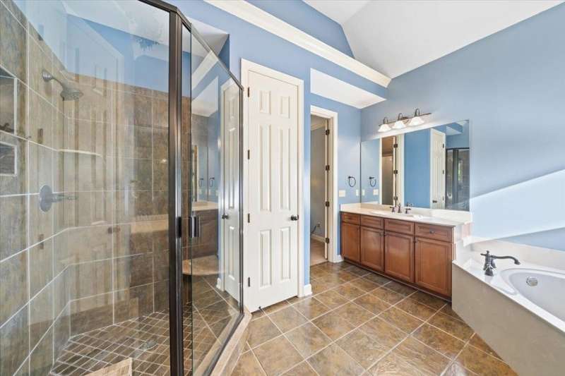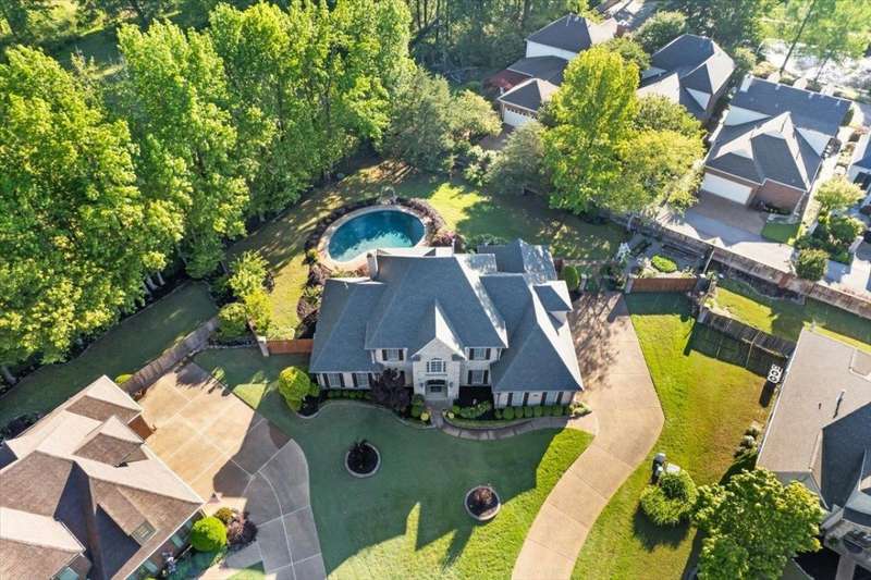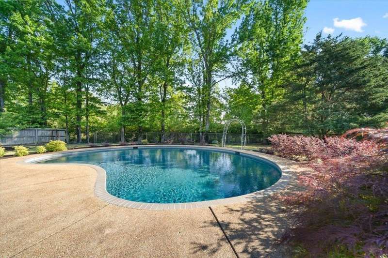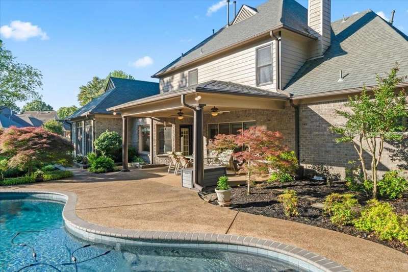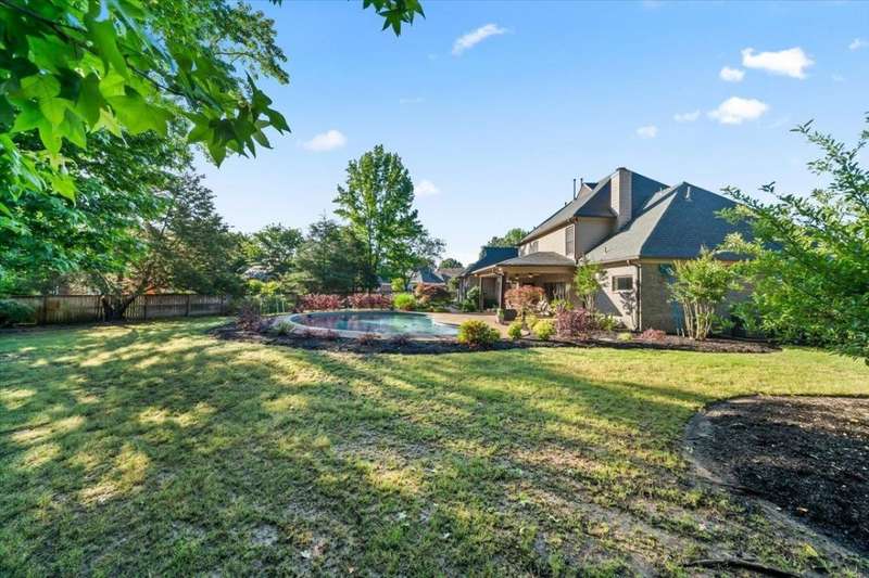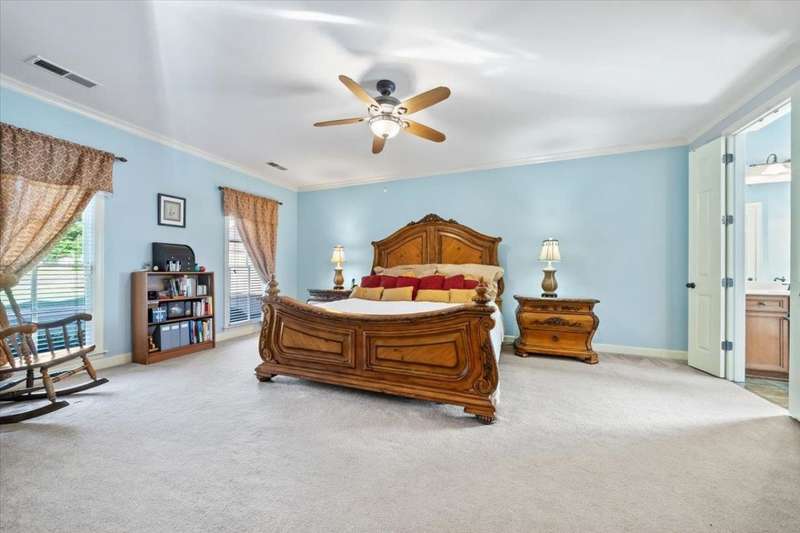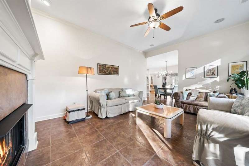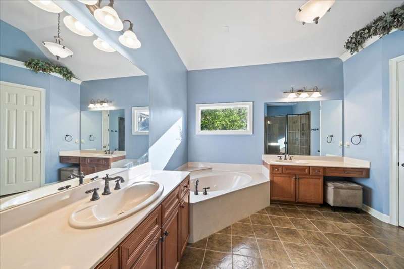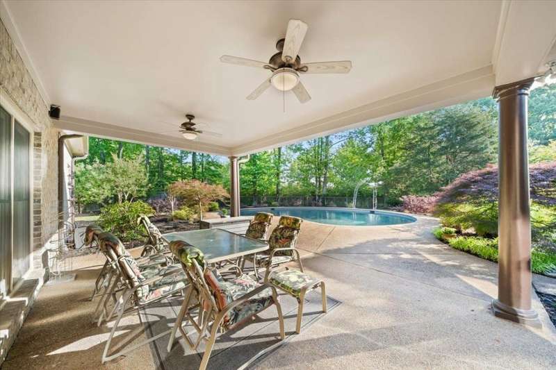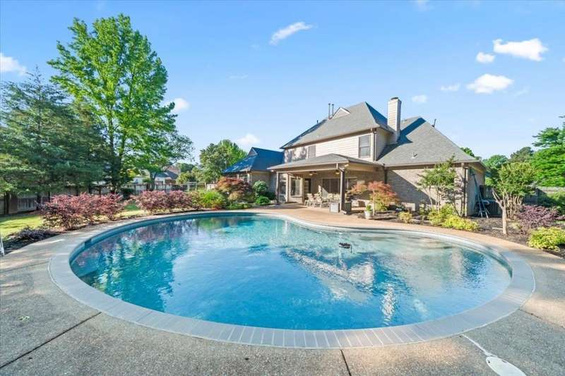 Serene backyard oasis! This beautifully maintained custom 4-bedroom, 3.5 bath home sits on a quiet cove and features a stunning saltwater gunite pool, 3-car garage, with both upstairs and downstairs primary bedrooms. Enjoy the spacious family-sized kitchen with keeping room with gas log fireplace, and built-in bookshelves. Hardwood floors with fresh exterior paint, newer HVAC systems and a hot water tank. Relax on the large cover patio overlooking a lush, tree-lined lot with fruit trees, garden, and an iron gate entry to the backyard. Additional features include a full irrigation system, gutter guards, and a 4 Year Choice Home Maintenance Warranty valid through 2029. VA assumable loan By All at an incredible 3.25%-call for details! Bonus room up, spacious living areas, and community amenities like a neighborhood pool & ponds. Located near top-rated schools and great shopping.