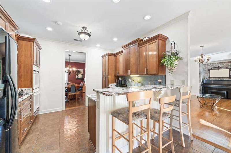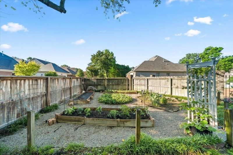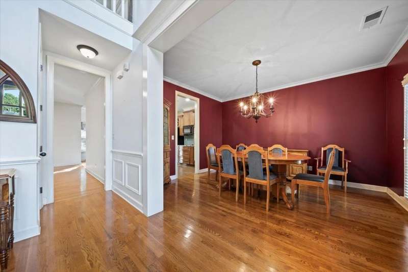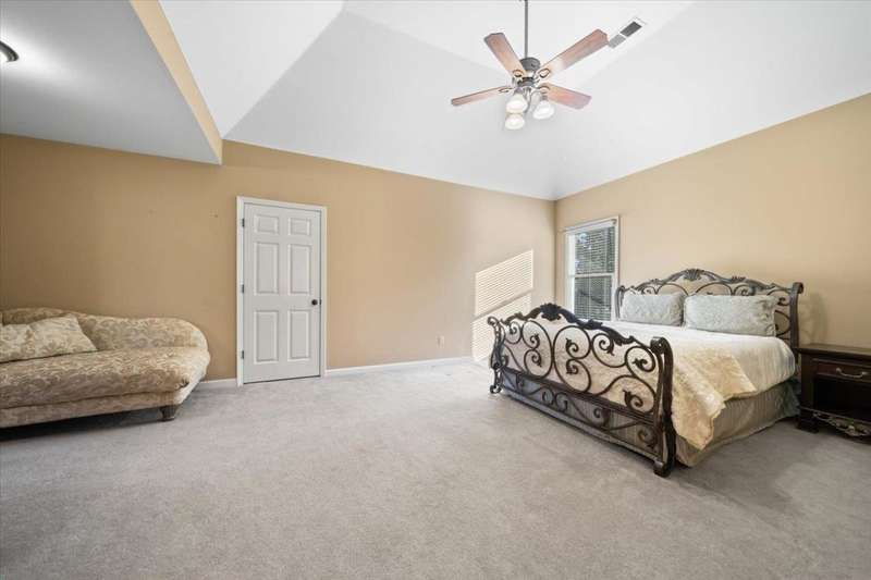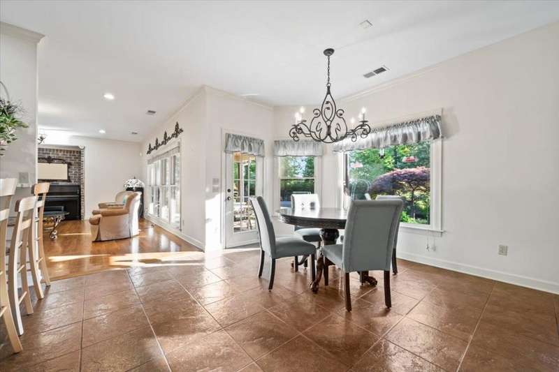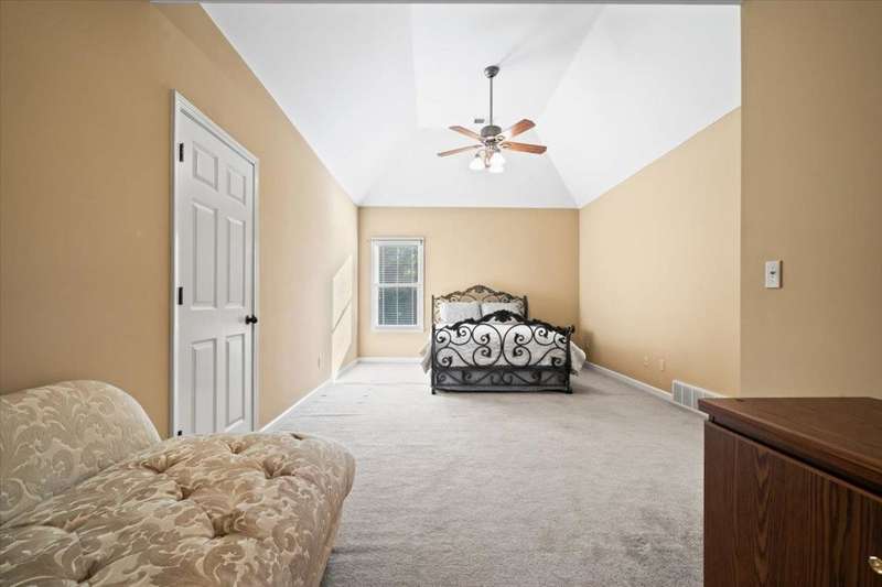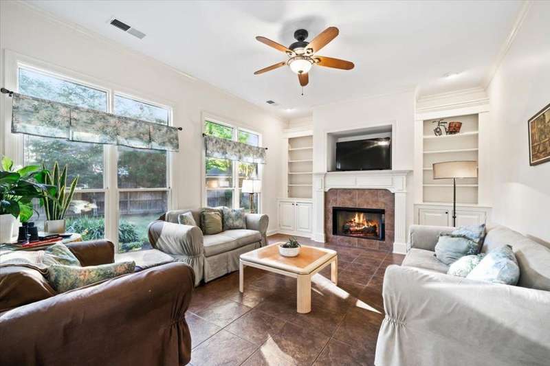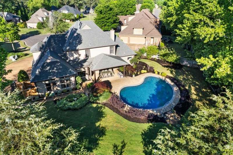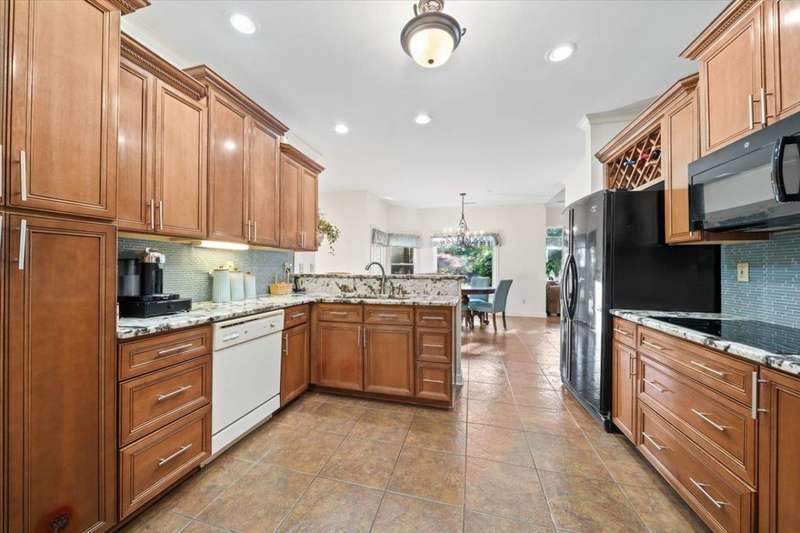 Serene backyard oasis! This beautifully maintained custom 4-bedroom, 3.5 bath home sits on a quiet cove and features a stunning saltwater gunite pool, 3-car garage, with both upstairs and downstairs primary bedrooms. Enjoy the spacious family-sized kitchen with keeping room with gas log fireplace, and built-in bookshelves. Hardwood floors with fresh exterior paint, newer HVAC systems and a hot water tank. Relax on the large cover patio overlooking a lush, tree-lined lot with fruit trees, garden, and an iron gate entry to the backyard. Additional features include a full irrigation system, gutter guards, and a 4 Year Choice Home Maintenance Warranty valid through 2029. VA assumable loan By All at an incredible 3.25%-call for details! Bonus room up, spacious living areas, and community amenities like a neighborhood pool & ponds. Located near top-rated schools and great shopping.