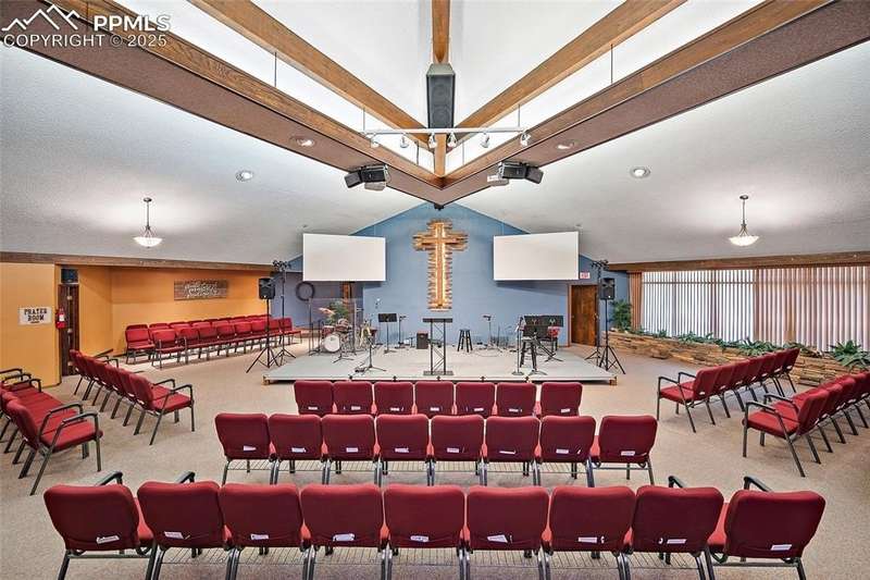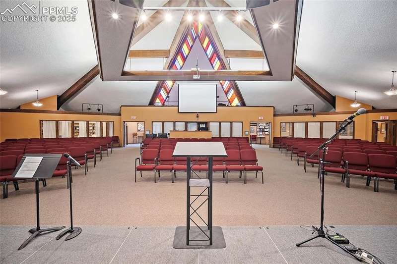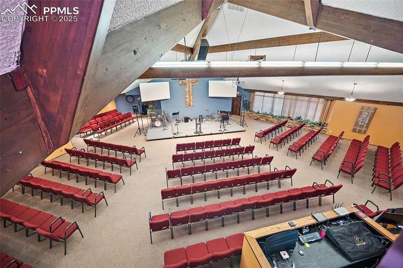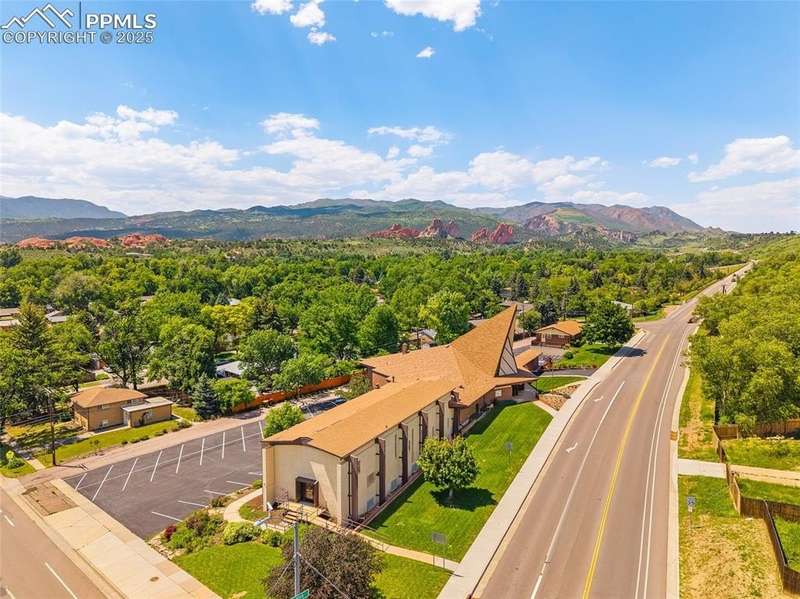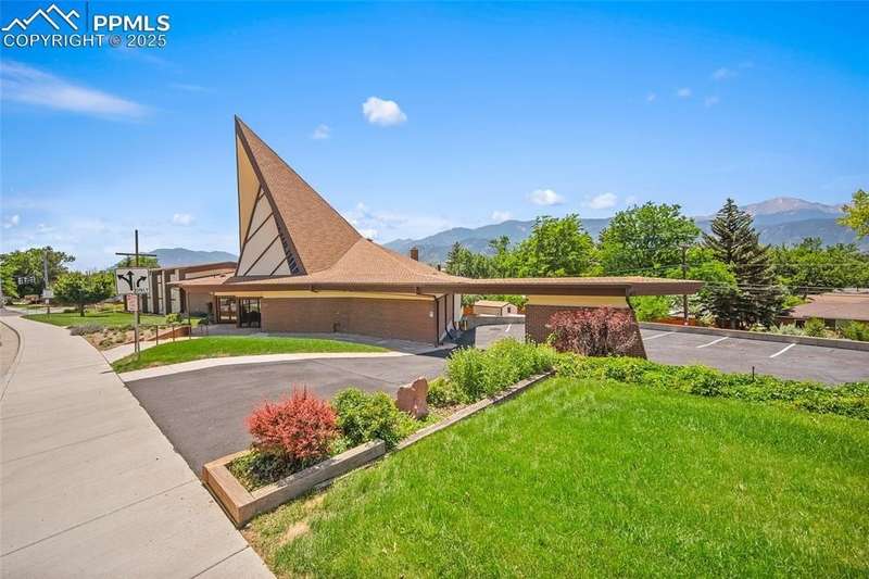 Highly visible church property with excellent architectural appeal just south of Garden of the Gods available for medium-sized or growing congregation seeking a new turn-key home anchored in a high-traffic West side location. Offering consists of a 16,000-sf three-level main building on almost one acre and a 2,000-sf residence/administrative building on a separate but contiguous quarter-acre. Fantastic 225-seat sanctuary with soaring ceilings, stained glass and decorative cross, along with large stage area and sound booth, combines with other large areas to provide enough space for multiple services for congregations needing versatility as they add members. Great visual appeal with cathedral-esque steeple set amid a panorama of the red rocks of Garden of the Gods just north of Old Colorado City offers distinctive and photogenic marketing/outreach options. Extremely usable floor plan and office arrangement includes a gym with large attached kitchen for congregational or community events, multiple large meeting rooms, secure area for children's ministry with rest rooms and kitchenette, classrooms, offices, libraries, upper and lower lobbies, a second kitchen, 9 rest rooms and massive amounts of storage. Separate building to the north could be used as a parsonage, storage, administrative offices or all three. Lots include 65 striped parking spaces, and there is ample street parking nearby for overflow needs. ADA features include an elevator, chair lift in the gym, ramps at the front entrance, and reserved parking spaces. Property zoned R 1-6 with conditional use for religious facility. Other conditional uses allowed by zoning designation include elementary or secondary school. Possible use also for non-profit or organizations needing office and a large meeting space, as well as rental income from gym, sanctuary or the home for outside groups. Large amount of frontage on 30th Street with well-known presence on way to Garden of the Gods makes this a unique opportunity.