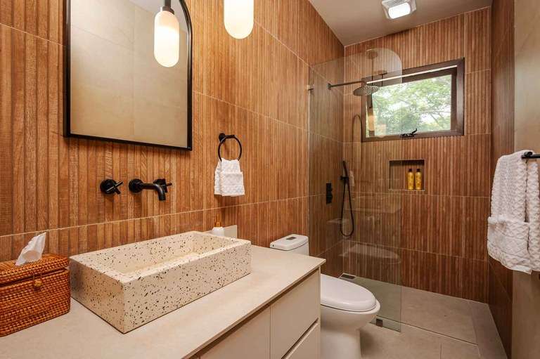 The villa itself embodies tropical modern design, with soaring ceilings, clerestory windows, and expansive glass doors that allow sunlight and breezes to flow freely throughout. The spacious open floor plan creates seamless indoor-outdoor living, enhanced by natural textures, handcrafted tilework, and rich tropical hardwood finishes.