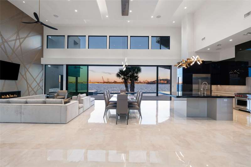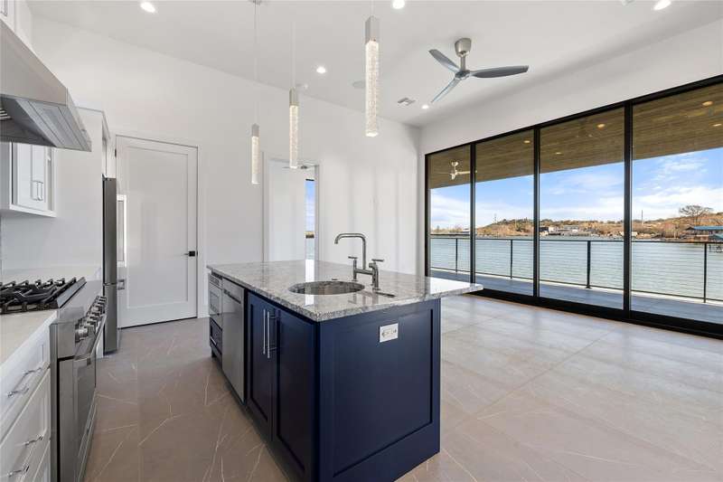 Perched along the glistening shores of Lake LBJ, 115 Estate Drive is a strikingly modern estate, completed in 2024 by Austin homebuilder and designer Mike Holloway. The sleek, linear design of this grand residence combines contemporary architectural elements with natural stone accents and floor-to-ceiling glass walls that frame 180-degree lake views. Offering wonderful privacy, the 9-bedroom, 10.5-bathroom home provides expansive indoor living spaces ideal for entertaining, all of which flow effortlessly into the spacious outdoor terraces and gathering areas overlooking the water. Whether hosting large gatherings or intimate get-togethers, this estate is designed for sophisticated yet relaxed lakefront living. The outdoor living areas are as impressive as the interior, making the most of the property's .69-acre lot and +/- 300 feet of prime Lake LBJ waterfront. With a boathouse featuring two additional bedrooms and bathrooms, a boat garage with two slips, and space for jet skis, this property is perfect for lake lovers who enjoy boating and water sports. The luxurious outdoor kitchen is designed for entertaining, with its own pizza oven, offering the perfect setting for al fresco dining with stunning lake views as the backdrop. The expansive terraces and outdoor spaces create seamless indoor-outdoor living, enhancing the serene ambiance of the estate. The estate includes a detached flex space, designed as a state-of-the-art gym, complete with a sauna for ultimate rejuvenation. The expert craftsmanship and attention to detail ensure that every aspect of this estate speaks to modern elegance and lakeside luxury, offering the perfect combination of grandeur, style, and functionality for an entertainer's dream home.