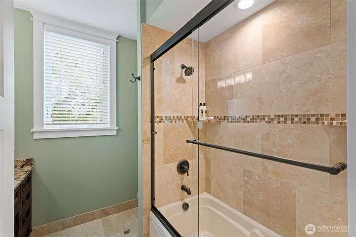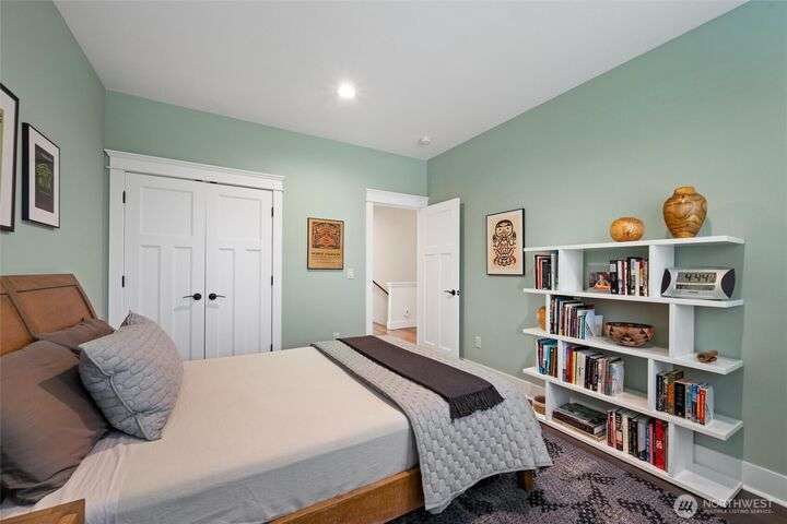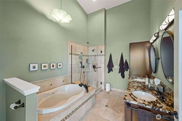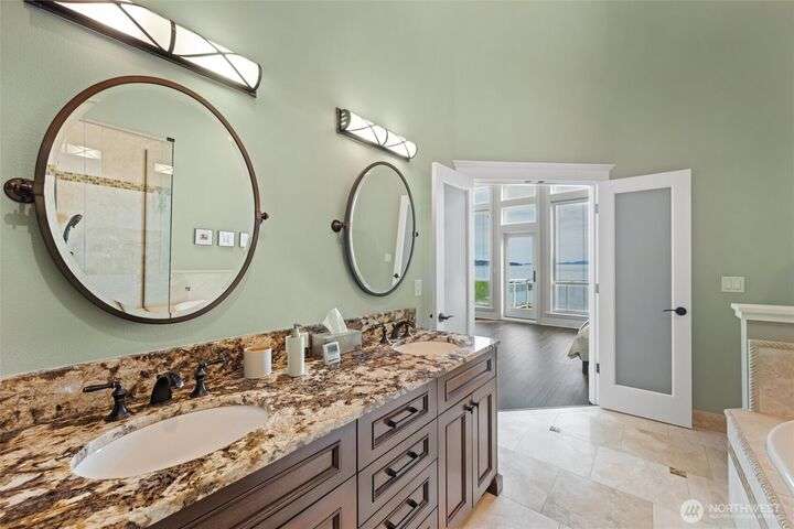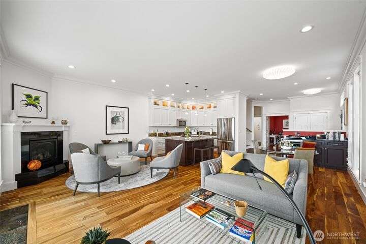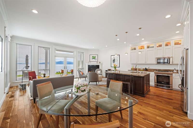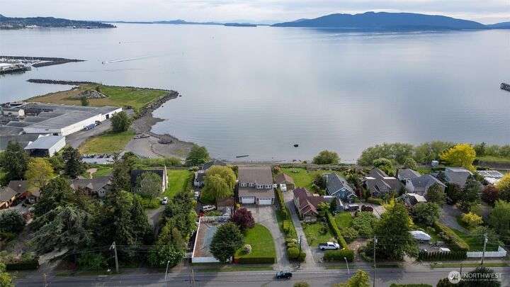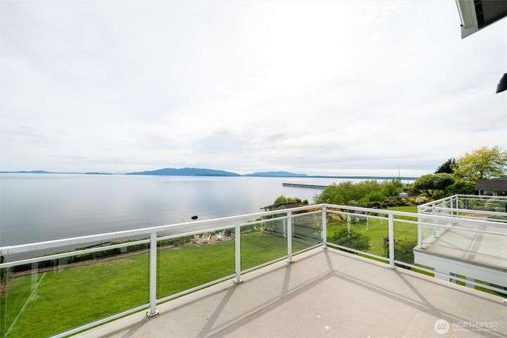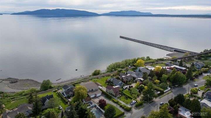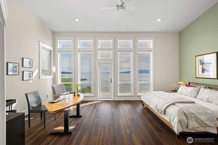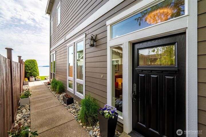 Luxury townhouse w/amazing southern bay/sound, island & mountain views through walls of windows up to soaring vaulted ceilings & high-end finishes throughout. This 2580 sqft unit lives like a similarly sized house w/3 bedrooms, office, 2-car garage w/the lock & go convenience of a condo. Fabulous primary suite features a spa bath & separate dual-shower enclosure, radiant heat, walk-in closet, and large balcony w/sweeping unobstructed views. Originally built in 2010, the current owners have completely gone through entire unit, upgrading fixtures, flooring, windows, appliances, patio. Complete interior paint refresh. Private patio, lawn and set back from the road with off-street parking. Rare two-unit association amongst single-family homes.