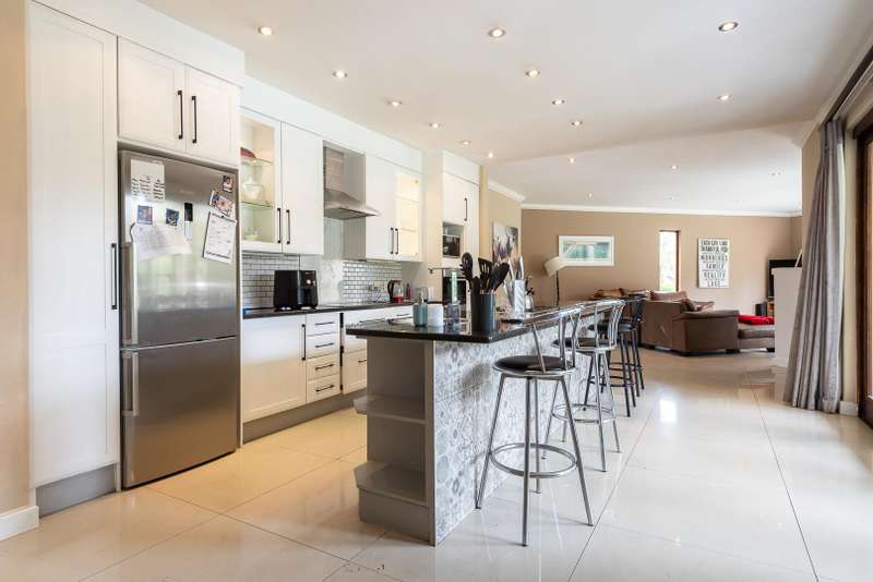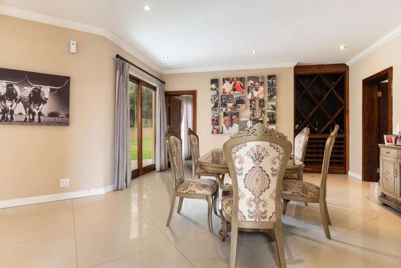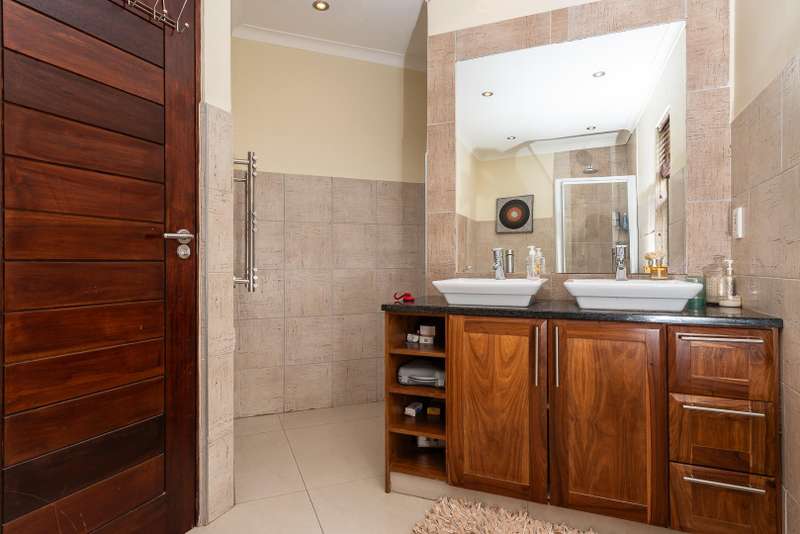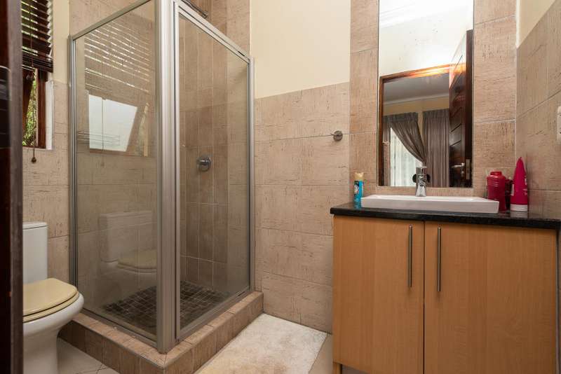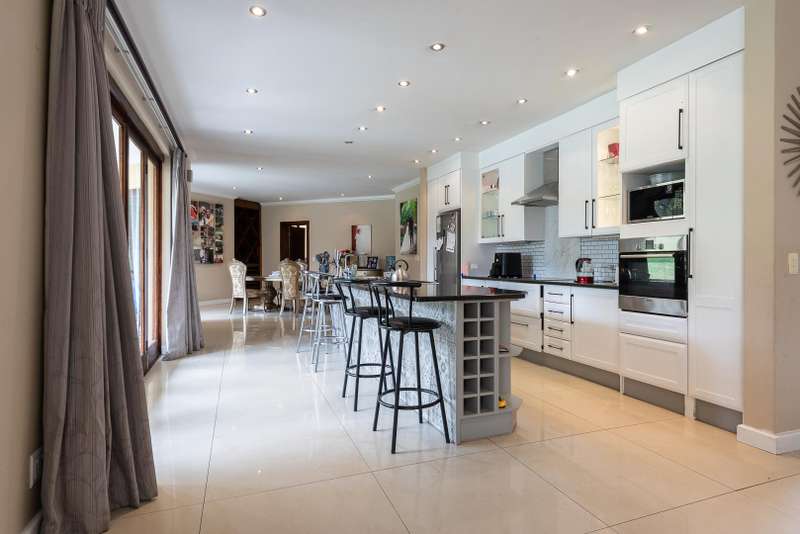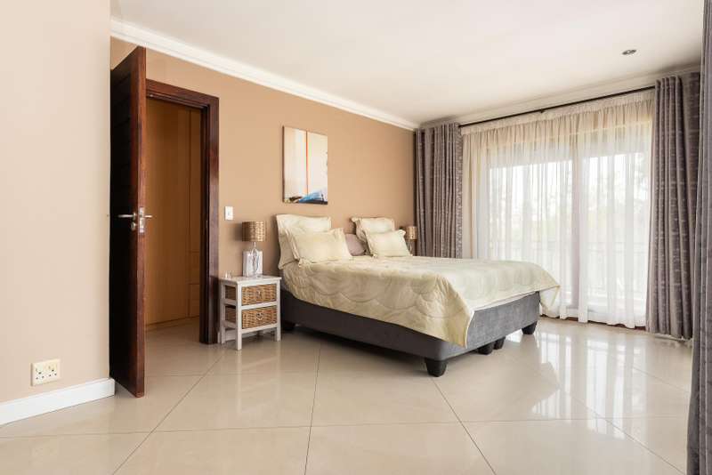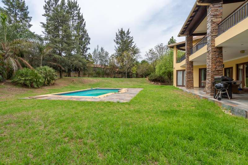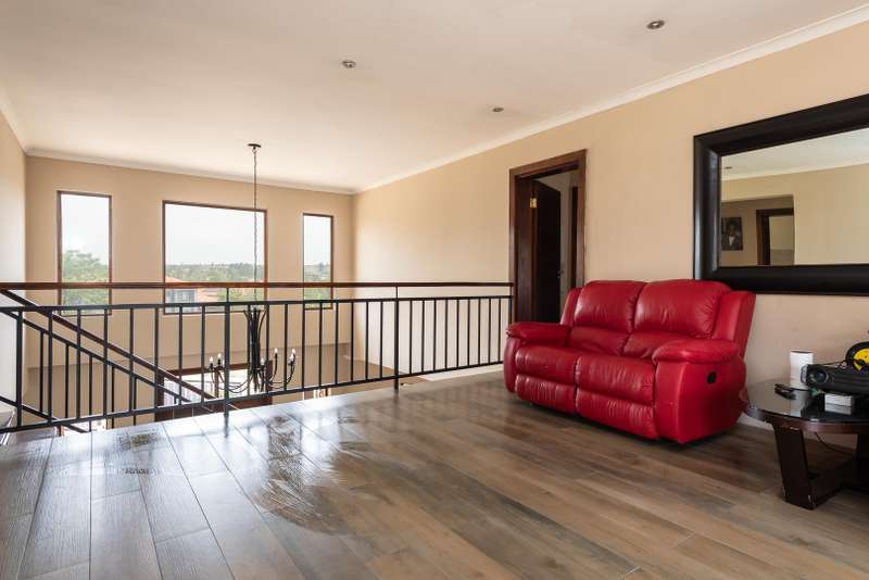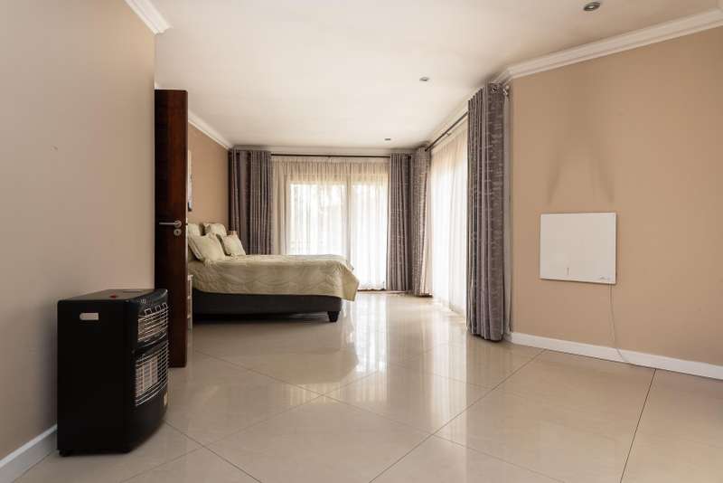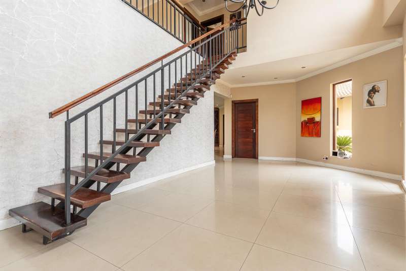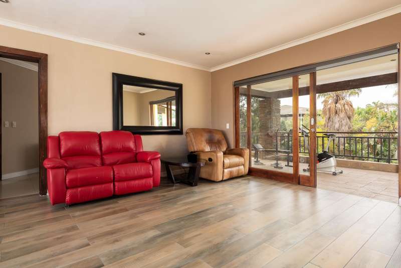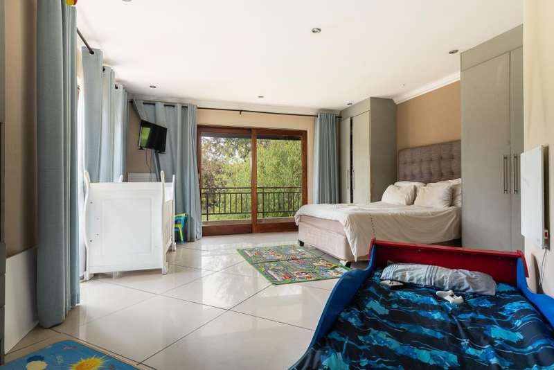 This stunning family home in Summerset Estate, Midrand, is set on a generous 2200 square meter stand. It features a spacious reception area and a massive lounge that opens to the lush garden. The modern kitchen overlooks the pool, enhancing the living experience. The dining room, adjacent to a wine rack, leads to the scullery. Downstairs includes an en suite bedroom, while upstairs offers a small study, a well-sized second bedroom, and a cozy pyjama lounge connecting to a large balcony with backyard views. The main en suite bedroom boasts a walk-in closet and balcony access.