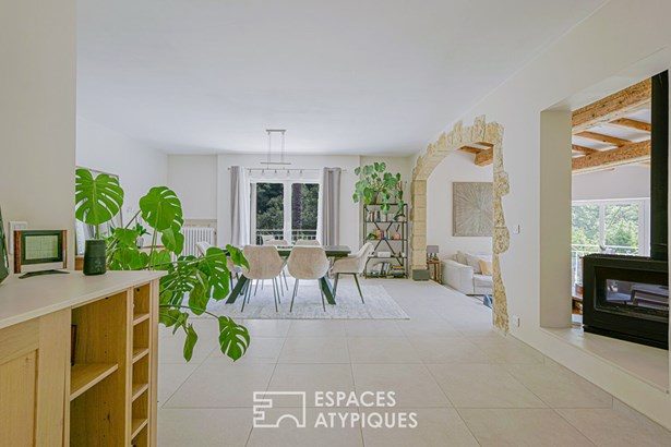 Formerly a trout farm, the 1960s building with a living area of 263 sqm, sits on a vast wooded plot of more than one hectare, including 6000 sqm enclosed. Its careful layout and modern architecture give the place a warm and authentic atmosphere, perfectly in harmony with the surrounding landscape.
