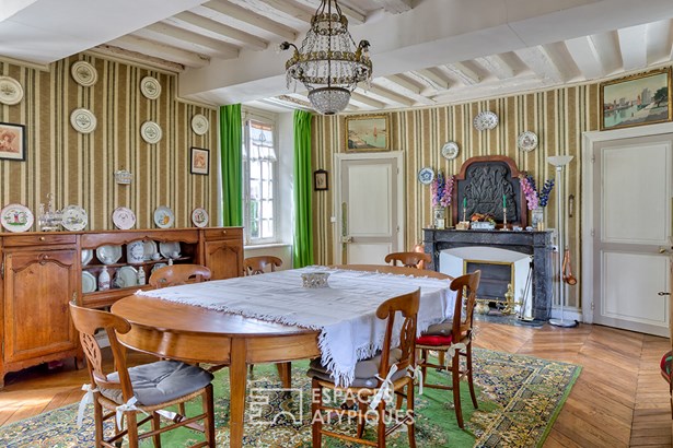 The interiors, in their composition and finishes, reveal the discreet refinement of a residence shaped over the centuries. Solid oak parquet floors complement the high ceilings and generous volumes, while the light, subtly captured, glides across the walls and numerous fireplaces with pure lines. The soul of the place is evident in the details: in the plant frieze running along the east facade, in the pediment crowning the central bay, or in the medallions on the west facade, whose figures still remain a mystery. Each room seems to retain the echo of the footsteps that have passed through it, the stories of a lineage faithful to the history of France.