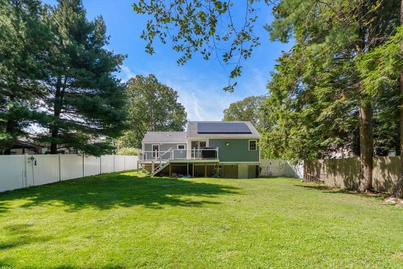 Welcome to this private, fully updated 2BR/1BA ranch, offering the perfect combination of comfort and convenience with single-level living. Updates were completed in 2020, including a new roof, windows, siding, electrical, heating/AC and flooring and in 2024 Solar Panels were added, ensuring peace of mind for years to come.inside, The open floor plan is filled with natural light and features a beautifully remodeled kitchen with a spacious island ideal for entertaining or everyday meals. Ample closet space and a basement provide plenty of storage options. Step outside to a new deck overlooking conservation land, creating a tranquil setting right in your backyard. The fully fenced yard is perfect for pets, and an expansive deck makes for the ultimate warm-weather hangout spot. This home is also ideally located just minutes from the train station, major highways, and a bustling shopping mall, making commuting and daily errands a breeze.