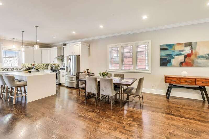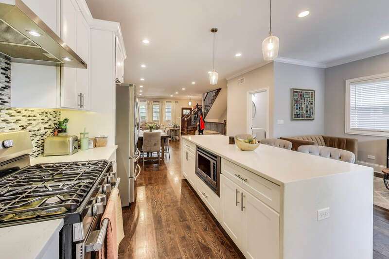 Welcome home to this 4 bed, 3.5 bath home. This beautifully rehabbed home boasts loads of natural light, high ceilings and an open floor plan that lends itself to entertaining and family gatherings. Featuring hardwood flooring throughout, gourmet kitchen with quartz counter-tops, soft close cabinetry with under cabinet LED lighting, large island and professional grade stainless steel appliances! Settle in for the night in one of the 4 large bedrooms, common bathroom with double vanity and the incredible primary suite that features a large walk-in closet, ensuite bathroom with double vanity and large shower. This exceptional property includes a family room in the finished basement with a full bath, storage and for extra piece of mind: includes drain tile and a sump pump system. Enjoy your fully fenced backyard oasis on your large deck and brand new over-sized 2 car garage. Property near major Oak Park shopping, dining and cafe district! It's prime location near the blue line makes it a commuters dream!!! Don't miss this one, it won't last long!