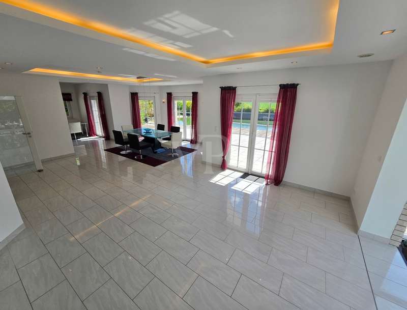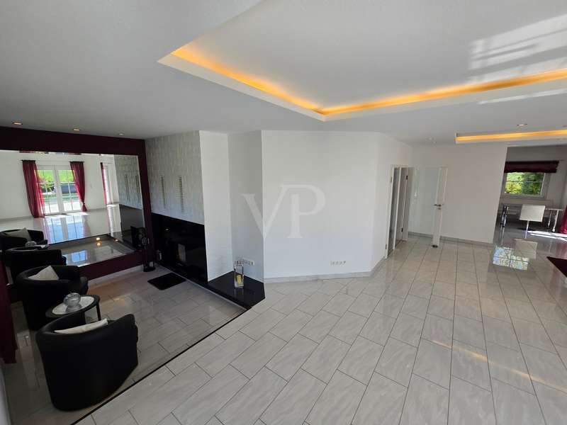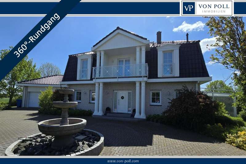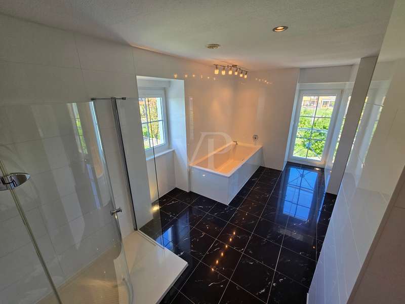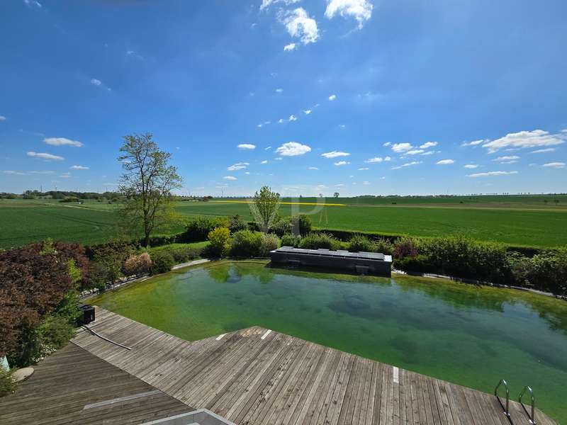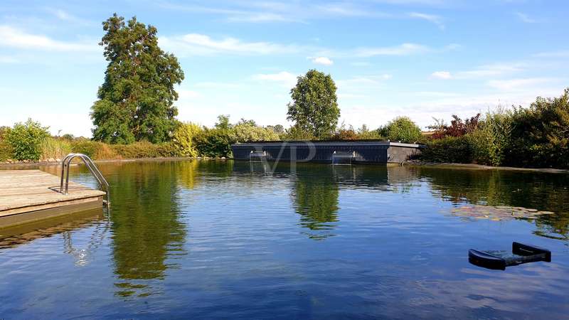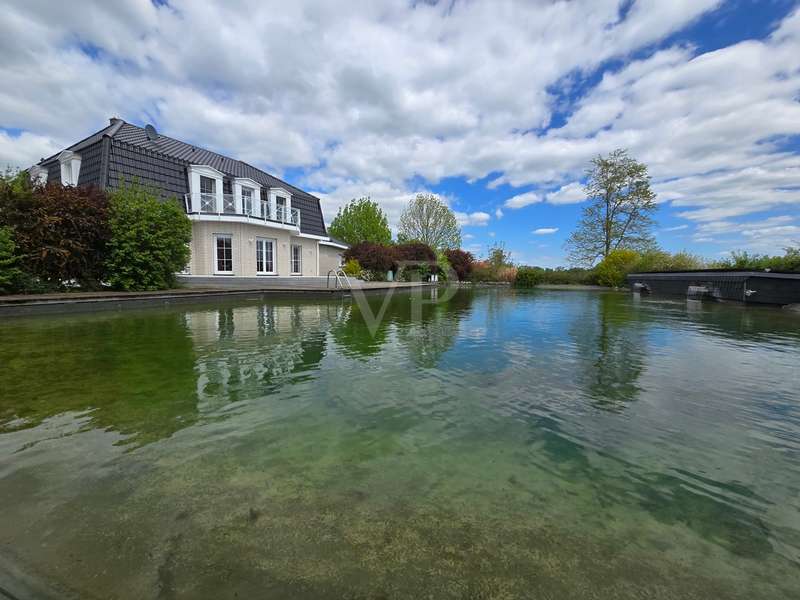 With this special property, we are delighted to be able to offer you something truly rare in a wonderful rural location: For sale here is a young, prestigious country villa in top condition and ready to move into, on a park-like plot of over 3,600 m² with a swimming pond. This property is aimed at people who are looking for something special and want to live quietly in a spacious living area and also appreciate the private atmosphere on their own large plot. This exclusive country villa is suitable for families as well as for combined residential and professional use. The well thought-out layout, the spacious rooms with their brightness and the many small additional comfort features must be experienced in pictures and can hardly be adequately described in words, so please contact us for your personal access to our exclusive 360° tour through the floors and the outdoor facilities. This spacious two-storey house with around 275 m² of living space and around 270 m² of additional usable space was built in 2008 in the style of a classic country villa on a solid insulated basement with reinforced concrete walls and concrete floor slab and additional ring drainage. The elaborate façade design with columns, pilaster strips and window gables, the dark mansard roof with glazed tiled roofing and the light-colored, contrasting ventilated clinker brick façade in combination with the elaborate outdoor facilities make it a prestigious property that leaves little to be desired. The house has a total of 7 living rooms and bedrooms, including the checkroom with adjoining toilet in the vestibule, a double garage with adjoining sluice with utility area and cellar access and 5 high cellar rooms. There is also a large semi-open kitchen, three bathrooms (2 on the upper floor, 1 in the basement, which was completely renovated in 2023) and a guest WC on the ground floor. Connected to the living room is a conservatory of around 25 m² with underfloor heating. On the upper floor is the walk-in wardrobe/dressing room with its open wardrobe elements and access from the master bedroom and master bathroom and to the north-facing balcony. The south-facing balcony is accessible from both children's bedrooms as well as from the children's bathroom. On the first floor, the large south-facing terrace extends in front of another highlight: the swimming pond with around 200 m² of water surface and its two illuminated waterfalls on the separate pump house with photovoltaic system (14 panels). Heating and hot water are supplied centrally by a modern gas condensing combi boiler in the basement. The first floor is underfloor heated throughout, including the conservatory, upper floor and basement with radiators throughout. In addition to underfloor heating, the master bathroom on the upper floor also has a combined heated towel rail (via the heating system and electricity in summer). In addition to our comprehensive exposé with many photos of all rooms and dimensioned floor plans of all floors, we also offer an elaborate 360° tour of all rooms on all floors and the outside area for this exclusive country house villa. You will receive your personal access to this after submitting your full contact details and a personal initial contact by telephone. If you are further interested, we will be happy to arrange an individual viewing appointment for you. We thank you for your understanding that, at the owner's request and in order to protect his privacy, we can only arrange viewing appointments following a prior credit check (submission of a current pre-financing enquiry confirmation from a financier for at least the asking price or a bank confirmation of sufficient cash funds). We are also happy to offer a financing check by VON POLL FINANCE. Please contact us.
