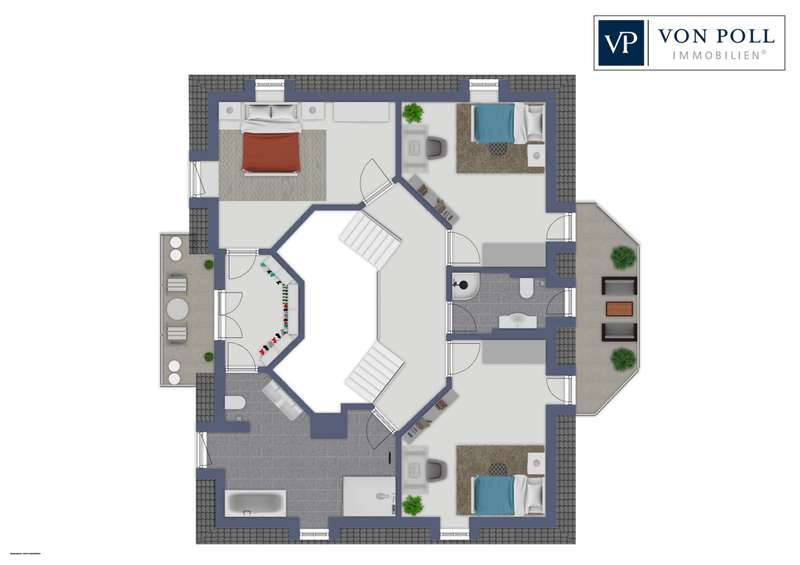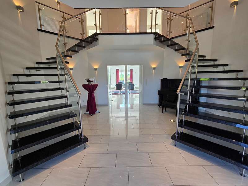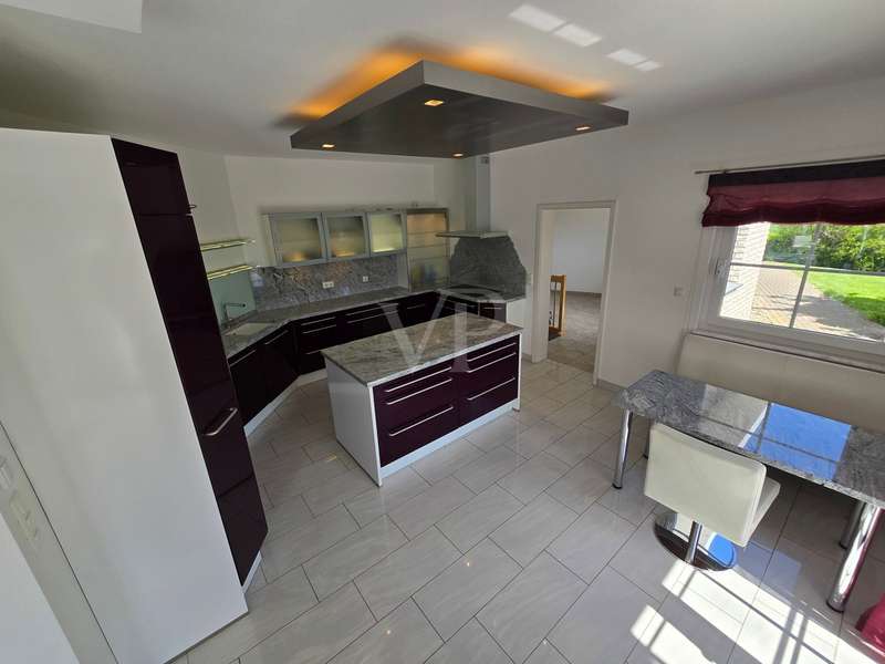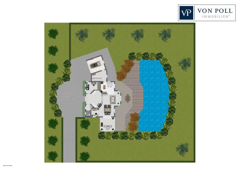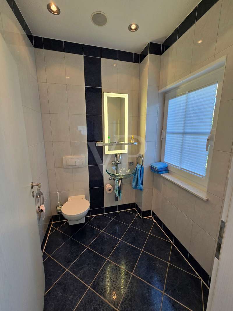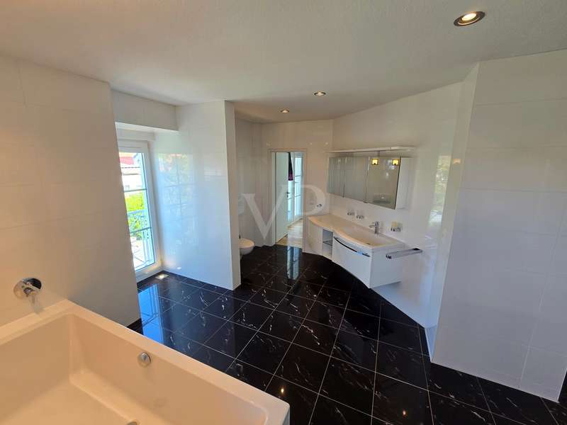 With this special property, we are delighted to be able to offer you something truly rare in a wonderful rural location: For sale here is a young, prestigious country villa in top condition and ready to move into, on a park-like plot of over 3,600 m² with a swimming pond. This property is aimed at people who are looking for something special and want to live quietly in a spacious living area and also appreciate the private atmosphere on their own large plot. This exclusive country villa is suitable for families as well as for combined residential and professional use. The well thought-out layout, the spacious rooms with their brightness and the many small additional comfort features must be experienced in pictures and can hardly be adequately described in words, so please contact us for your personal access to our exclusive 360° tour through the floors and the outdoor facilities. This spacious two-storey house with around 275 m² of living space and around 270 m² of additional usable space was built in 2008 in the style of a classic country villa on a solid insulated basement with reinforced concrete walls and concrete floor slab and additional ring drainage. The elaborate façade design with columns, pilaster strips and window gables, the dark mansard roof with glazed tiled roofing and the light-colored, contrasting ventilated clinker brick façade in combination with the elaborate outdoor facilities make it a prestigious property that leaves little to be desired. The house has a total of 7 living rooms and bedrooms, including the checkroom with adjoining toilet in the vestibule, a double garage with adjoining sluice with utility area and cellar access and 5 high cellar rooms. There is also a large semi-open kitchen, three bathrooms (2 on the upper floor, 1 in the basement, which was completely renovated in 2023) and a guest WC on the ground floor. Connected to the living room is a conservatory of around 25 m² with underfloor heating. On the upper floor is the walk-in wardrobe/dressing room with its open wardrobe elements and access from the master bedroom and master bathroom and to the north-facing balcony. The south-facing balcony is accessible from both children's bedrooms as well as from the children's bathroom. On the first floor, the large south-facing terrace extends in front of another highlight: the swimming pond with around 200 m² of water surface and its two illuminated waterfalls on the separate pump house with photovoltaic system (14 panels). Heating and hot water are supplied centrally by a modern gas condensing combi boiler in the basement. The first floor is underfloor heated throughout, including the conservatory, upper floor and basement with radiators throughout. In addition to underfloor heating, the master bathroom on the upper floor also has a combined heated towel rail (via the heating system and electricity in summer). In addition to our comprehensive exposé with many photos of all rooms and dimensioned floor plans of all floors, we also offer an elaborate 360° tour of all rooms on all floors and the outside area for this exclusive country house villa. You will receive your personal access to this after submitting your full contact details and a personal initial contact by telephone. If you are further interested, we will be happy to arrange an individual viewing appointment for you. We thank you for your understanding that, at the owner's request and in order to protect his privacy, we can only arrange viewing appointments following a prior credit check (submission of a current pre-financing enquiry confirmation from a financier for at least the asking price or a bank confirmation of sufficient cash funds). We are also happy to offer a financing check by VON POLL FINANCE. Please contact us.