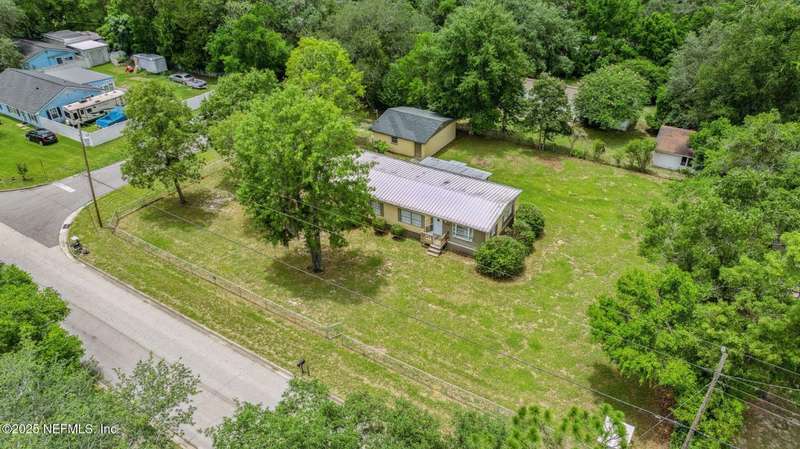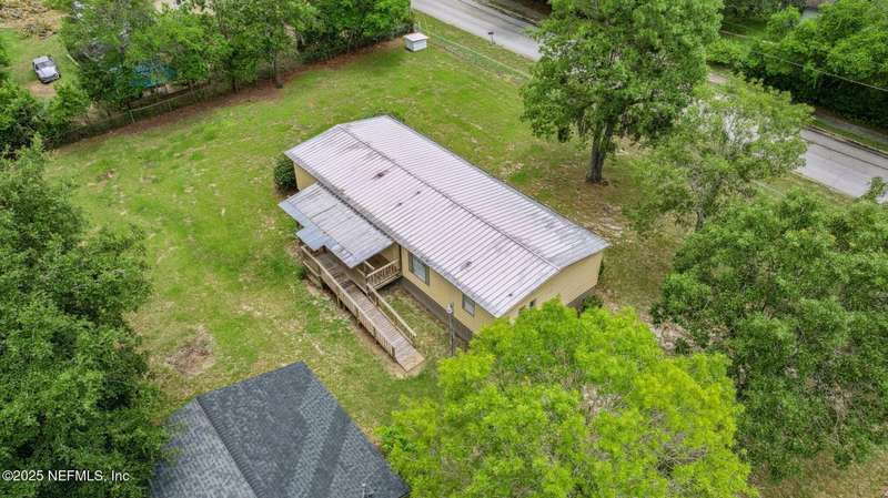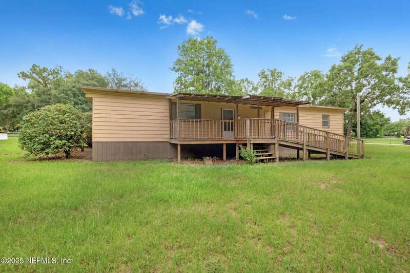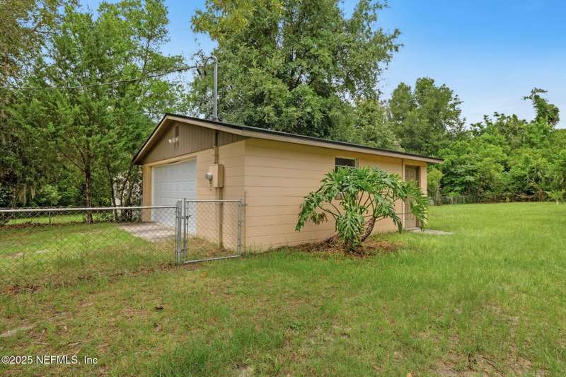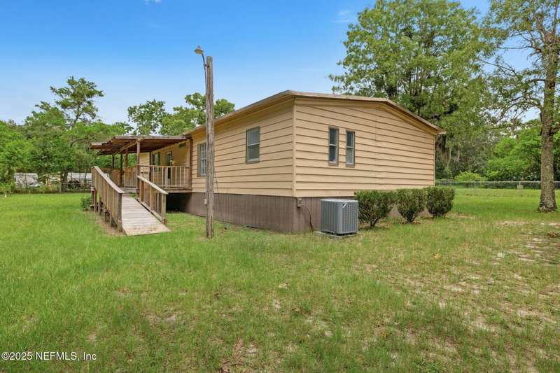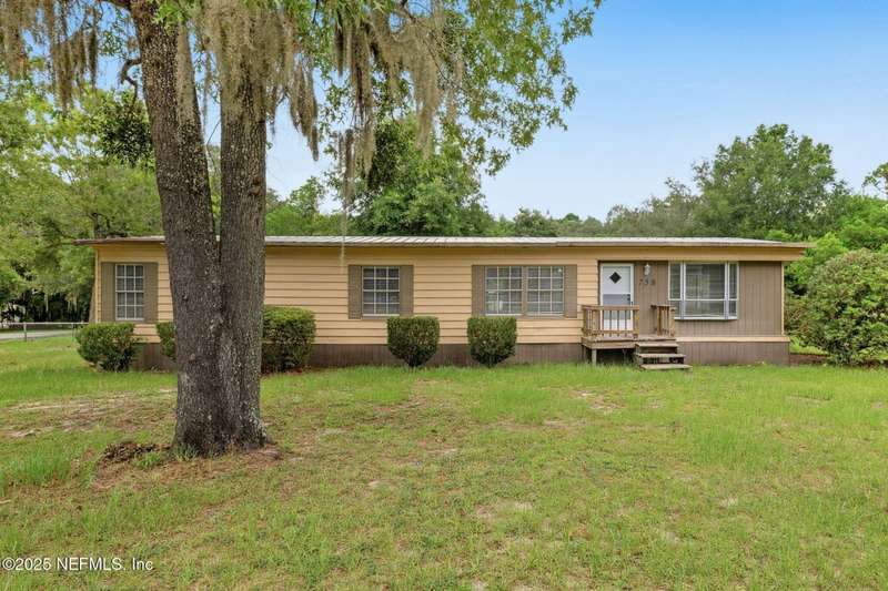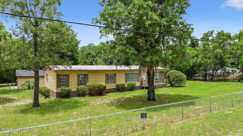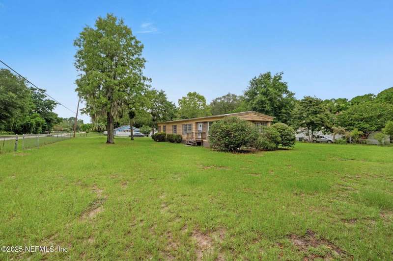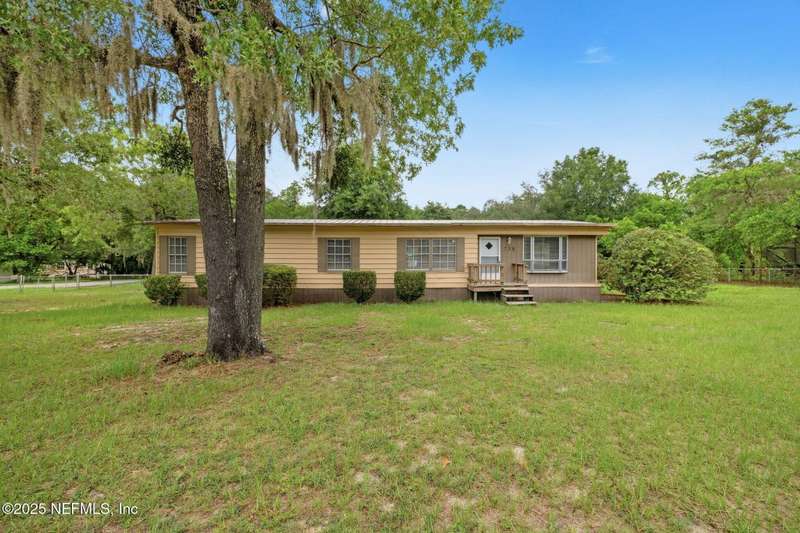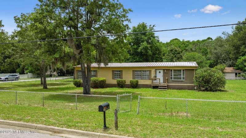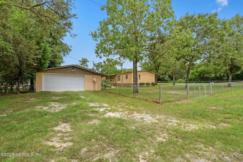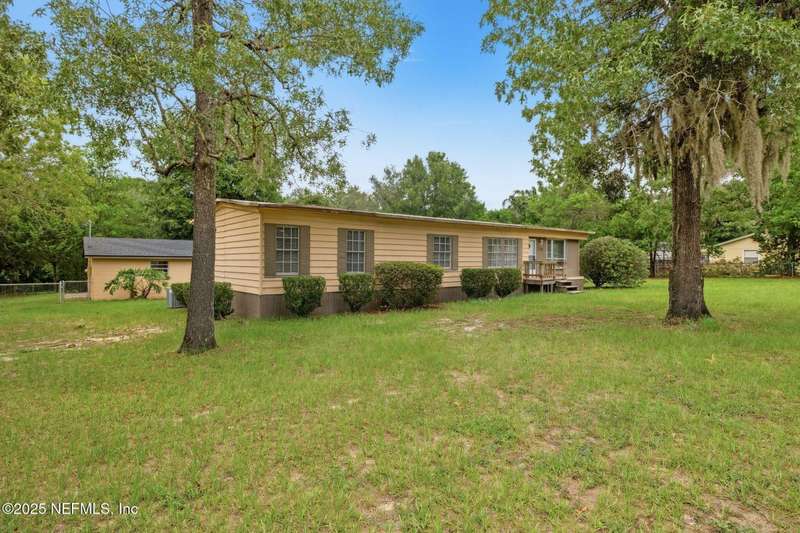 Country Living with City Convenience! This charming 3-bedroom, 2-bath, 1,452 SF double-wide mobile home sits on a spacious 1/2-acre corner lot in desirable Clay County near Doctors Lake. Enjoy peaceful surroundings with easy access to shopping, dining, and major roadways.The open-concept living and dining areas are filled with natural light. The cozy living room features an electric fireplace with a built-in heater, while the dining room includes a convenient built-in hutch. The kitchen is well-equipped with GE stainless steel appliances, white shaker-style cabinets, granite countertops, a breakfast bar, a stylish glass tile backsplash, and an undermount stainless steel sink.The spacious owner's suite offers a private retreat with an ensuite bath featuring a garden tub, separate shower, and granite vanity. Two additional bedrooms share a well-appointed hall bath with granite countertop.Waterproof vinyl plank flooring runs throughout the home with moisture barrier underlayment. Interior freshly painted in 2022. Newer 50-gallon electric water heater. Private well and septic system in place.Outdoor features include a covered back deck with a wheelchair-accessible ramp and a fully fenced 1/2-acre yard with chain-link fencing. A detached 2.5-car concrete block garage includes an automatic opener and a newer, permitted roof.Cash only.