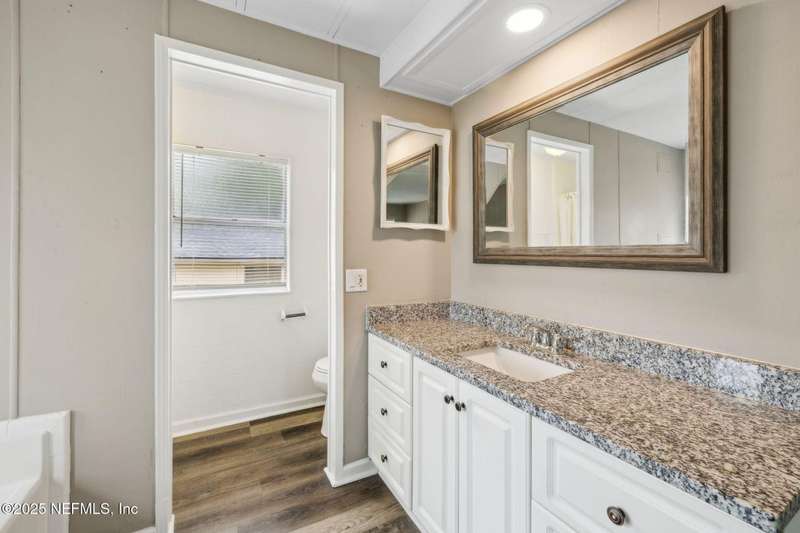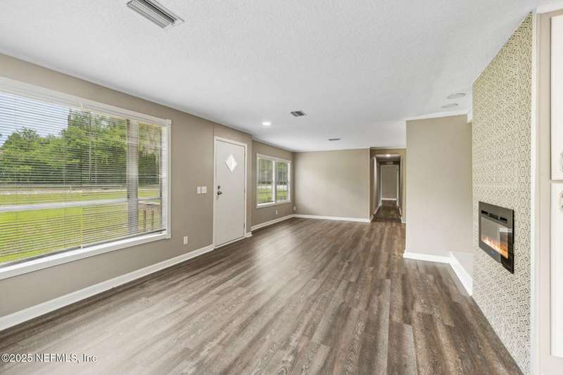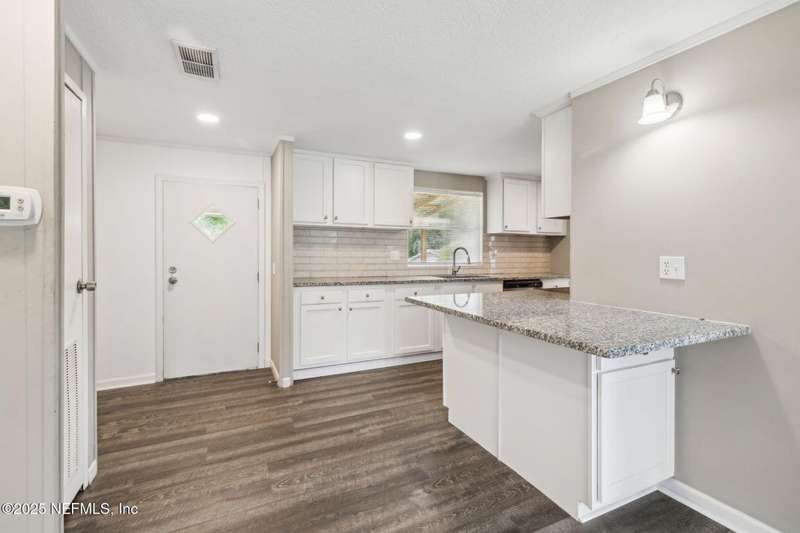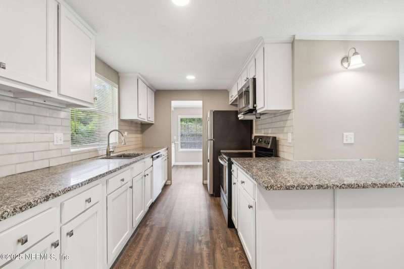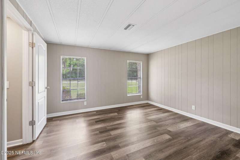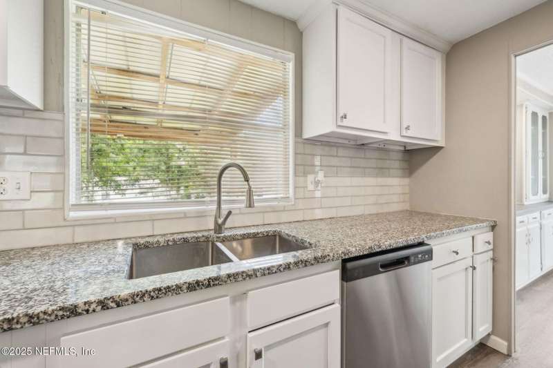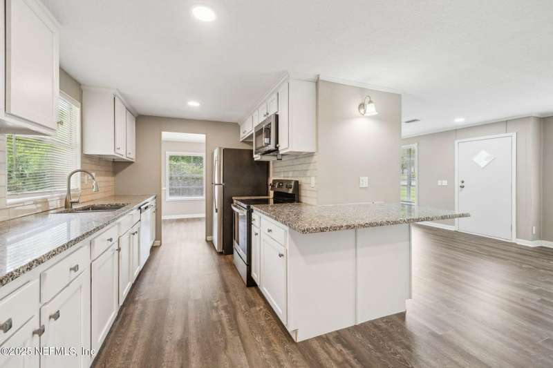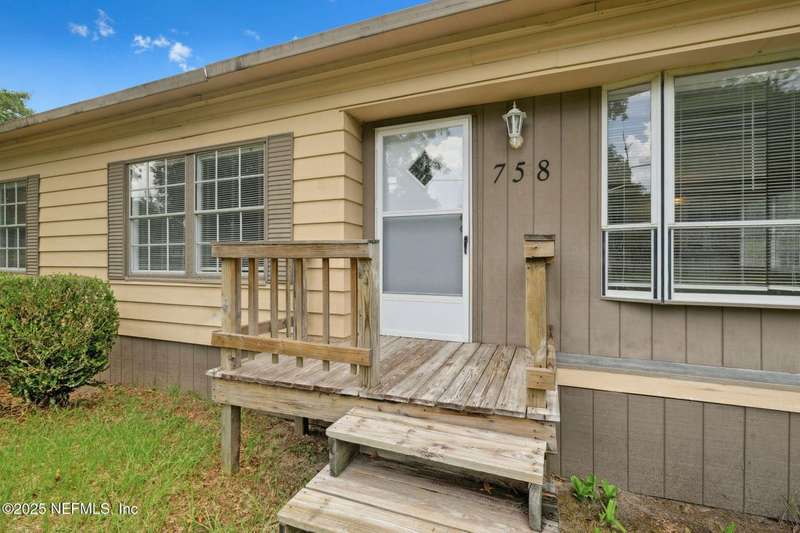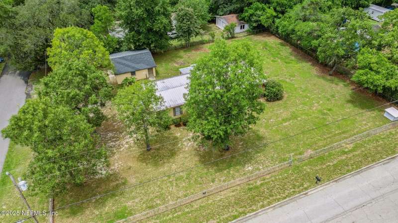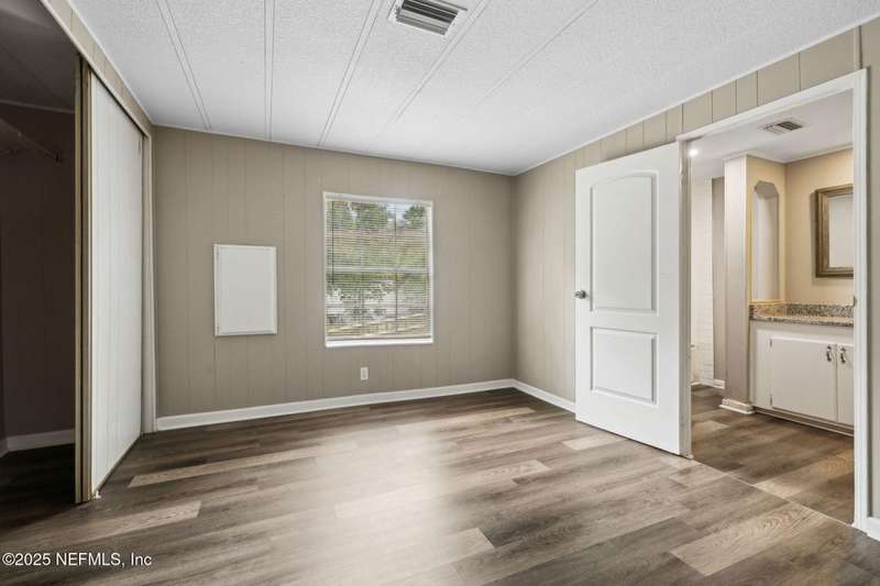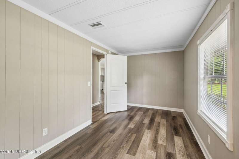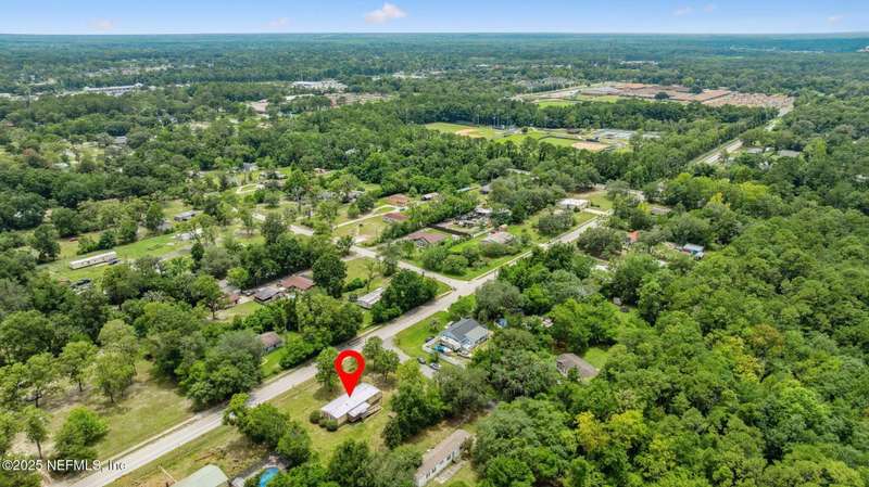 Country Living with City Convenience! This charming 3-bedroom, 2-bath, 1,452 SF double-wide mobile home sits on a spacious 1/2-acre corner lot in desirable Clay County near Doctors Lake. Enjoy peaceful surroundings with easy access to shopping, dining, and major roadways.The open-concept living and dining areas are filled with natural light. The cozy living room features an electric fireplace with a built-in heater, while the dining room includes a convenient built-in hutch. The kitchen is well-equipped with GE stainless steel appliances, white shaker-style cabinets, granite countertops, a breakfast bar, a stylish glass tile backsplash, and an undermount stainless steel sink.The spacious owner's suite offers a private retreat with an ensuite bath featuring a garden tub, separate shower, and granite vanity. Two additional bedrooms share a well-appointed hall bath with granite countertop.Waterproof vinyl plank flooring runs throughout the home with moisture barrier underlayment. Interior freshly painted in 2022. Newer 50-gallon electric water heater. Private well and septic system in place.Outdoor features include a covered back deck with a wheelchair-accessible ramp and a fully fenced 1/2-acre yard with chain-link fencing. A detached 2.5-car concrete block garage includes an automatic opener and a newer, permitted roof.Cash only.