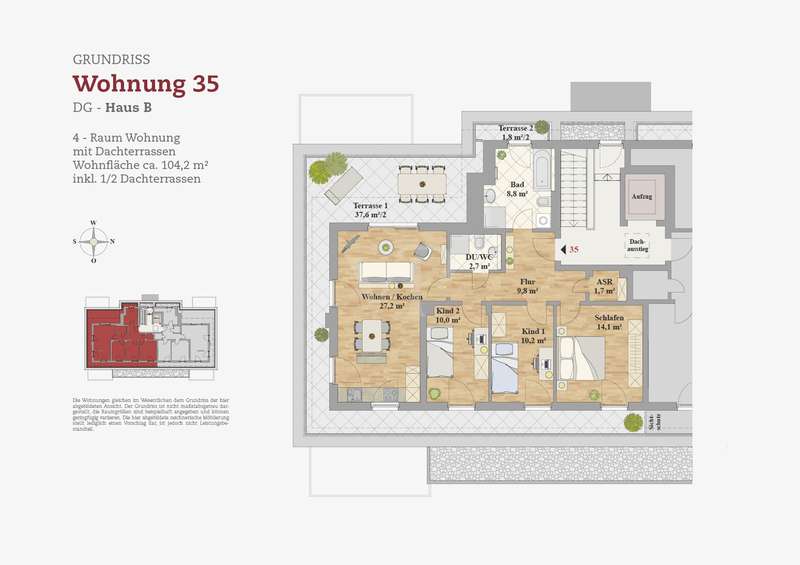 An exclusive top-floor apartment (No. 35, House B) with modern architecture is for sale, with completion scheduled for 2026. This property is in the "HausImBau" construction phase and is characterized by high-quality fittings and pioneering technologies. Apartment no. 35 in House B offers a generous living space of approx. 104.2 m², including an attractive roof terrace that rounds off the living experience. This modern apartment has a total of four optimally designed rooms, including a large, light-flooded living room combined with an open-plan kitchen and direct access to the roof terrace. This creates a harmonious sense of space that invites you to relax and socialize. The master bedroom and the two children's bedrooms are also bright and can be used flexibly to meet individual needs. The bathroom is equipped with both an elegant bathtub and floor-to-ceiling showers for maximum comfort. An additional guest WC increases the functionality of the apartment. Floor-to-ceiling windows let in plenty of natural light and, together with the underfloor heating, ensure a pleasant living atmosphere. High-quality ceramic tiles and real wood parquet give the rooms a sophisticated look. The property is equipped with an environmentally friendly solar system that contributes to energy efficiency, while electric shutters increase comfort and privacy. A modern elevator in the stairwell provides barrier-free access to all floors. The apartment also has its own underground parking space and a separate cellar compartment, which offer additional storage space and make everyday organization easier. The detailed and well thought-out room layout, combined with the high-quality fittings, make these apartments particularly attractive for families. The central heating system provides cozy warmth and enables efficient energy consumption. If you are looking for a modern, high-quality property in an attractive location, this new-build apartment offers the ideal solution. Our team will be happy to provide you with further information or arrange a viewing appointment. Take the opportunity to become part of this forward-looking residential project. FROM POLL DRESDEN Henrik Otto (business economist) I henrik.otto@von-poll.com