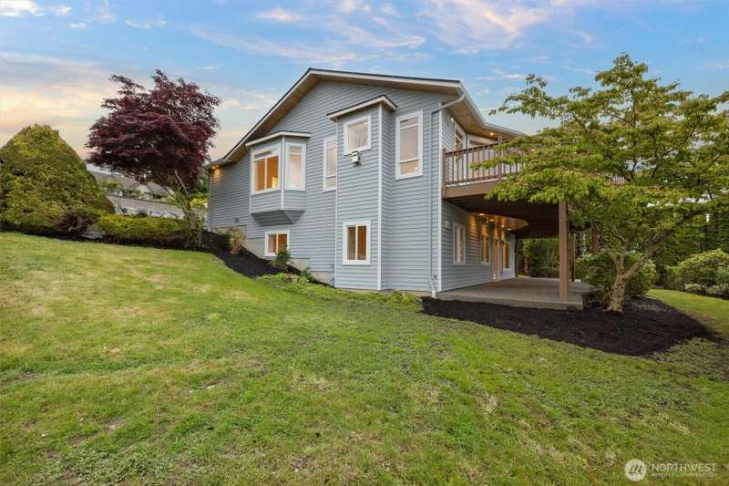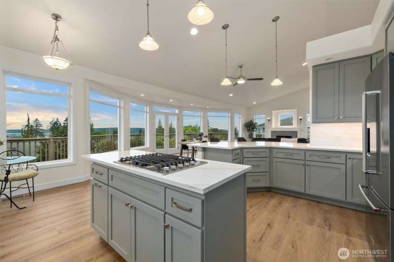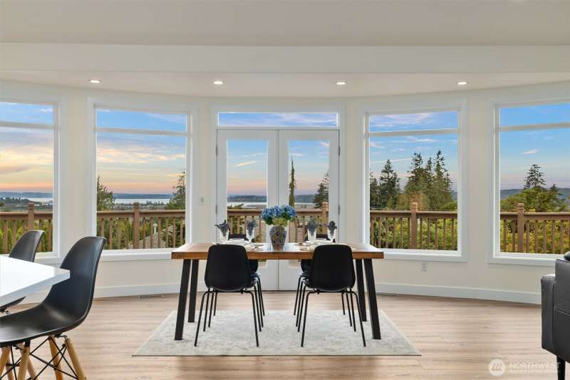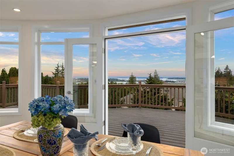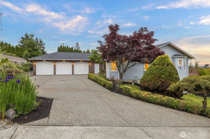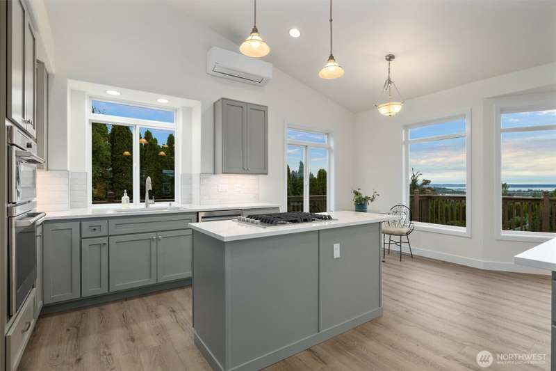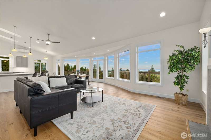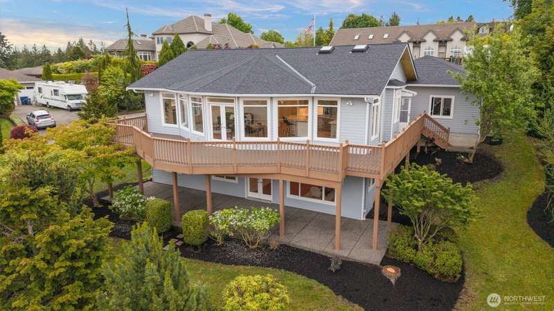 ~ Sit back and enjoy the view ~ Perched on an upscale hillside, this thoughtfully updated home enjoys panoramic views of the bay & Olympic Mountains. The open-concept kitchen/living is a chef’s dream — soak in the seascapes while using the stainless steel appliances, expansive quartz countertops, and ample cabinets. On the main floor, the primary suite welcomes you through French doors with a walk-in closet and elegant 5-piece bath. Downstairs offers a spacious flex space, 2 beds, den, ¾ bath, and utility room. Outside, enjoy sunsets on the Trex deck or shaded patio below for peaceful solitude. The large garage has 3 bays and a workspace, the perfect home for all your projects. Tucked away but connected, elevate your everyday.