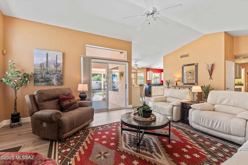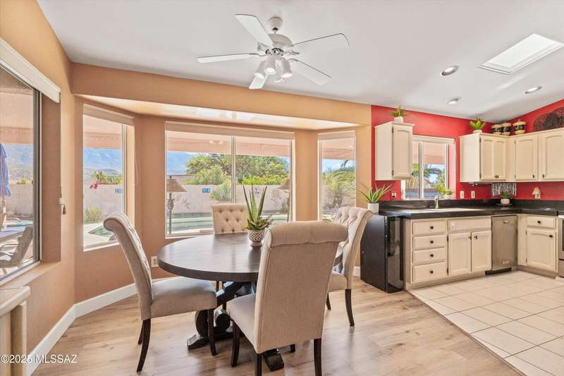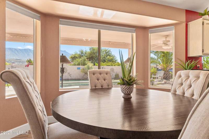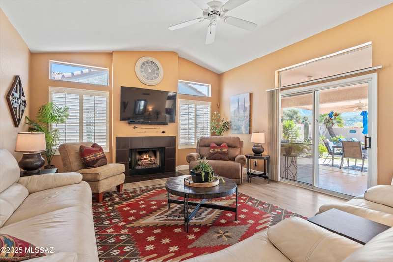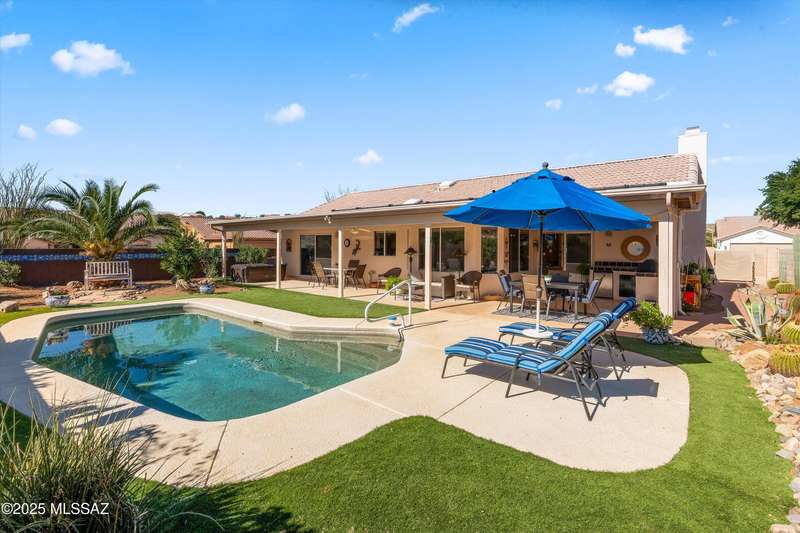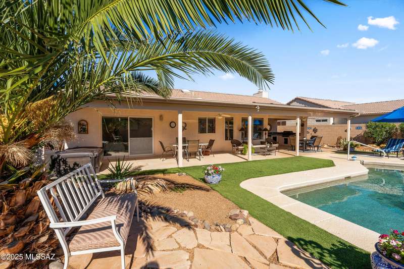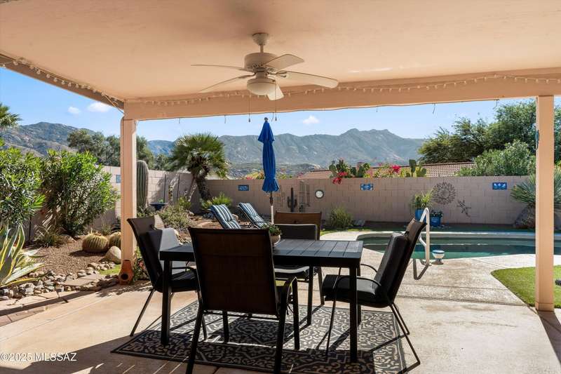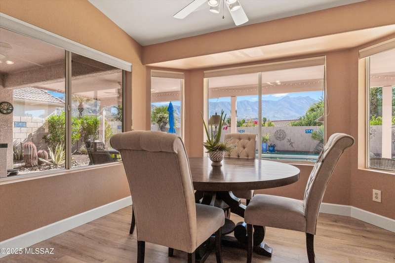 This Sonora model home sits on a high corner lot with impressive curb appeal. From the moment you step inside, you're greeted by stunning mountain views. The expansive great room seamlessly connects to a bright dining space, where large windows frame the backyard, pool, and mountain vistas beyond. In the galley kitchen, you'll find granite countertops and stainless steel appliances. The primary suite offers convenient access to the patio and hot tub, along with an updated en-suite bathroom featuring a spacious shower, dual vanity, and walk-in closet. A well-appointed guest room and bathroom add comfort and functionality. Step outside to an entertainer's paradise: enjoy a built-in BBQ, an extended covered patio, and a pool surrounded by lush landscaping and the scenic Catalina mountains in