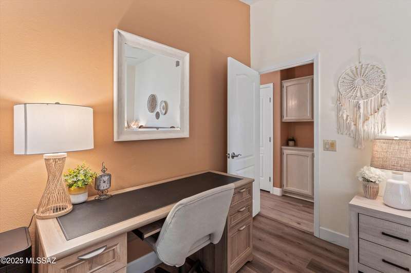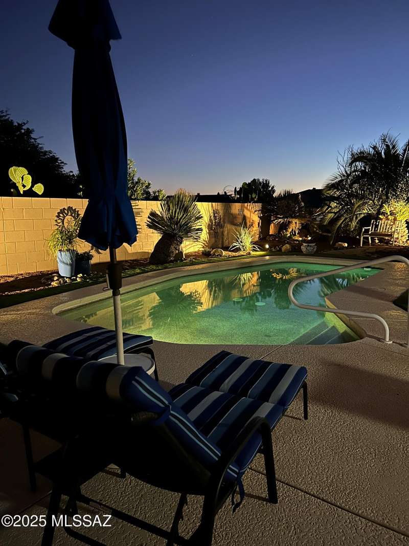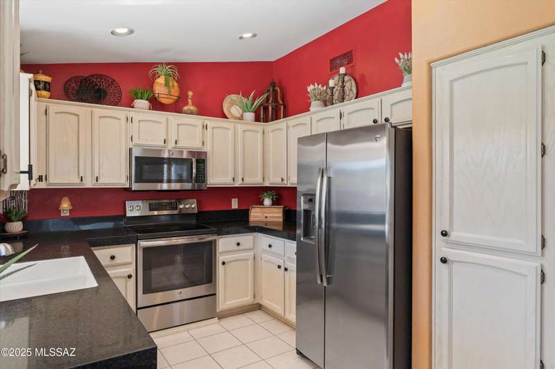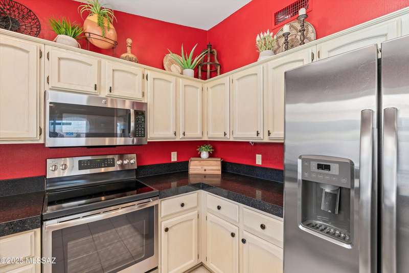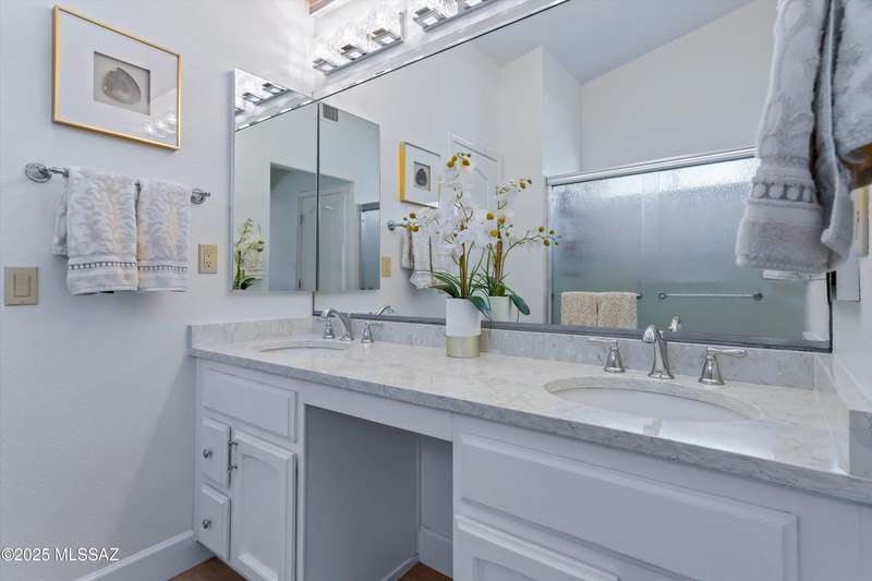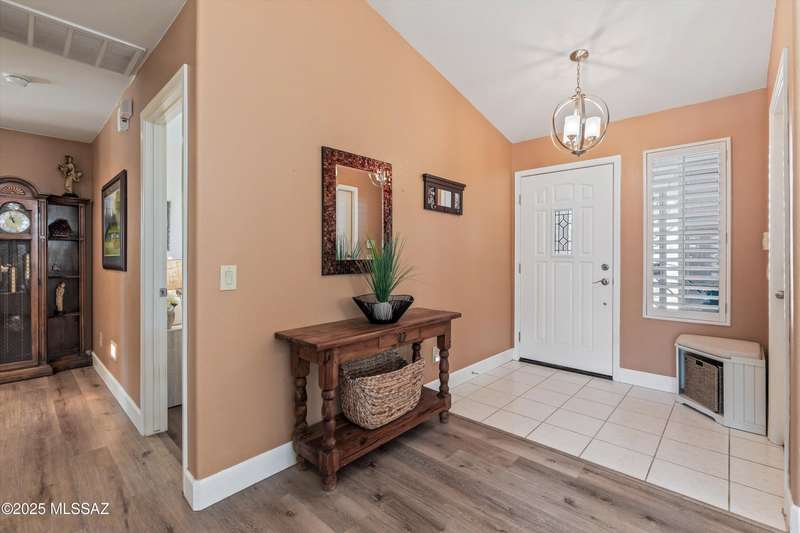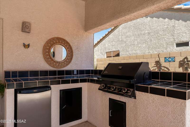 This Sonora model home sits on a high corner lot with impressive curb appeal. From the moment you step inside, you're greeted by stunning mountain views. The expansive great room seamlessly connects to a bright dining space, where large windows frame the backyard, pool, and mountain vistas beyond. In the galley kitchen, you'll find granite countertops and stainless steel appliances. The primary suite offers convenient access to the patio and hot tub, along with an updated en-suite bathroom featuring a spacious shower, dual vanity, and walk-in closet. A well-appointed guest room and bathroom add comfort and functionality. Step outside to an entertainer's paradise: enjoy a built-in BBQ, an extended covered patio, and a pool surrounded by lush landscaping and the scenic Catalina mountains in