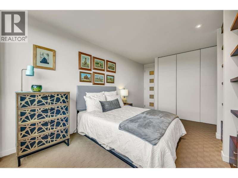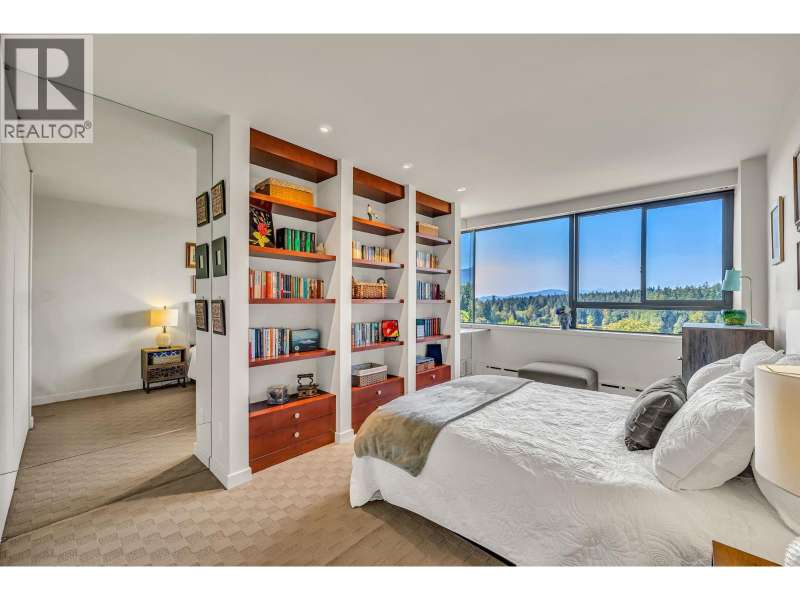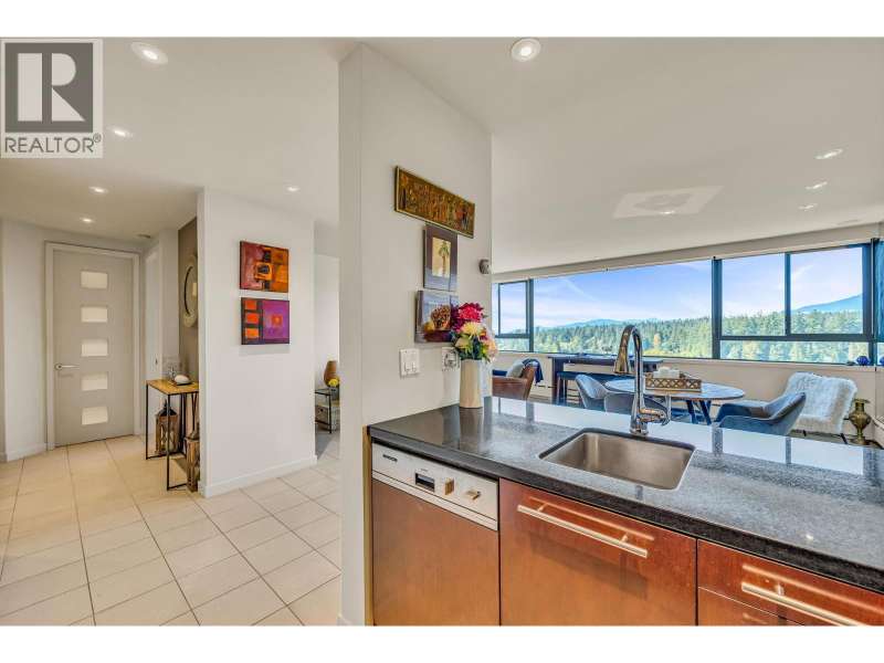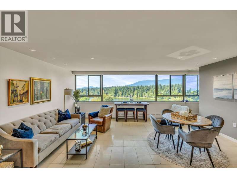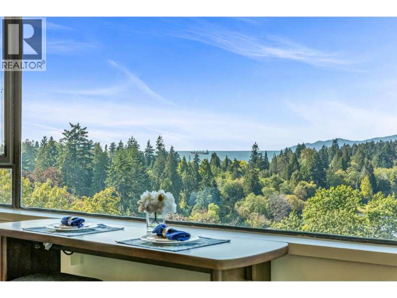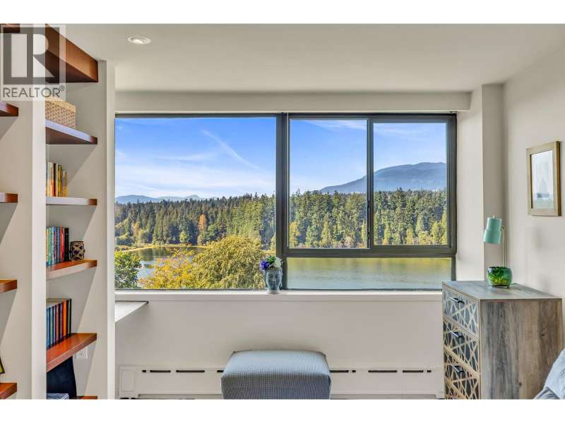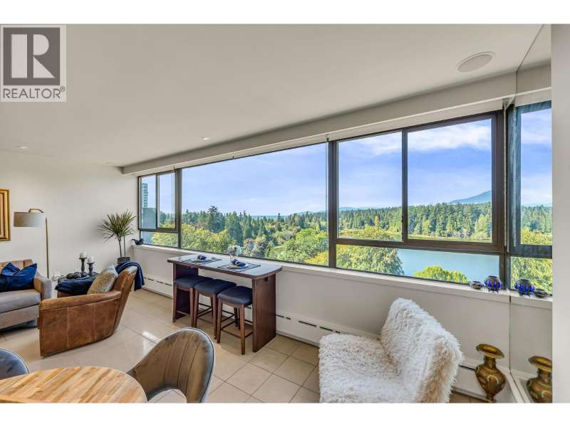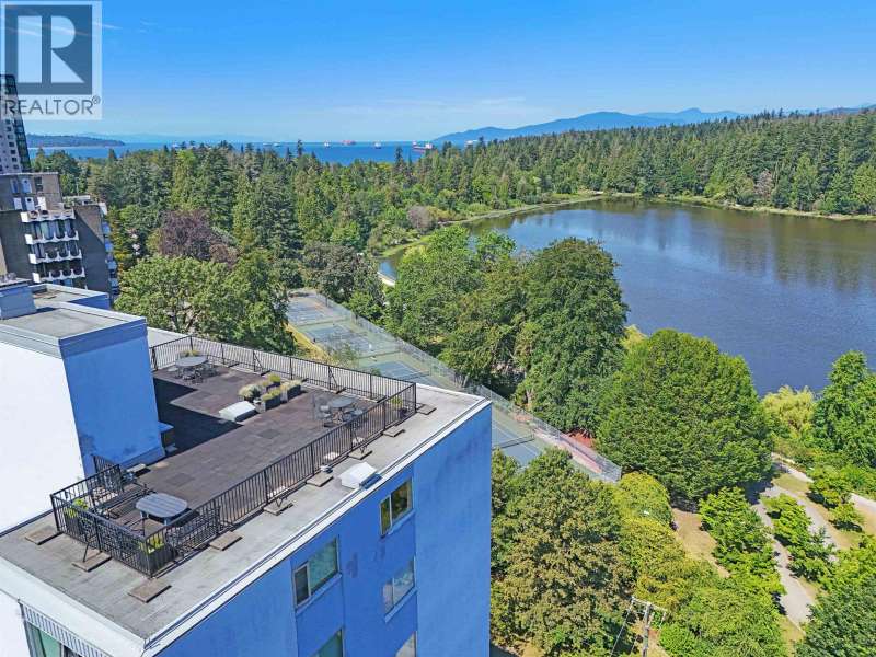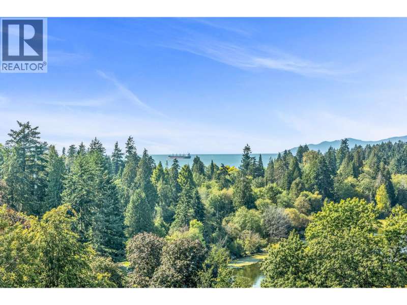 Experience urban living right next to 1,000 acres of lush forest! This top-floor, open-plan 1 BR home delights with truly stunning, unobstructed vistas sweeping over Lost Lagoon, N.S Mnts, and the freighters. Custom millwork throughout, hideaway TV cabinet, ceiling speakers, and art lighting. Perfect for entertaining, the living/dining/kitchen area lets you soak in those breathtaking scenes from every angle. The XL bedroom features built-in drawers and a beautifully finished closet, complemented by a luxurious bath with a heated floor. Step outside to endless recreation: the Seawall, tennis courts, and bike trails. Abundant visitor parking, plus a spectacular roofdeck just upstairs. Includes storage, indoor parking. No pets, no rental, 19+. Private viewings by app. (id:58403)