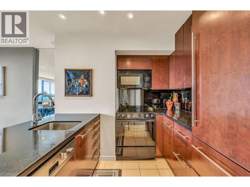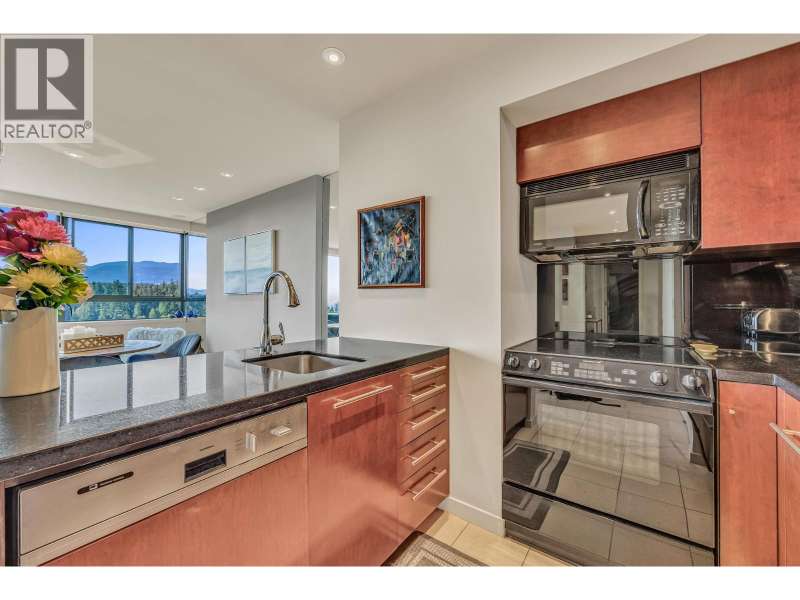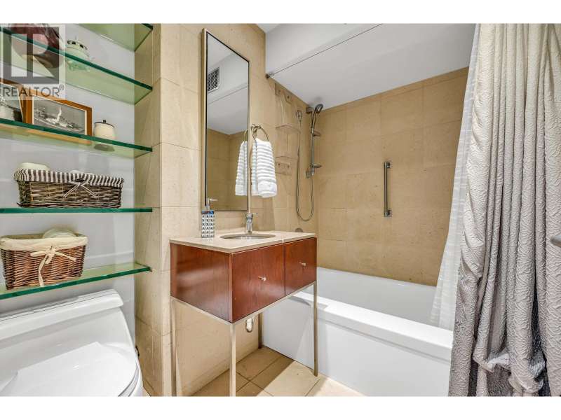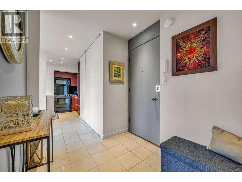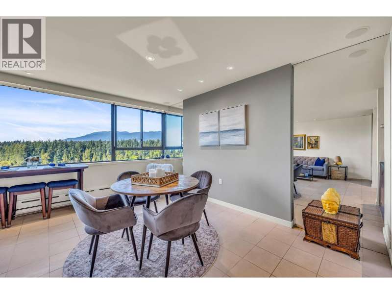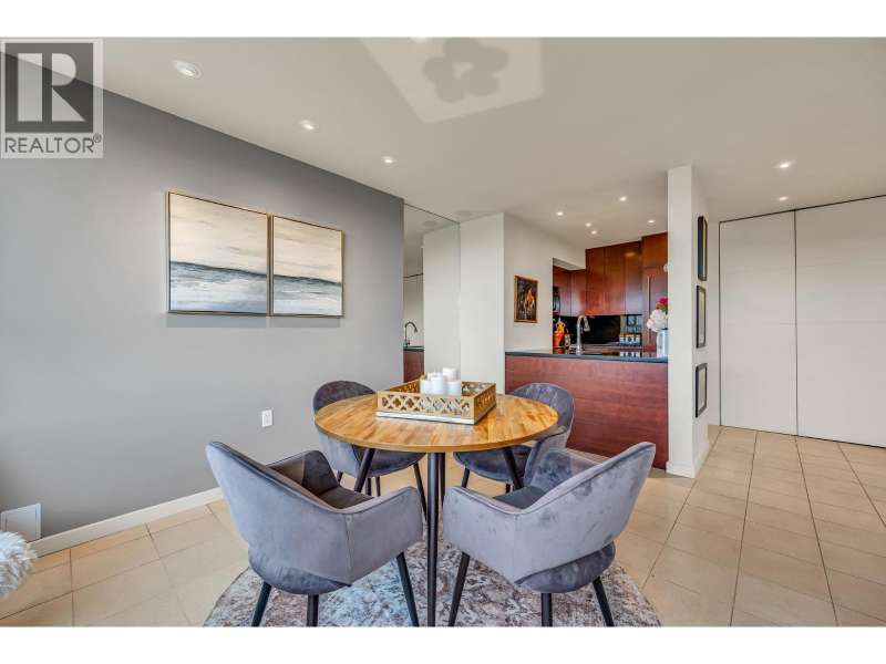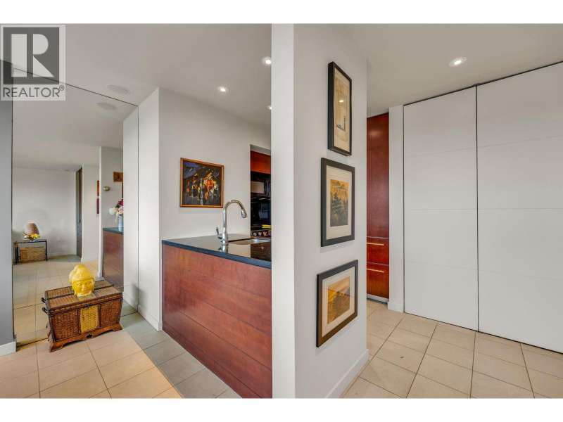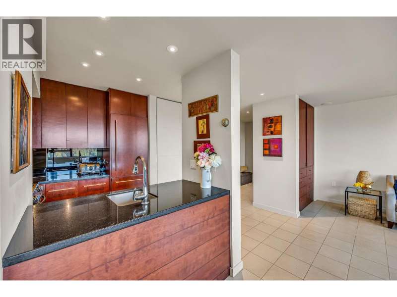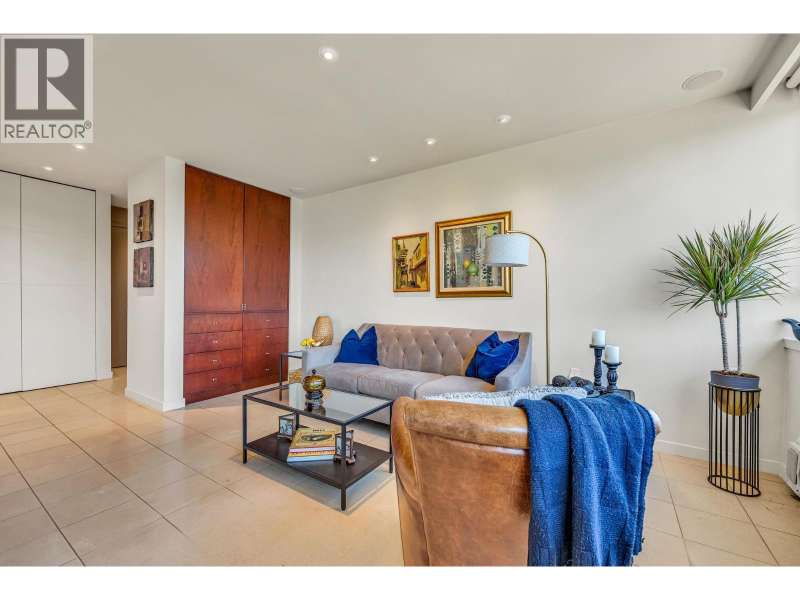 Experience urban living right next to 1,000 acres of lush forest! This top-floor, open-plan 1 BR home delights with truly stunning, unobstructed vistas sweeping over Lost Lagoon, N.S Mnts, and the freighters. Custom millwork throughout, hideaway TV cabinet, ceiling speakers, and art lighting. Perfect for entertaining, the living/dining/kitchen area lets you soak in those breathtaking scenes from every angle. The XL bedroom features built-in drawers and a beautifully finished closet, complemented by a luxurious bath with a heated floor. Step outside to endless recreation: the Seawall, tennis courts, and bike trails. Abundant visitor parking, plus a spectacular roofdeck just upstairs. Includes storage, indoor parking. No pets, no rental, 19+. Private viewings by app. (id:58403)
