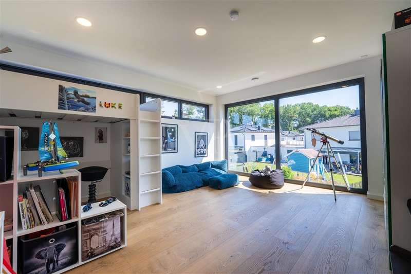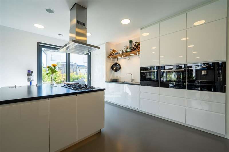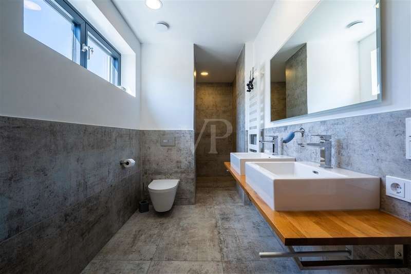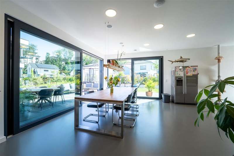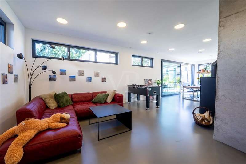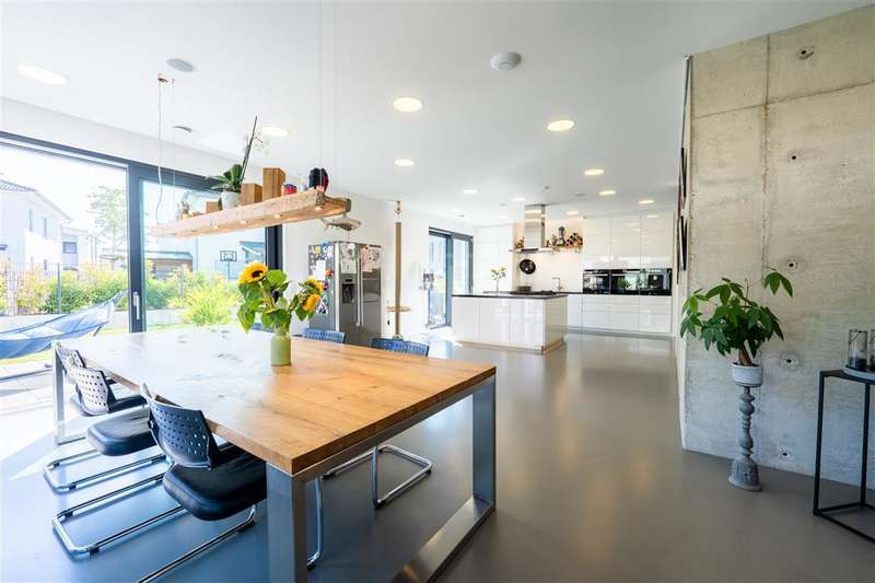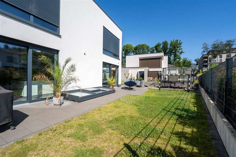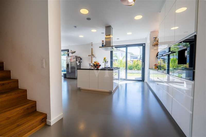 In the sought-after Quartier Süd of Montabaur, one of the most sought-after residential areas in the region, this high-quality architect-designed home awaits you with impressive living and usable space, state-of-the-art technology and exceptional design. Built in 2021, the detached house offers exclusive living comfort on a plot of approx. 582 m² in a quiet and family-friendly location - with perfect connections to the city center, ICE train station and nature. Highlights at a glance: - Large double garage, insulated, with additional storage area, a shaft into the basement & integrated wallbox - Open-plan kitchen with granite worktop, gas hob & high-quality brand-name appliances - Open-plan living/dining area with high ceilings, high-quality industrial flooring (Senso flooring), oak parquet flooring & large sliding elements - Triple glazing with 4-fold mushroom head locking, electric shutters & external venetian blinds - High-quality fittings with Hans Grohe taps, Laufen sanitary ware Smart. Sustainable. Self-sufficient. - 15 kW photovoltaic system + 10 kW battery storage - ideal for self-consumption - Air heat pump with underfloor heating and cooling function throughout the house & basement - Water-bearing fireplace for cozy warmth - Controlled ventilation system & complete network cabling - Outdoor cameras for a sophisticated security concept Full basement - more than just storage space The basement impresses with full room height, underfloor heating and a white tank with additional 10 cm external insulation. Two daylight-flooded rooms with skylights (looking out into the garden) offer flexible usage options - e.g. as guest rooms, offices or hobby rooms. One room is also acoustically decoupled and can therefore also be used for louder instruments such as drums - a highlight for music lovers. A separate wellness area with a prepared sauna connection and adjoining bathroom, shower and Kneipp hose is an inviting retreat. Outdoor area - stylish and functional - Cistern (10,000 l) for watering the garden + fully automatic Gardena irrigation system - Lifting system for cellar water drainage - Large-format patio slabs from Zena - Property almost completely enclosed with gabions Privacy on all levels The exclusive parents' area with bedroom, dressing room and en-suite bathroom is located on the top floor. Two spacious children's rooms with floor-to-ceiling, fixed windows and a separate children's bathroom round off the space perfectly. A home that impresses in every respect - architecturally sophisticated, technically state-of-the-art and with a level of living comfort that is second to none. Move in, enjoy, arrive - in one of the best residential areas in Montabaur.