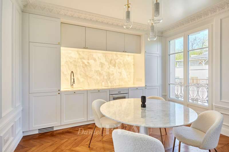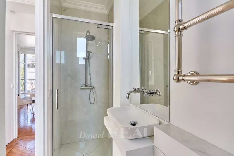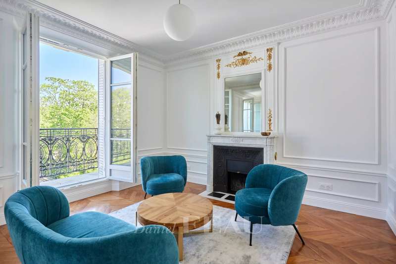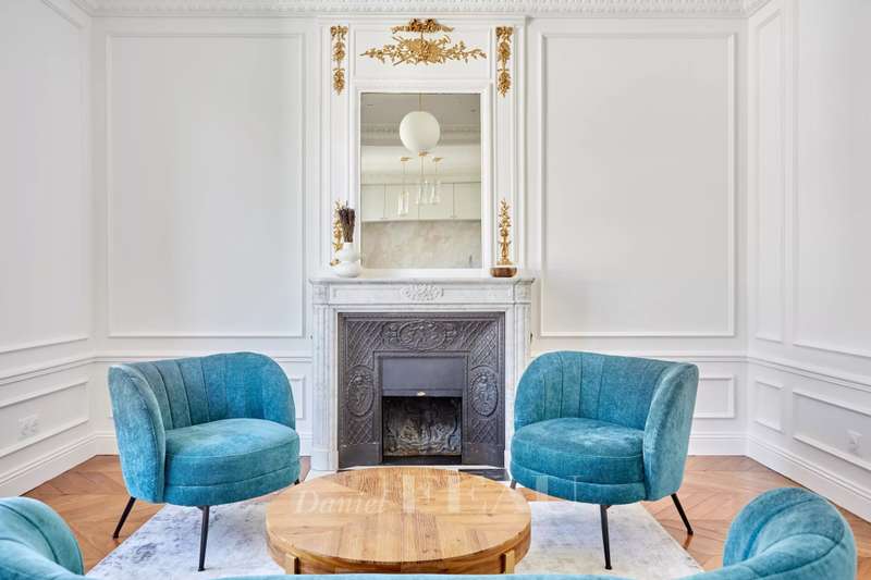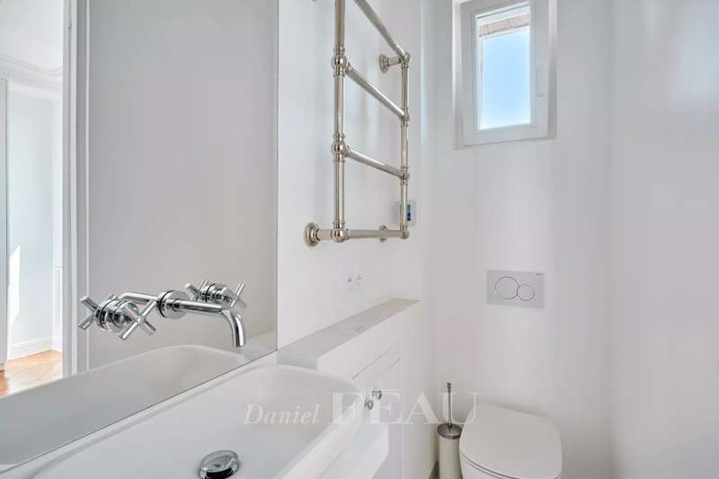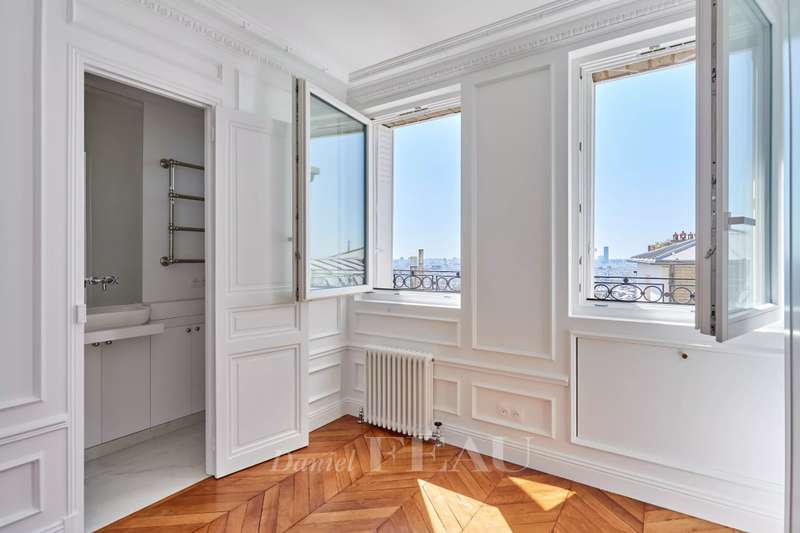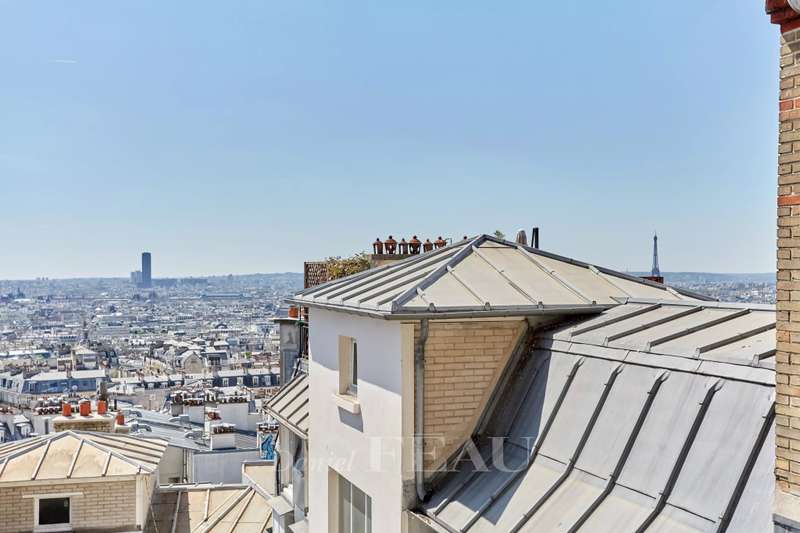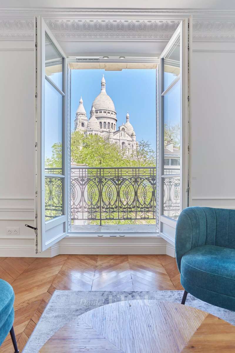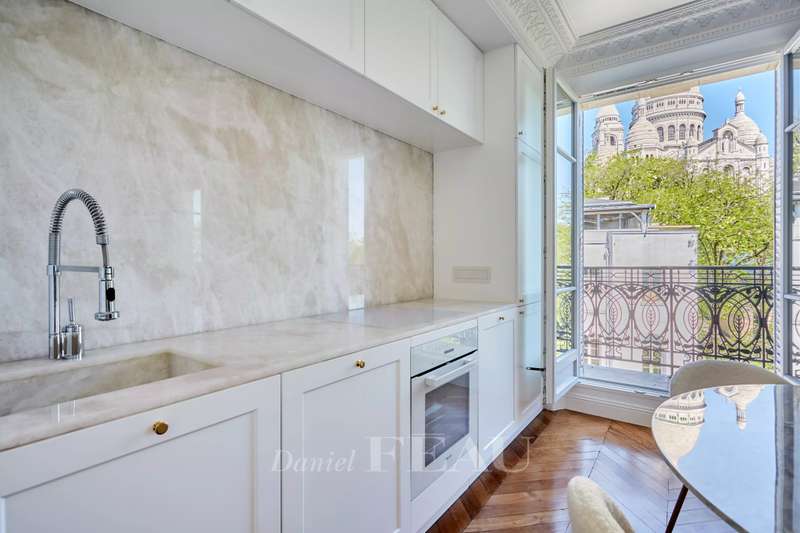 This bright dual-aspect apartment is on the 5th floor of a fine early 20th century building with a lift located in the heart of historic Montmartre. Meticulously renovated throughout, it includes an entry with fitted storage space, a living/reception room with an open-plan kitchen opening onto a continuous balcony commanding exceptional views of Sacré-Coeur Basilica, a bedroom enjoying a view of the Eiffel Tower, a shower room and an adjacent wc. Period features include parquet flooring, mouldings and a fireplace. With a cellar.