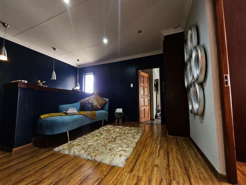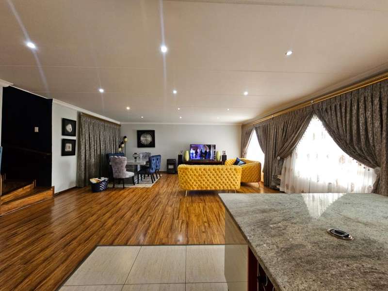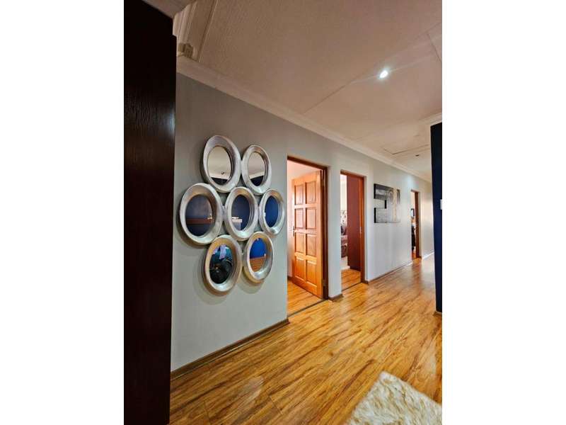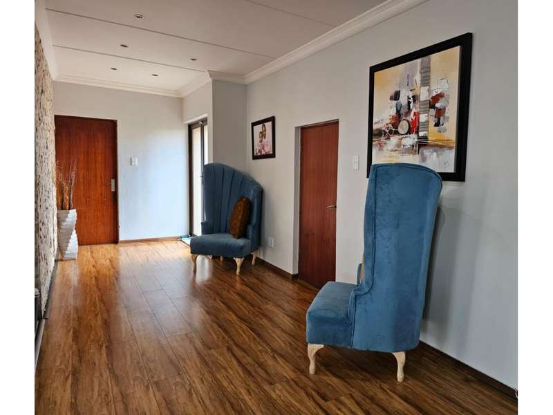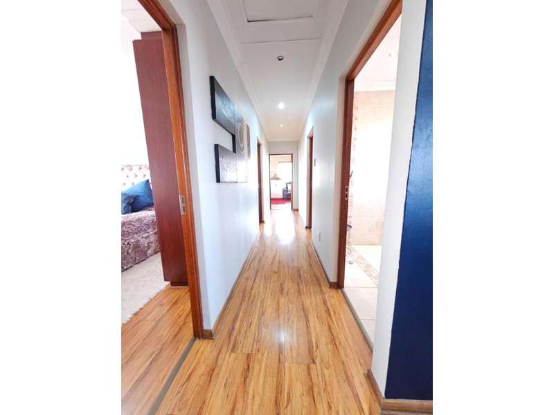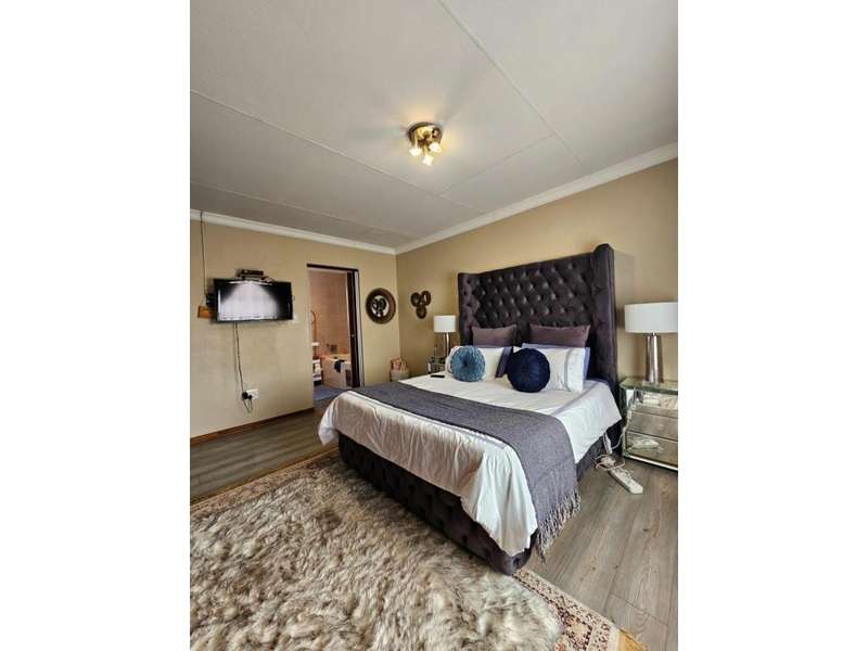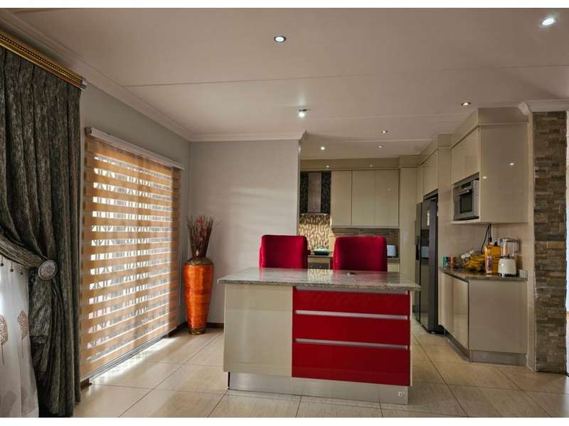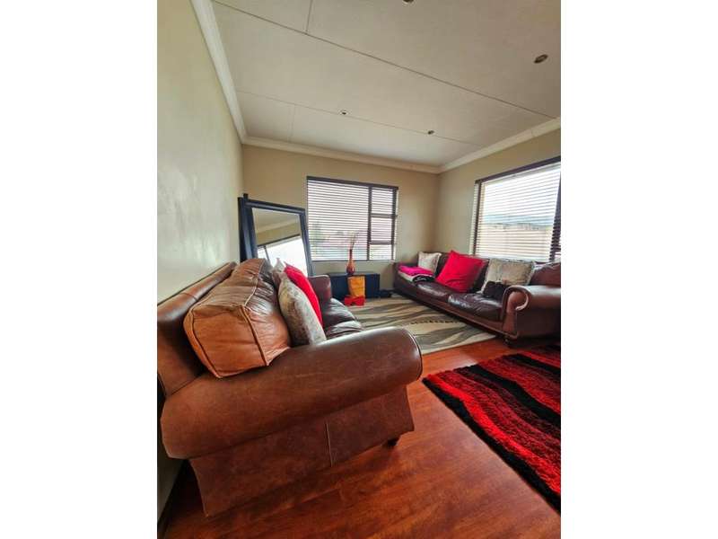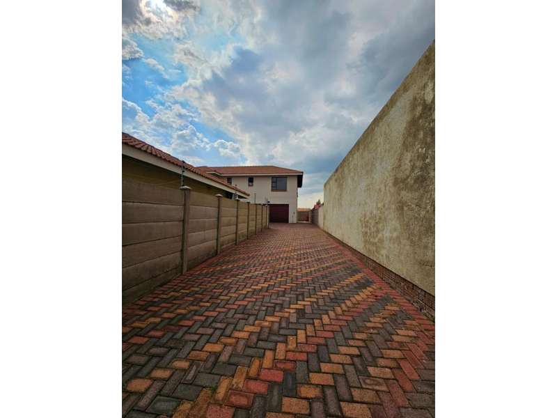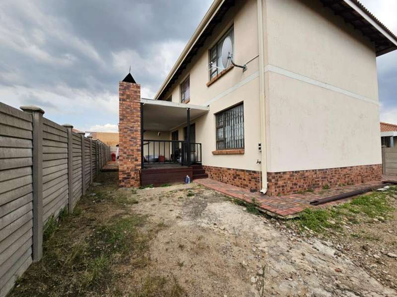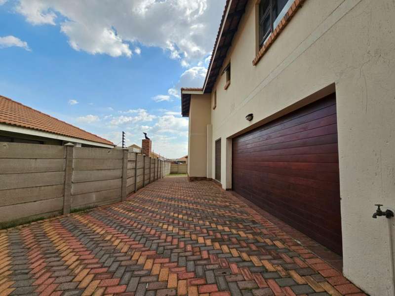 Welcome to this stunning double-story 5-bedroom, 2.5-bathroom home with a double-door garage. As you step through the aluminum double-glass doors, you're welcomed into a beautiful entrance hall adorned with clay walls and wooden floors leading seamlessly into the dining and lounge areas. To your right, the high gloss kitchen with a scullery offers modern convenience, complete with an electric stove, double-door fridge space, and a kitchen nook. The scullery also provides easy access to the back of the house. Ascending the wooden stairs, Stairs walls painted in regal royal blue, you'll find a cozy pyjama lounge and additional cupboards for storage. The left wing of the upper floor boasts the luxurious main bedroom, complete with an ensuite featuring a full bathroom with a shower, bathtub, toilet, and his-and-her basins. Continuing down the long, beautiful passage, you'll find three bedrooms, each with built-in cupboards, along with a separate toilet and basin. The family bathroom, complete with a bathtub, toilet, and basin, offers convenience for the entire household. At the end of the passage, the fifth bedroom includes a study area, perfect for quiet productivity. Outside, there's ample space for outdoor entertainment and the potential to add a pool, while the back of the house features an entertainment area with a built-in braai. For added security, the home is equipped with an alarm system, electric fence, and sensor beams, providing peace of mind. With enough parking space within the yard, this home offers both comfort and security for modern living.