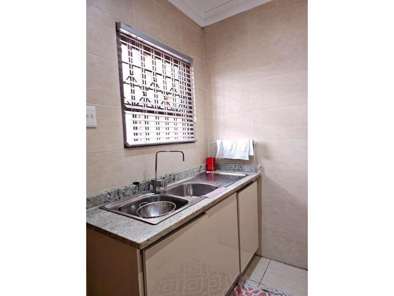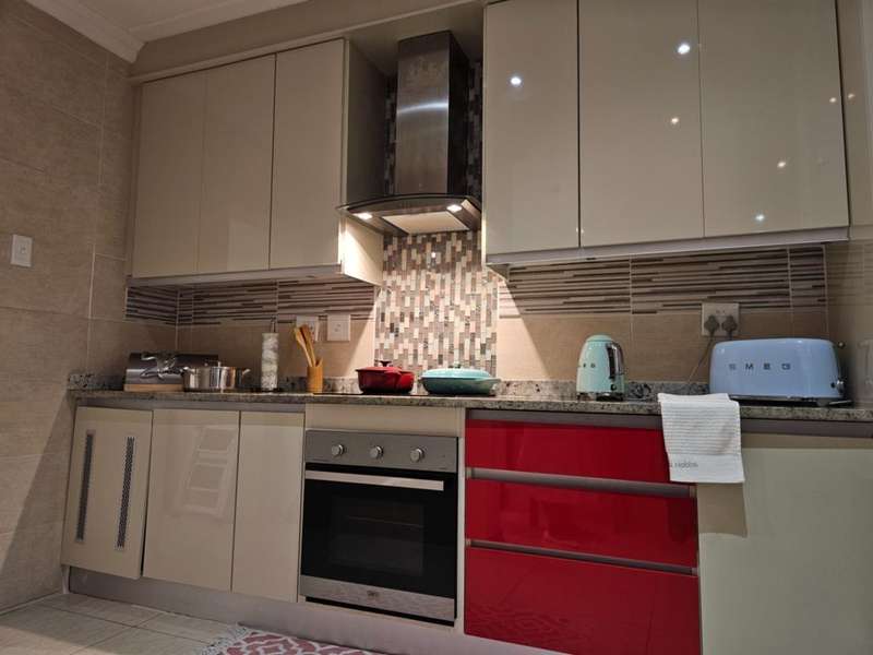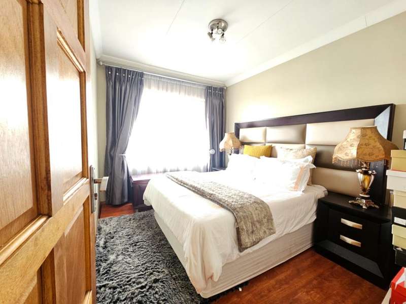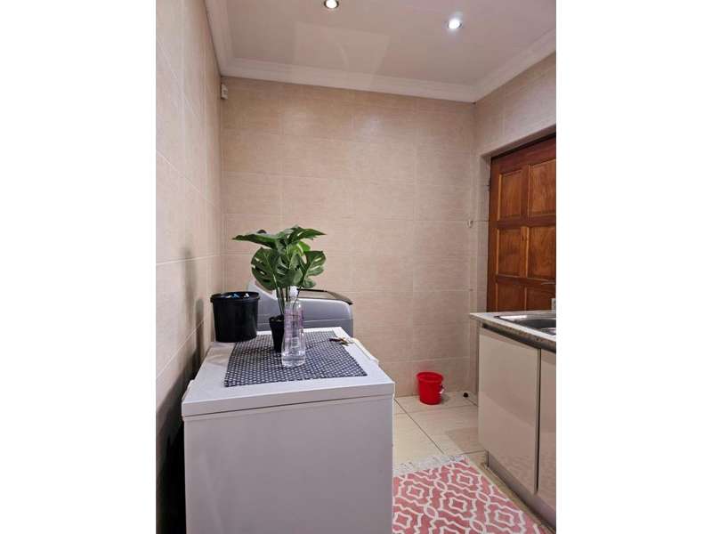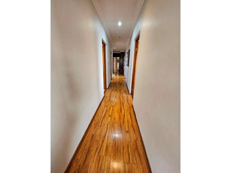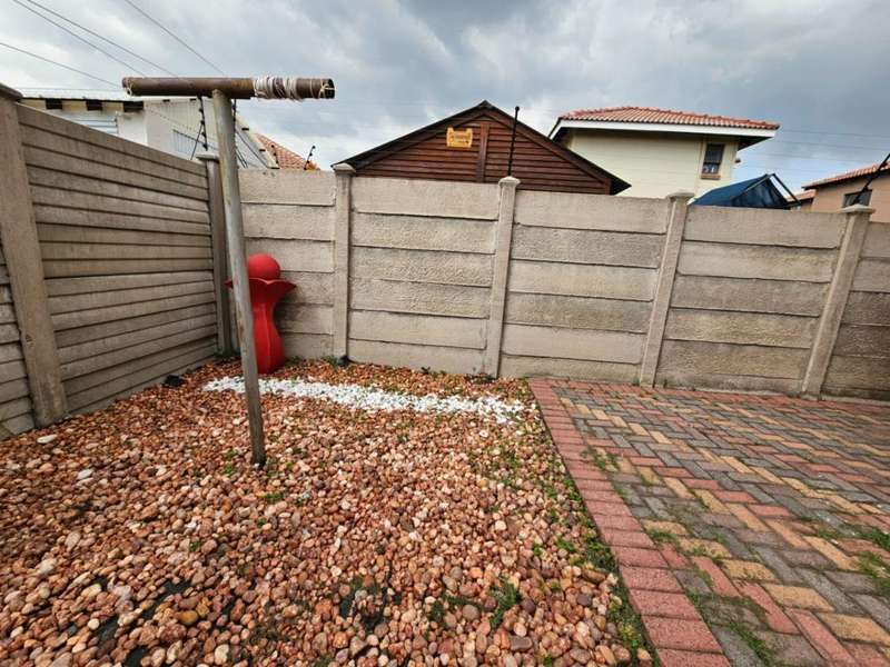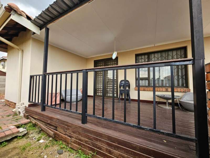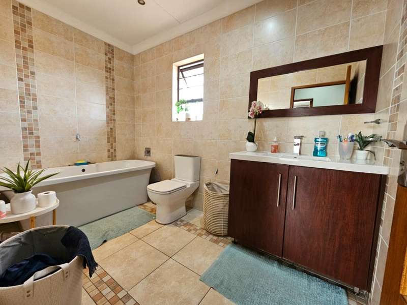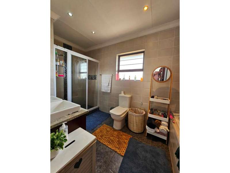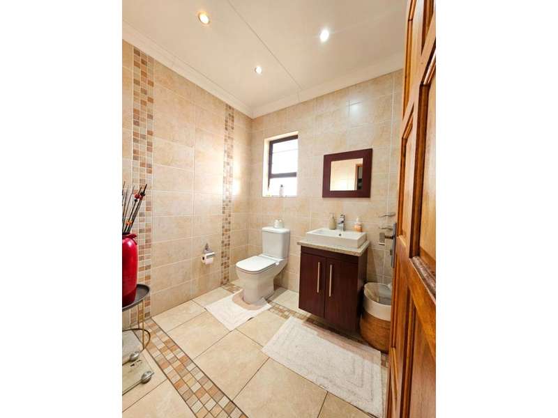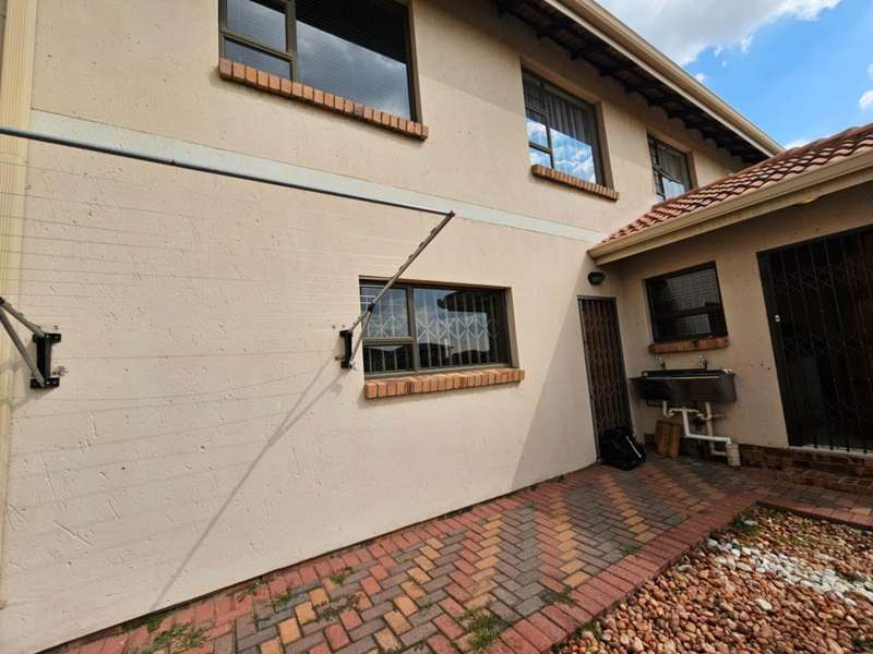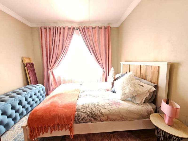 Welcome to this stunning double-story 5-bedroom, 2.5-bathroom home with a double-door garage. As you step through the aluminum double-glass doors, you're welcomed into a beautiful entrance hall adorned with clay walls and wooden floors leading seamlessly into the dining and lounge areas. To your right, the high gloss kitchen with a scullery offers modern convenience, complete with an electric stove, double-door fridge space, and a kitchen nook. The scullery also provides easy access to the back of the house. Ascending the wooden stairs, Stairs walls painted in regal royal blue, you'll find a cozy pyjama lounge and additional cupboards for storage. The left wing of the upper floor boasts the luxurious main bedroom, complete with an ensuite featuring a full bathroom with a shower, bathtub, toilet, and his-and-her basins. Continuing down the long, beautiful passage, you'll find three bedrooms, each with built-in cupboards, along with a separate toilet and basin. The family bathroom, complete with a bathtub, toilet, and basin, offers convenience for the entire household. At the end of the passage, the fifth bedroom includes a study area, perfect for quiet productivity. Outside, there's ample space for outdoor entertainment and the potential to add a pool, while the back of the house features an entertainment area with a built-in braai. For added security, the home is equipped with an alarm system, electric fence, and sensor beams, providing peace of mind. With enough parking space within the yard, this home offers both comfort and security for modern living.