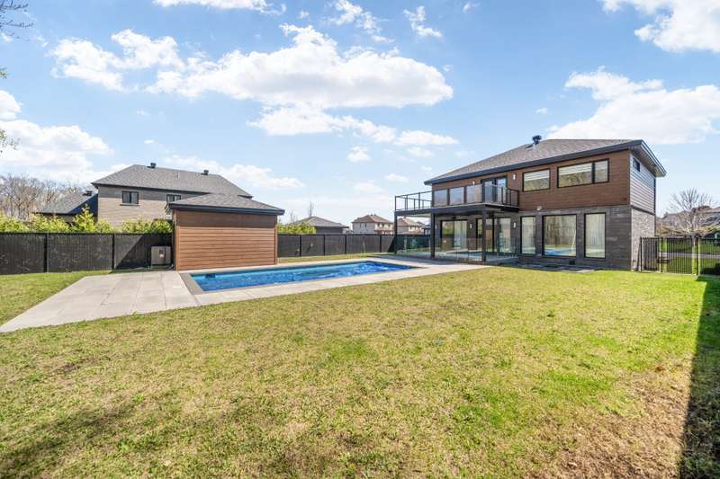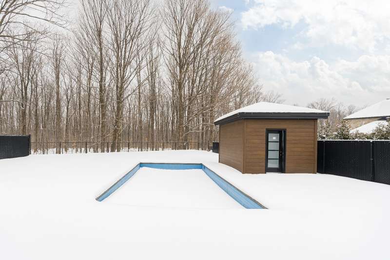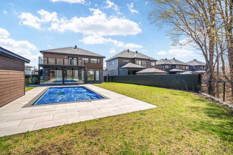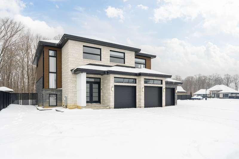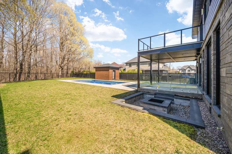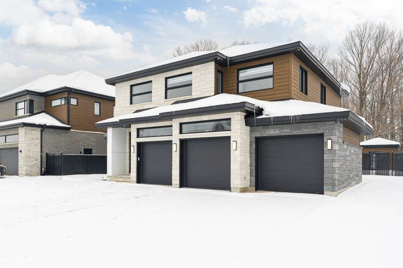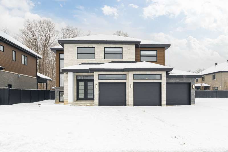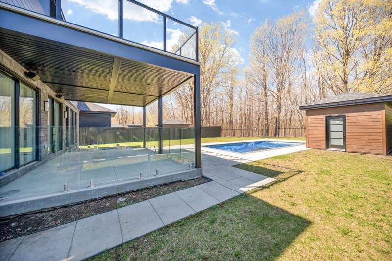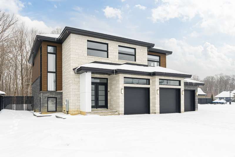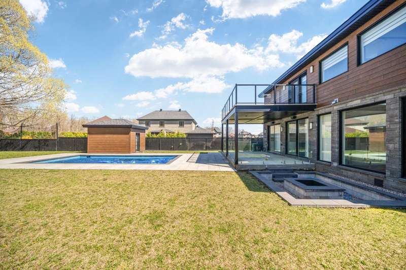 1092 Rue Bellevue in Ile-Bizard is a modern, elegant home completed in 2021 by Groupe Grilli Samuel. With custom features like oversized windows, engineered maple floors, and a locally sourced stone facade, it blends modern design with functionality. The open-plan layout includes a chef's kitchen, high-end finishes, and a striking porcelain slab fireplace. The private quarters offer four bedrooms, a luxurious ensuite, and a terrace. The lower level features a wine cellar, home theatre, and fitness room. Outdoors, a heated saltwater pool and pool house await. Smart home tech adds convenience throughout.