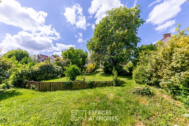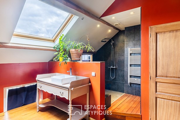 The ground floor is organized around a vast living room area, characterized by a majestic period fireplace and an exposed brick ceiling that gives a warm loft spirit that opens onto a spectacular veranda of nearly 30 sqm, with a metal frame and glass roof along its entire length. A warm kitchen in natural wood, a turquoise green wall and a convivial dining area with a view of the 'priest's' garden at the back create a perfect picture for living in harmony with light and nature.