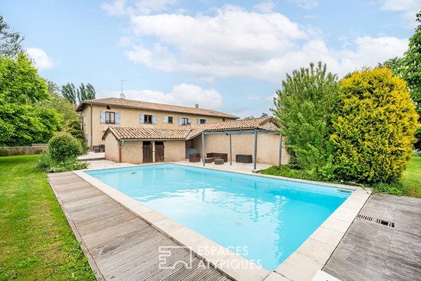À l'exterieur, le vaste jardin paysage, sans aucun vis-a-vis, profite d'une vue degagee sur les collines du Beaujolais. Une piscine agremente les beaux jours, tandis que plusieurs terrasses en pierre reconstituee invitent a la detente a chaque heure de la journee. De nombreuses dependances, atelier, garage et espaces de rangement completent ce bien.
