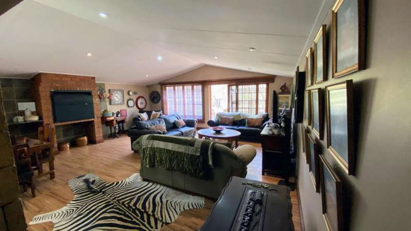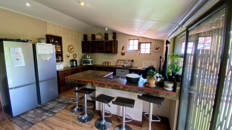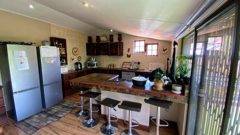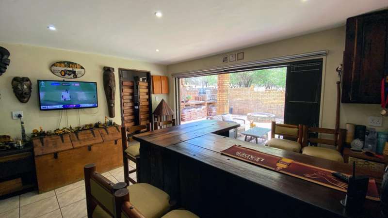 The heart of this home is its kitchen, adorned with ranch/sleeper wood cabinets, and complemented by a balcony overlooking the inviting swimming pool. The kitchen seamlessly blends into the open-plan family and dining room, complete with an in-house braai area. The entire house exudes a bushveld relaxed atmosphere, enhanced by the carefully crafted wooden finishes.
