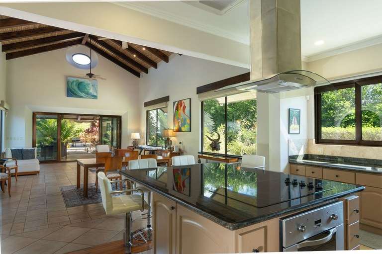 Discover the epitome of Costa Rican luxury at this stunning ranch-style home, nestled within the prestigious Las Brisas community in Hacienda Pinilla. It is perfectly designed to host up to 12 guests. This luxurious home has 5 bedrooms and 6 1/2 baths, an office, TV room, solar panels that cut the electrical bill in half, a two-car spacious garage with storage closets, an electric vehicle (EV) outlet, and an extended driveway with parking space for multiple vehicles, an outdoor shower, state of the art monitored security system, and an expansive outdoor backyard space.