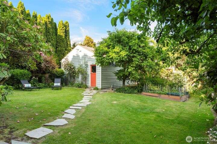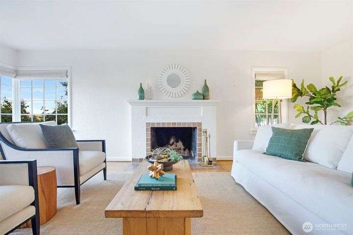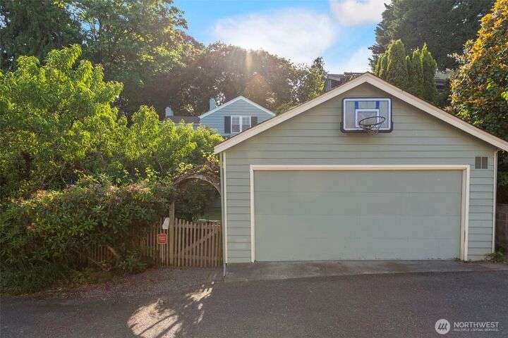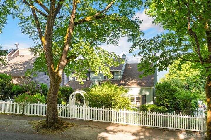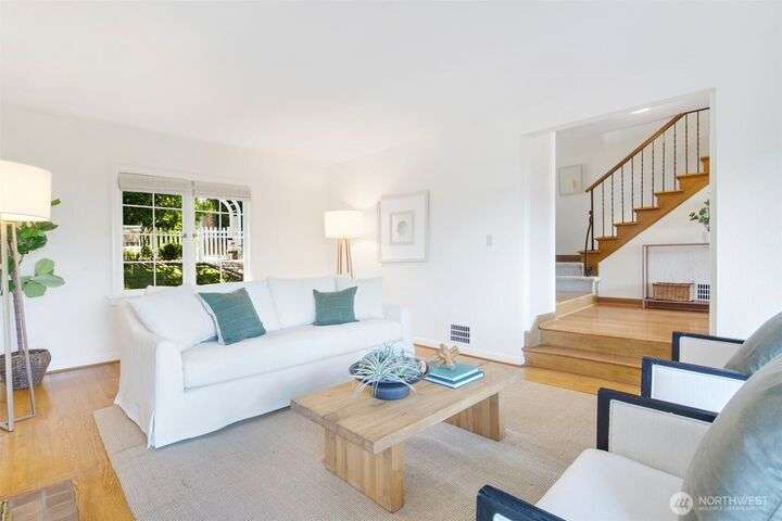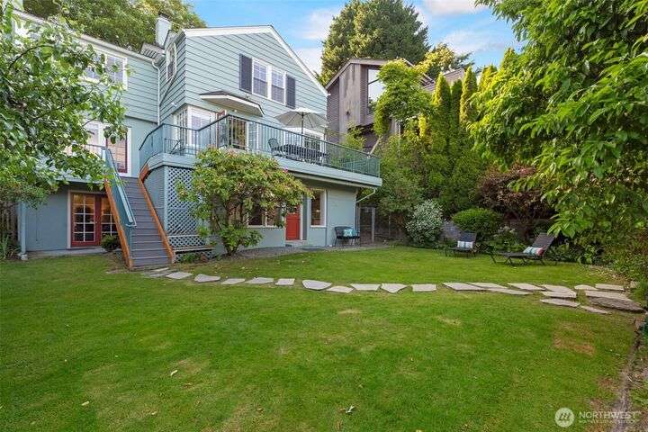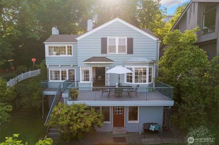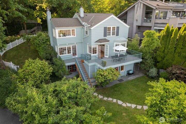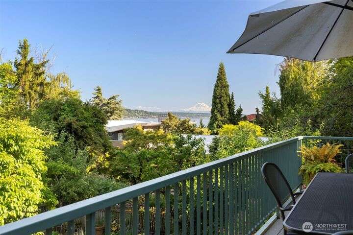 Perched in a coveted Denny Blaine enclave, this timeless residence offers refined living, adaptable spaces, and views of Lake Washington and Mt. Rainier. The main level features a gracious living room, formal dining area, well-appointed kitchen, powder room, and bedroom or home office. Upstairs, two bedrooms, a full bath, and a sunlit bonus room are nestled among the treetops. The lower level expands the living options with a fourth bedroom, ¾ bath, a versatile flex space ideal for a gym or guest suite, plus a media room, storage, and laundry. An expansive deck invites quiet mornings or effortless entertaining. Lush grounds with fruit trees, garden beds, and a two-car garage complete this serene and private setting.